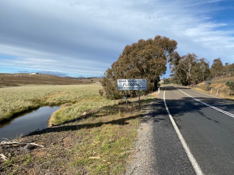 At the end of Glenrock Road, Cavan Road is better maintained and more regularly travelled. There is a faded No Through Road sign, but the route continues in a similar vein – crossing farmland with some short steep descents and ascents as the road heads towards the Murrumbidgee. At the intersection with Esdale Road there is a clear No Through Road sign on that road, but no such sign on the Murrumbidgee River crossing. This is where the online mapping tools seem to think it is not possible to continue, but there are no signs or gates to stop or discourage you from doing so.
