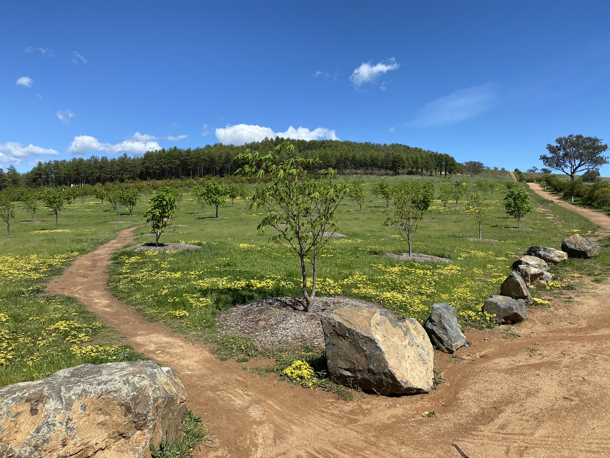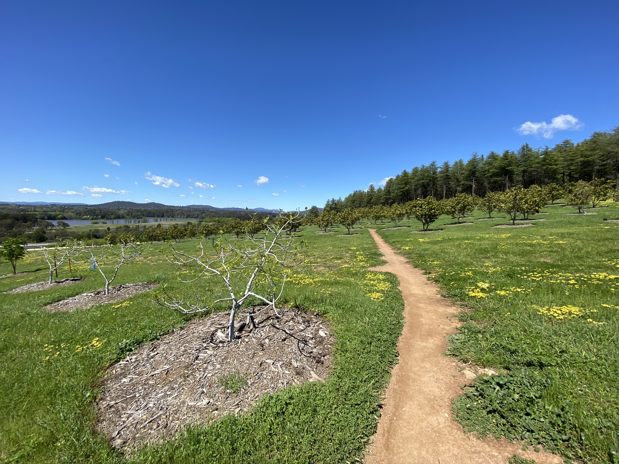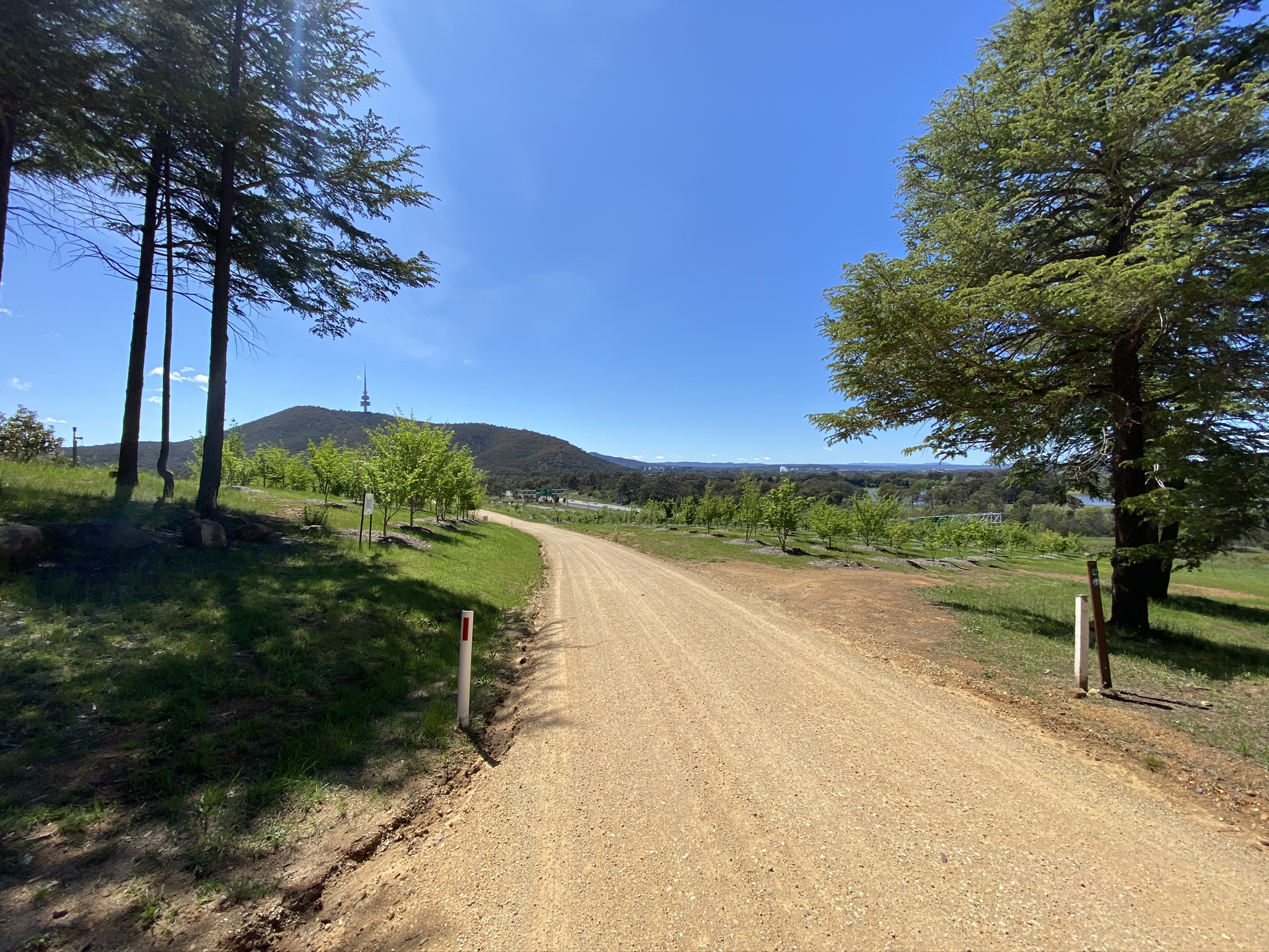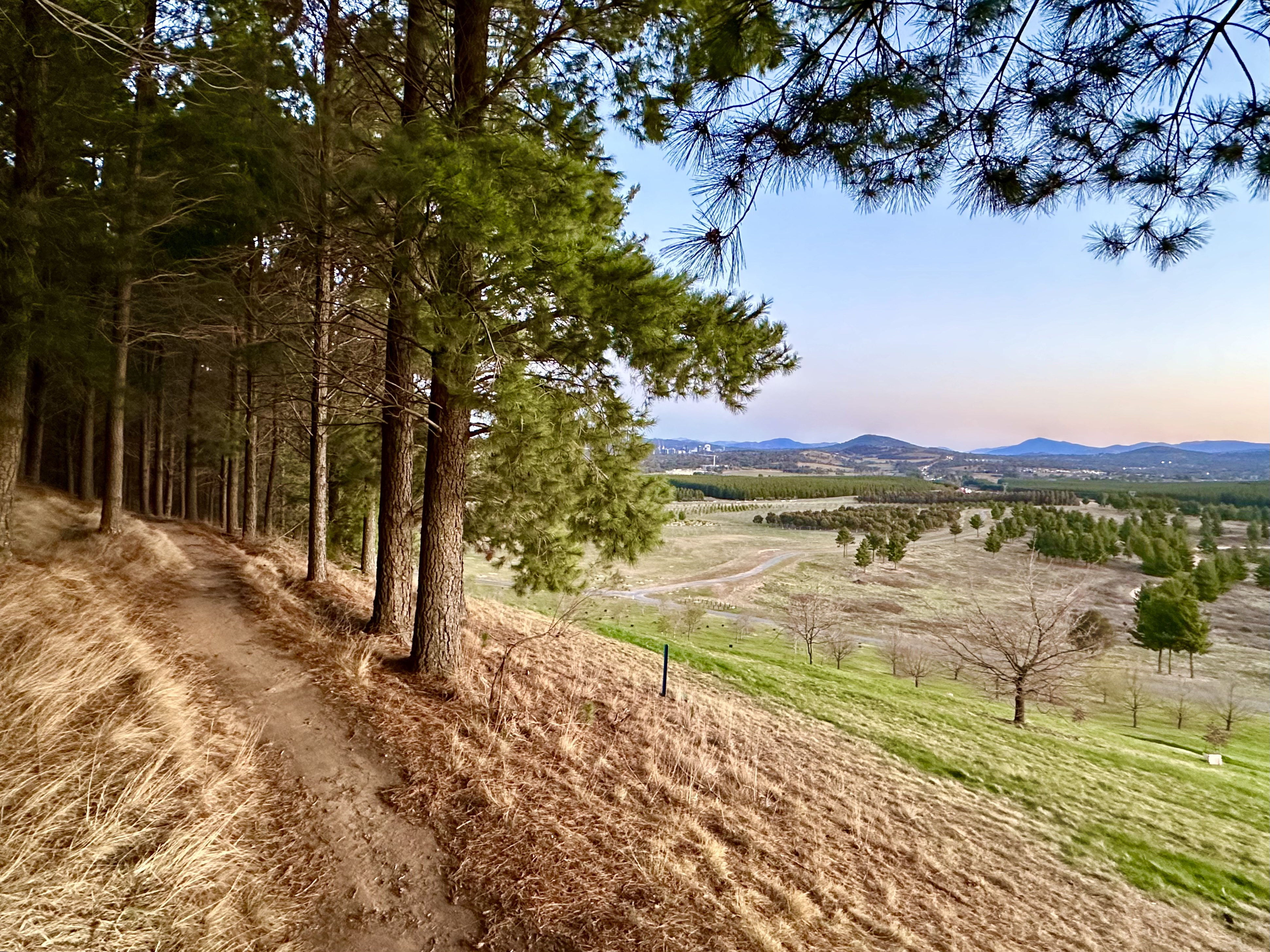I confess to not being much of a botanist, but the arboretum has taught me about trees I’d never heard of but now really like. As you wrap around Dairy Farmers Hill one of my favourites is the Mediterranean Red Bud. Its beautiful colours in these photos provide a strong case for visiting in spring. Other spring highlights include the Chinese Mahogany. Once around the circumference of Dairy Farmers, the route uses Forest Drive to return to the northern end of Mountain View track and start on the lower part of the trail. This part of the trail provides clear views of Mount Stromlo and the Molonglo valley, before heading back through the Radiata Pines – trees that covered the arboretum until Canberra’s 2003 bushfires.
