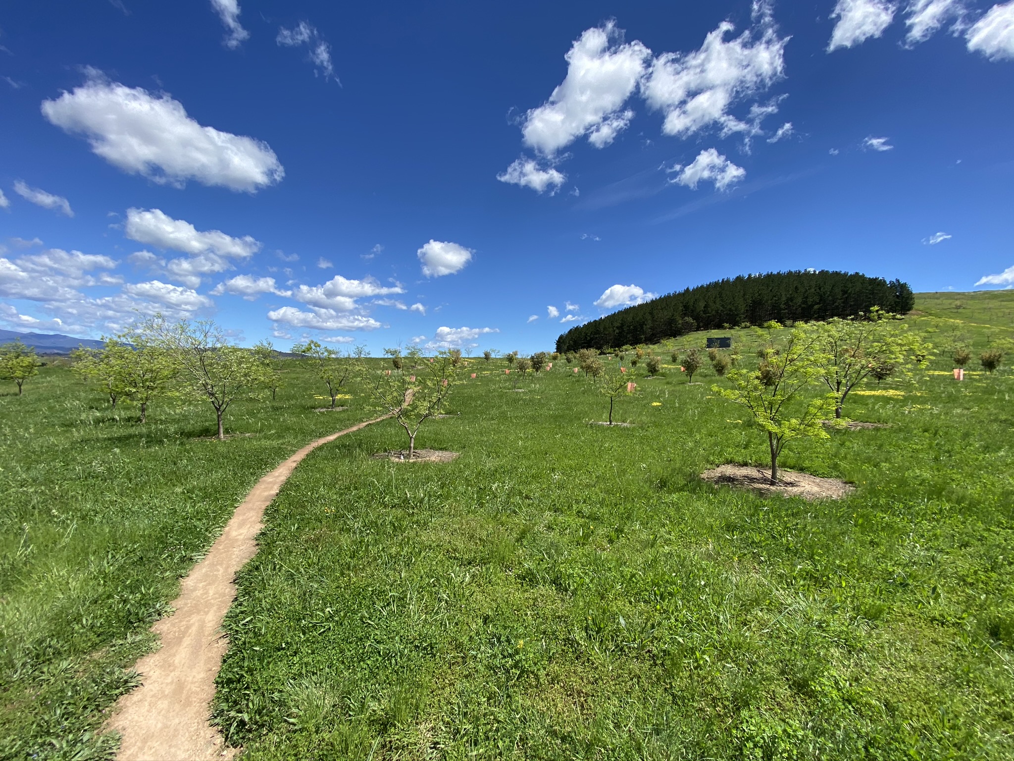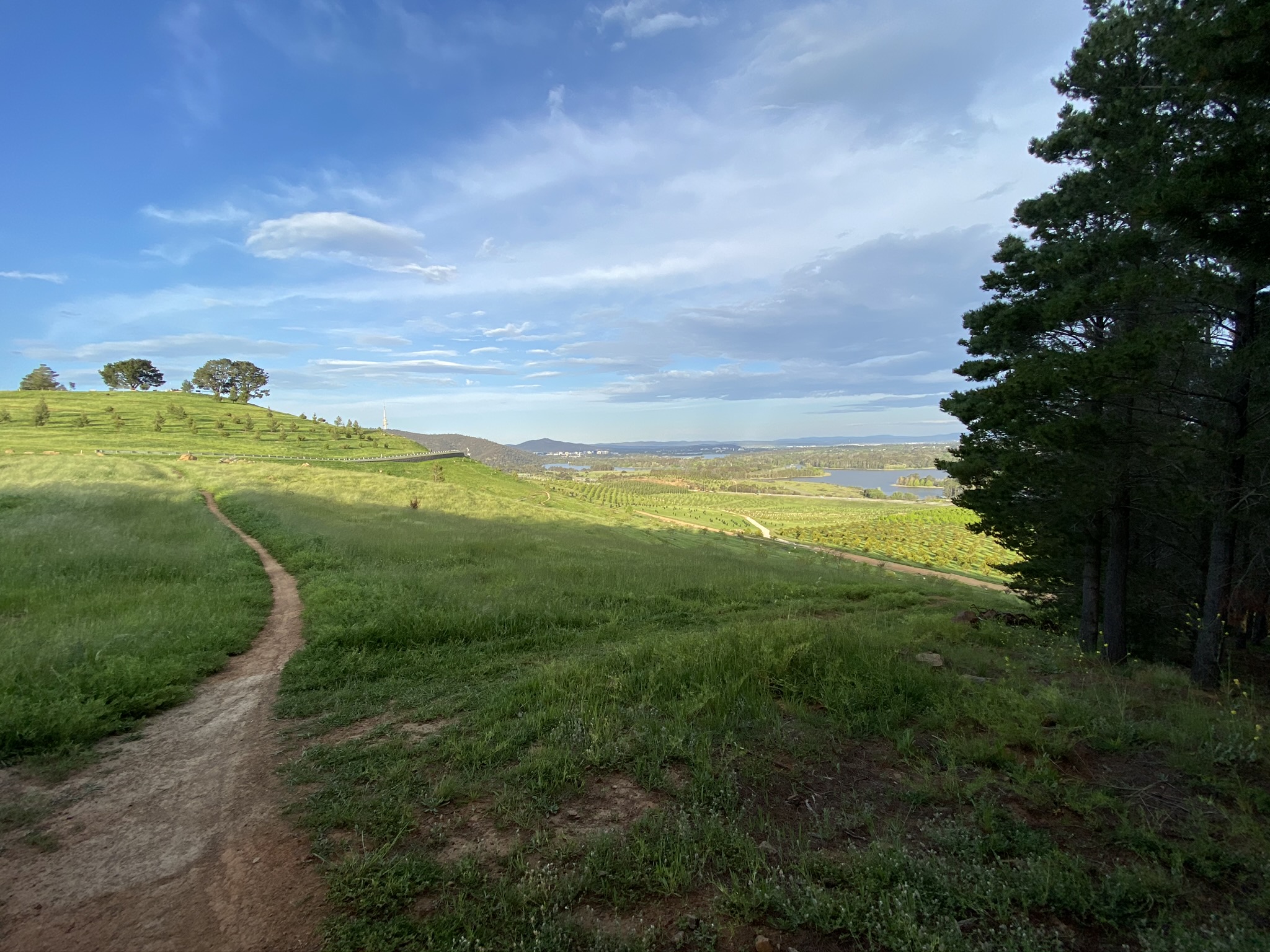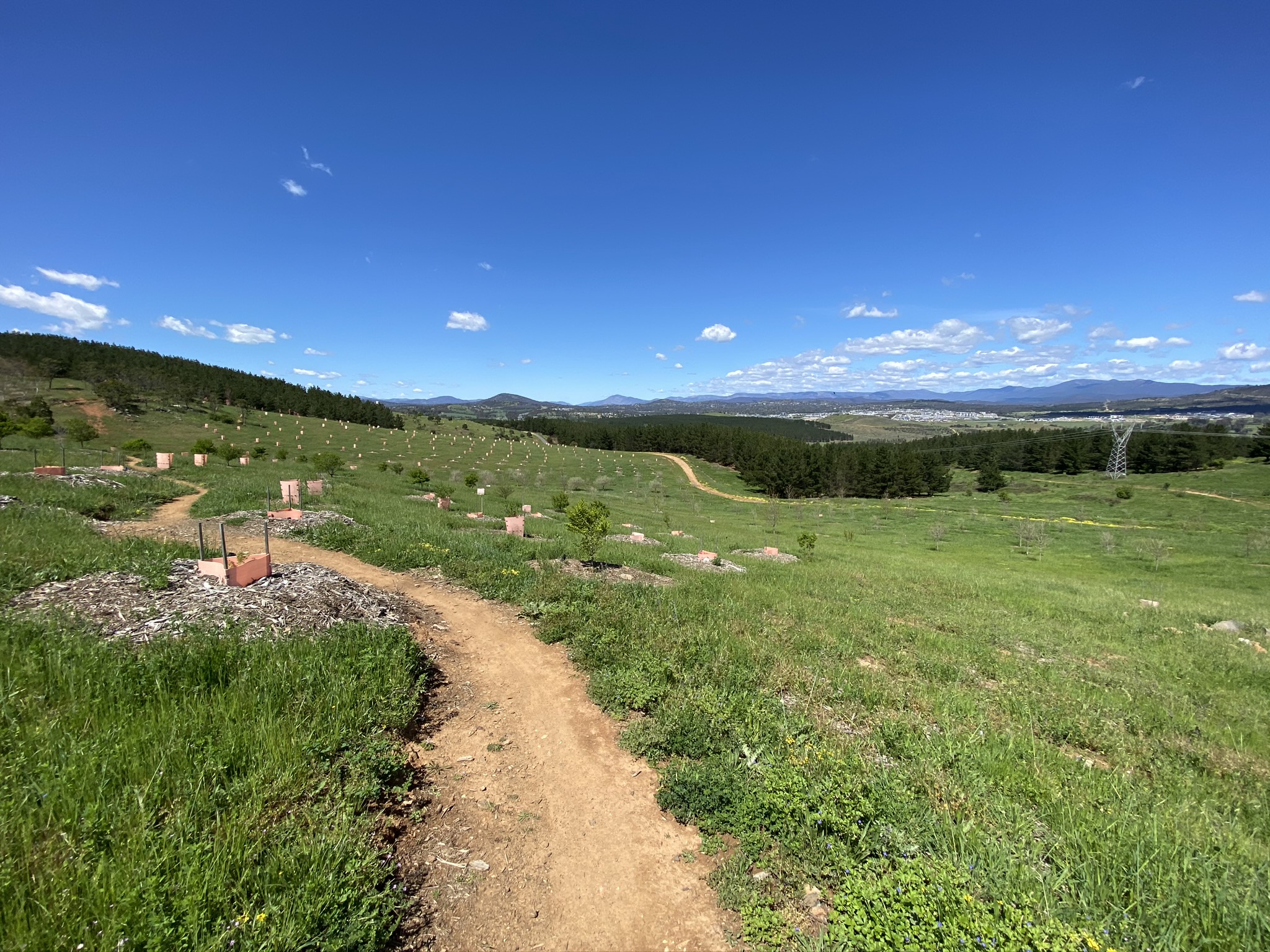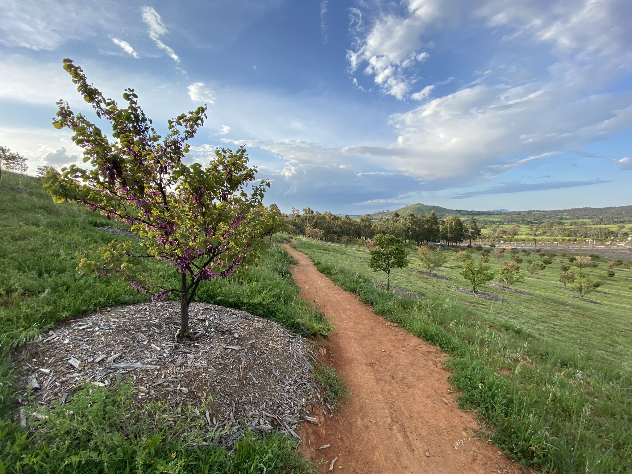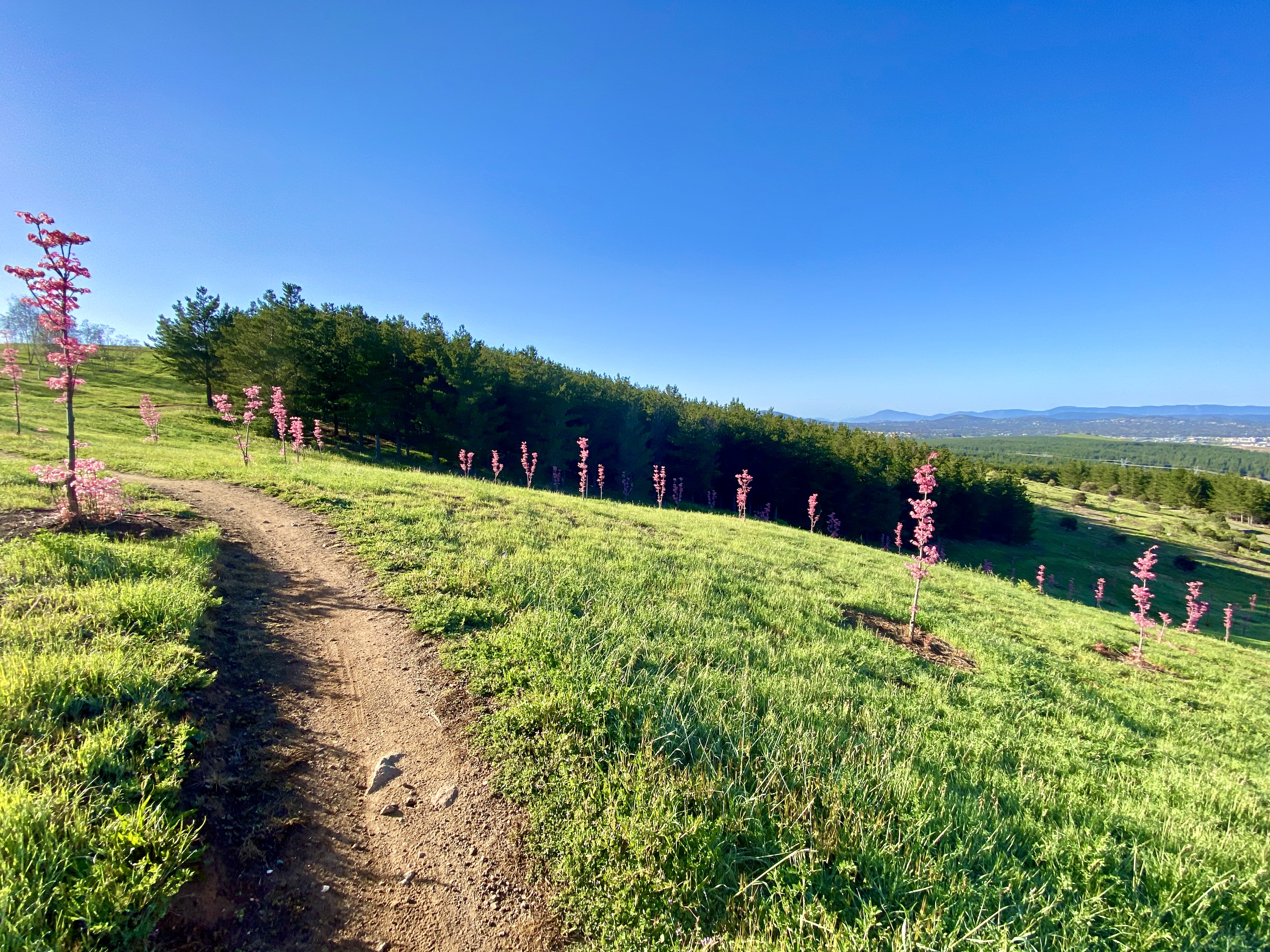 I confess to not being much of a botanist, but the arboretum has taught me about trees I’d never heard of but now really like. As you wrap around Dairy Farmers Hill one of my favourites is the Mediterranean Red Bud. Its beautiful colours in these photos provide a strong case for visiting in spring. Other spring highlights include the Chinese Mahogany. Once around the circumference of Dairy Farmers, the route uses Forest Drive to return to the northern end of Mountain View track and start on the lower part of the trail. This part of the trail provides clear views of Mount Stromlo and the Molonglo valley, before heading back through the Radiata Pines – trees that covered the arboretum until Canberra’s 2003 bushfires.