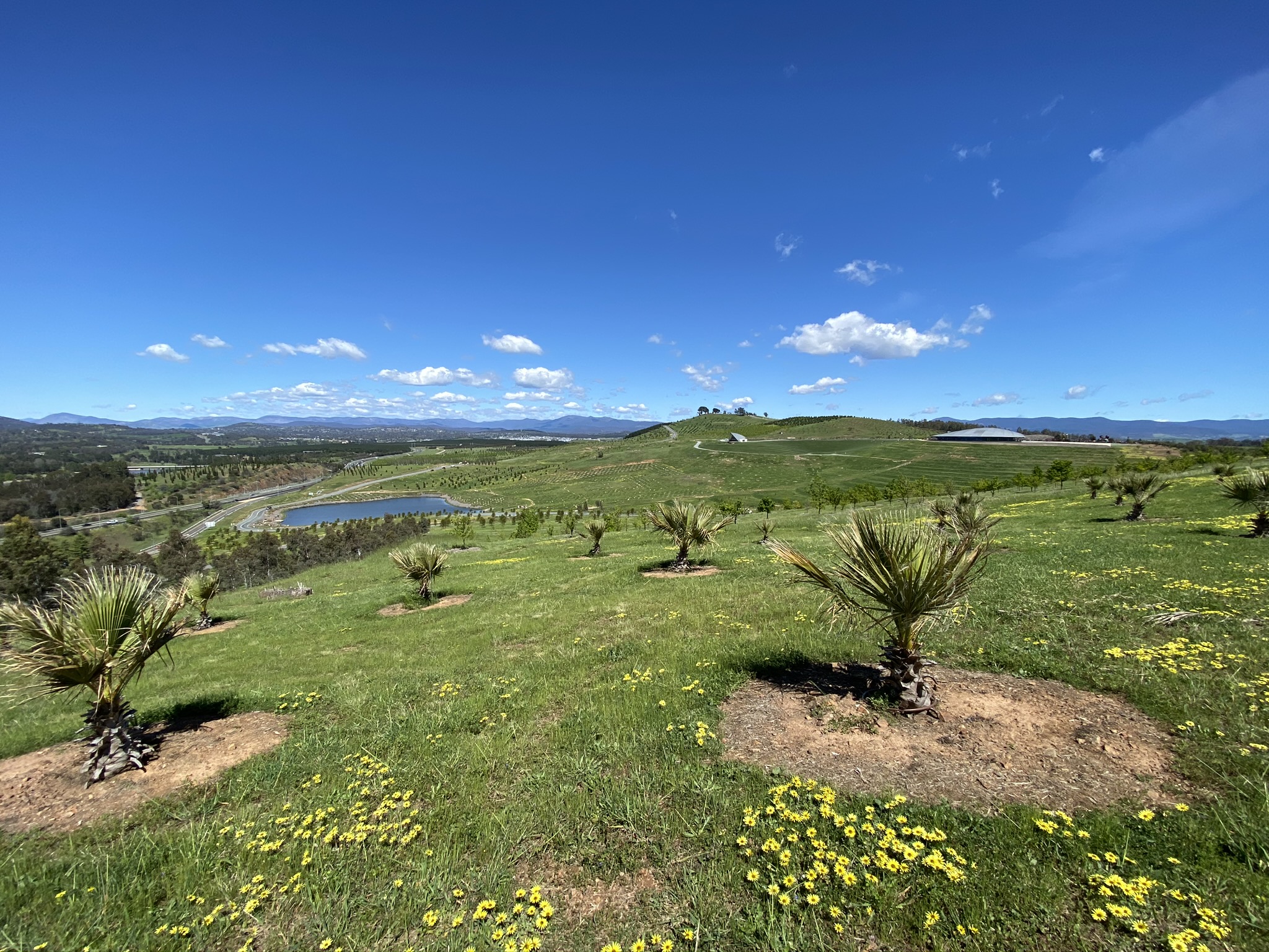 Joining the Himalayan Cedar Track at the edge of the forest, the route then heads past a barbeque area below a car park and the Wide Brown Land sculpture. One of the best views of the arboretum is from this track, amongst the California Fan Palms (these are going to be epic fully grown). If you want to check out the sculpture, it is possible to head up the hill just as the track approaches Himalayan Cedar Road.