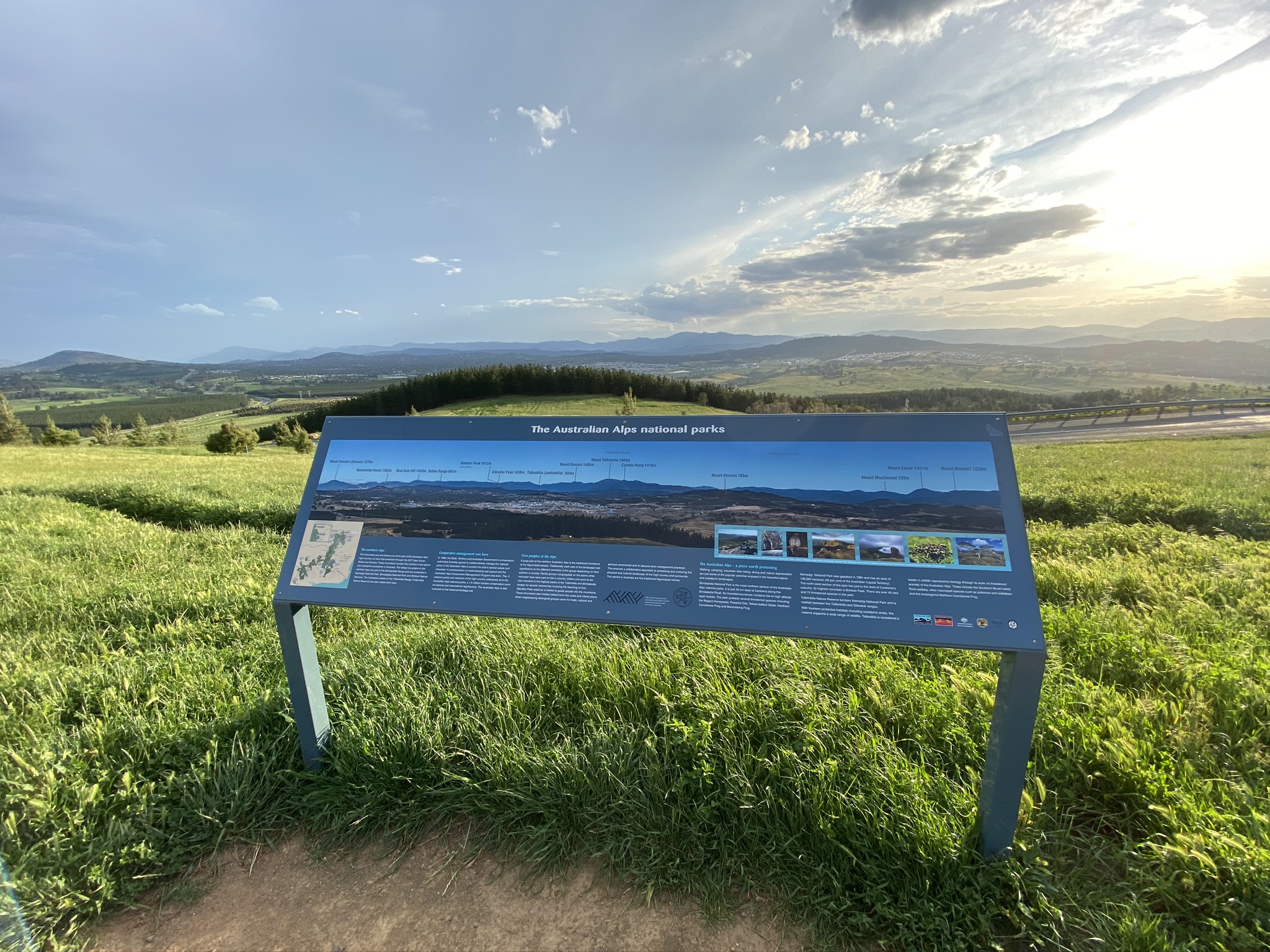 This CyclingGravel route gradually works from the upper levels of the arboretum to the lower ones. Mountain View track is used twice, starting at the upper end and using an unnamed track to then connect with the Dairy Farmers Hill track. The views are spectacular, combined with a beautiful tree-lined trail. Also on Dairy Farmers Hill a sign provides detail on the Australian Alp views to the southwest, a scene that in winter often includes snow-tipped peaks.