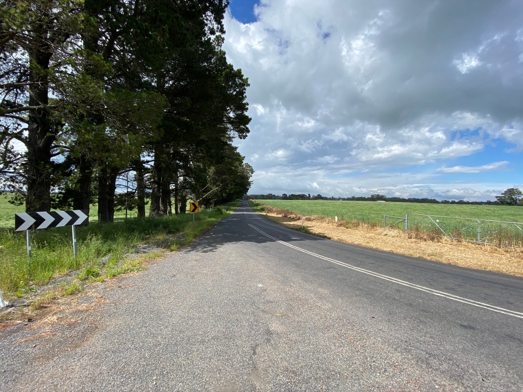 Instead of heading past the airport on the outward trip, a quick gravel detour is available via Ginns Road. You don’t need a serious gravel bike to take this road, and the views and scenes are worth it.