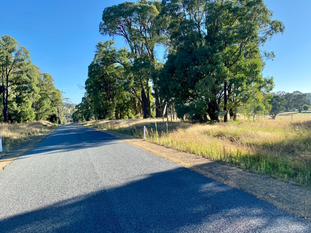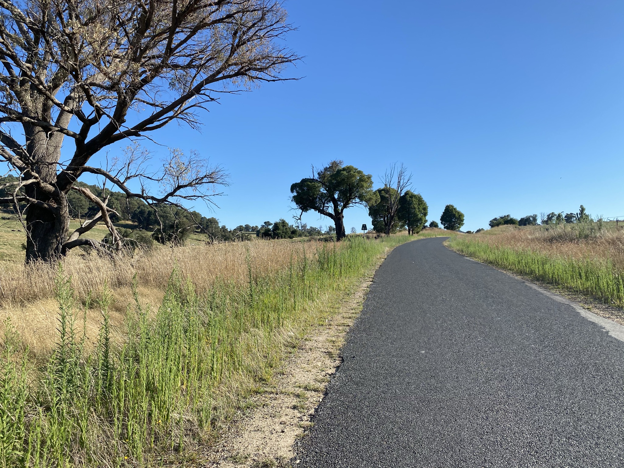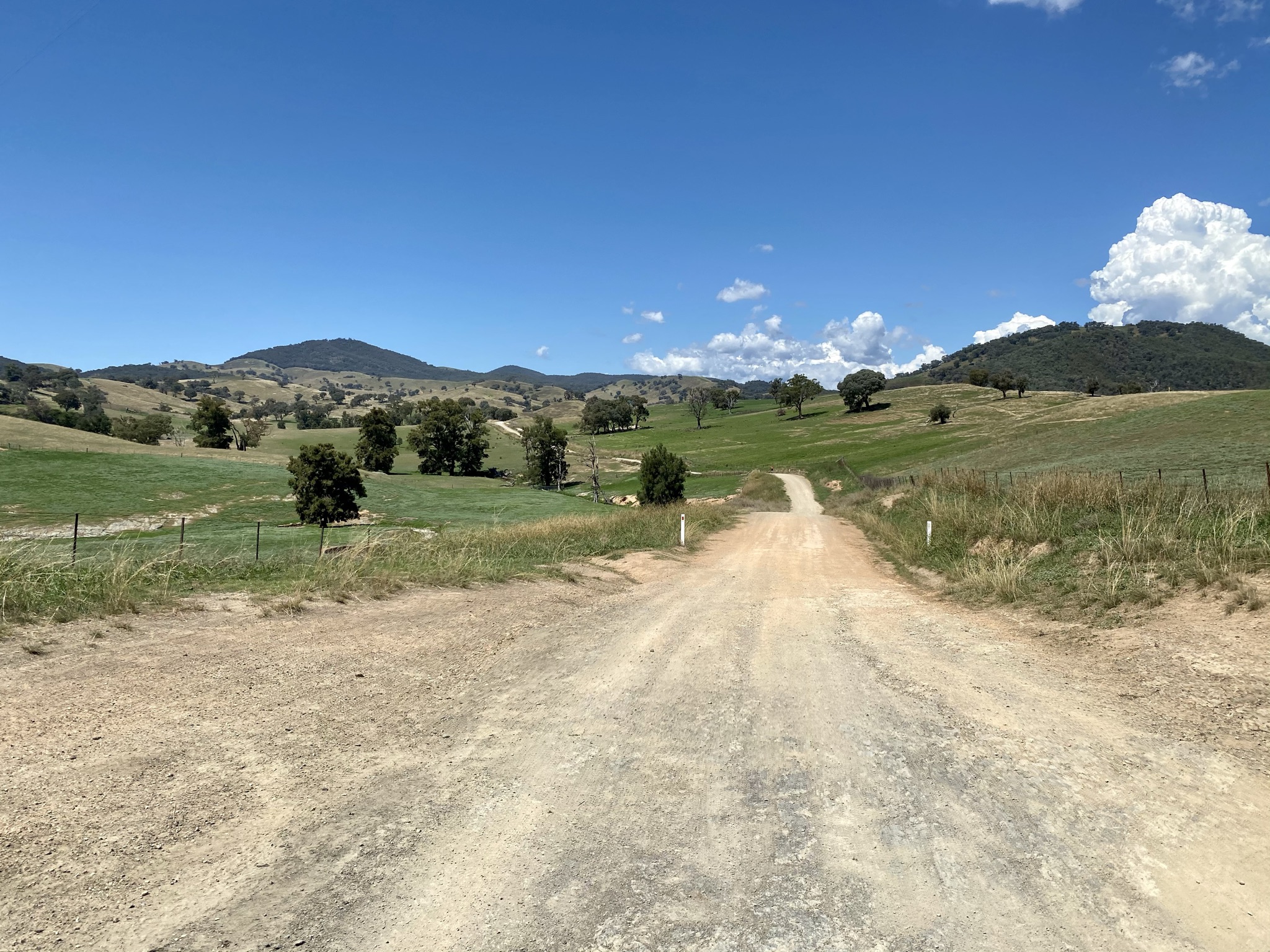 At the top of the climb, the gravel starts, and the road between here and Billapaloola Road is in really good condition. Undulating between farms and with infrequent traffic, the route provides some tremendous scenery as well as modestly sloped climbs. Overall this provides something quite different to the pine forests passed on Brindabella Road.