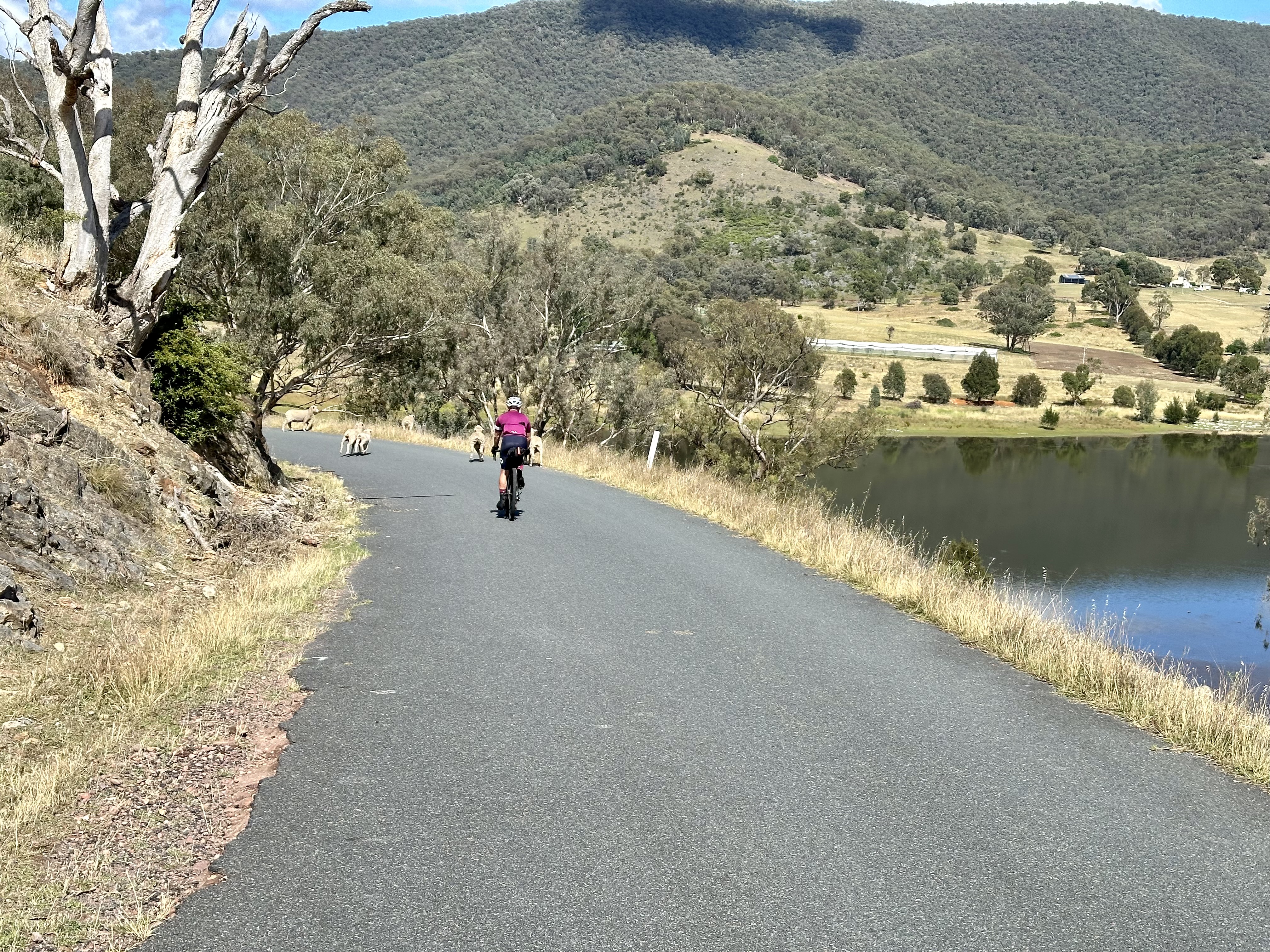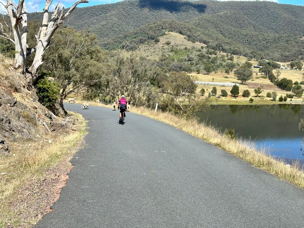 - Traffic. Both routes have limited traffic, but probably the most is on the Brindabella route. Between Canberra and Wee Jasper there is farm and commuter traffic, but this very modest and the road is sealed. Frankly the most traffic on the Wee Jasper route is sheep and cattle on the road. The most challenging part with vehicles is between Uriarra and Brindabella as this is often 4WDs that create a lot of dust. It is also not fun to have traffic pass on the bluestone gravel near Micalong State Forest as this can force you into the dodgier tracks.