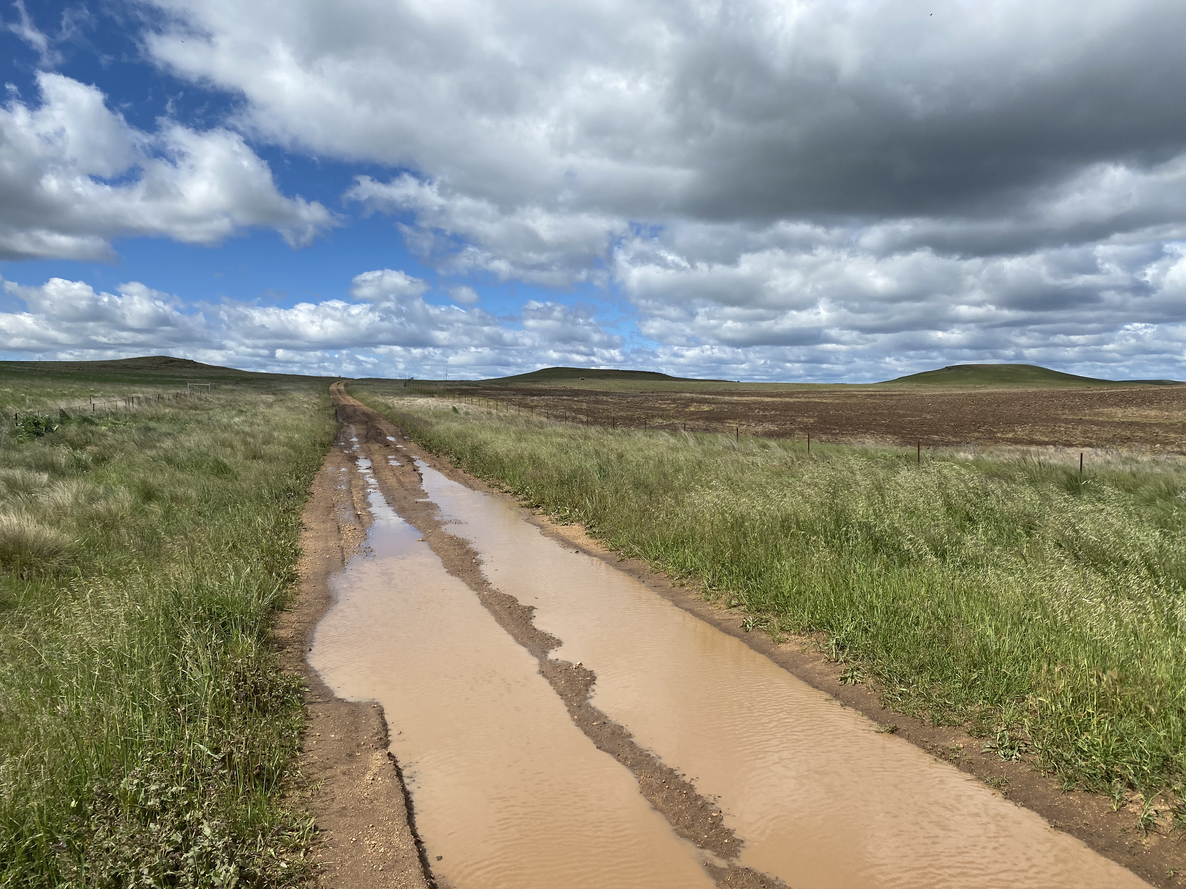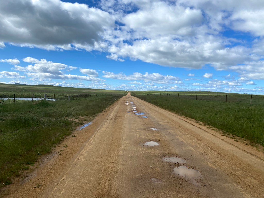 What follows is a decent climb to a kind of a plateau – offering big sky views before a stunning descent into more farmland. Around this point it becomes clear that the road, whilst public, is travelling within paddocks of farming properties. This means the road suffers a little from livestock traffic, there are some cattle grids to cross, and there is the occasional farm ‘resident’ who may not be keen to move out of your way.
