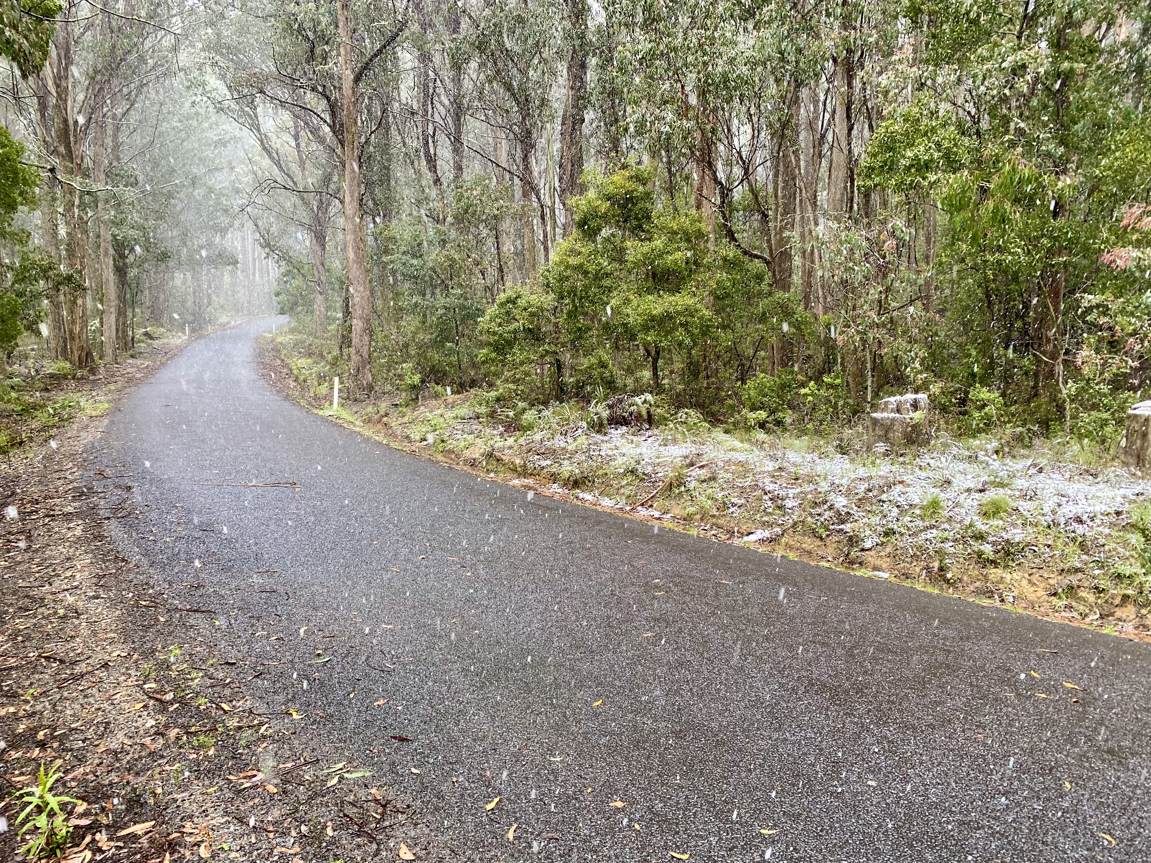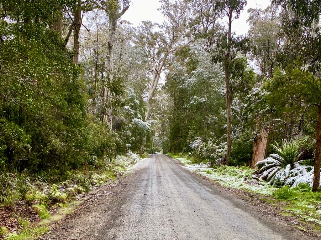 El Nina brought rain and it also brought November snow. Whilst this made for damp and cold cycling, it didn’t stop the opportunity to experience some beautiful scenery. The Bendoc-Orbost Road offers a short-cut from the main road option from Delegate (Delegate Road to Bonang Road) and also has some wonderful gravel – here enhanced by snow.