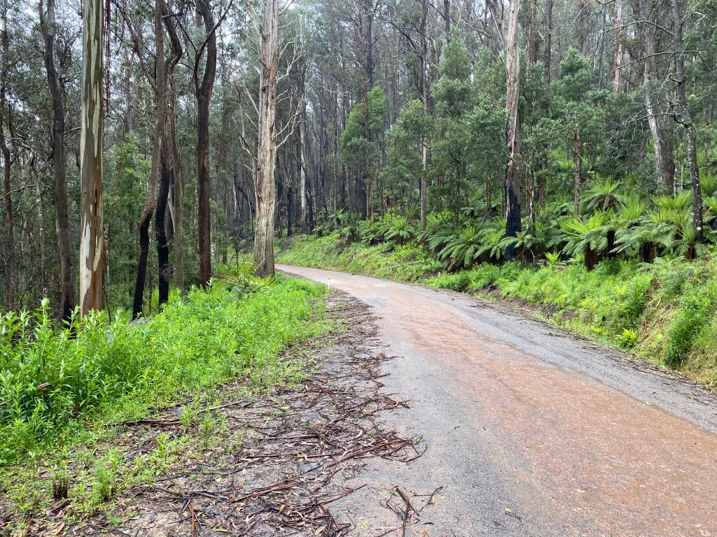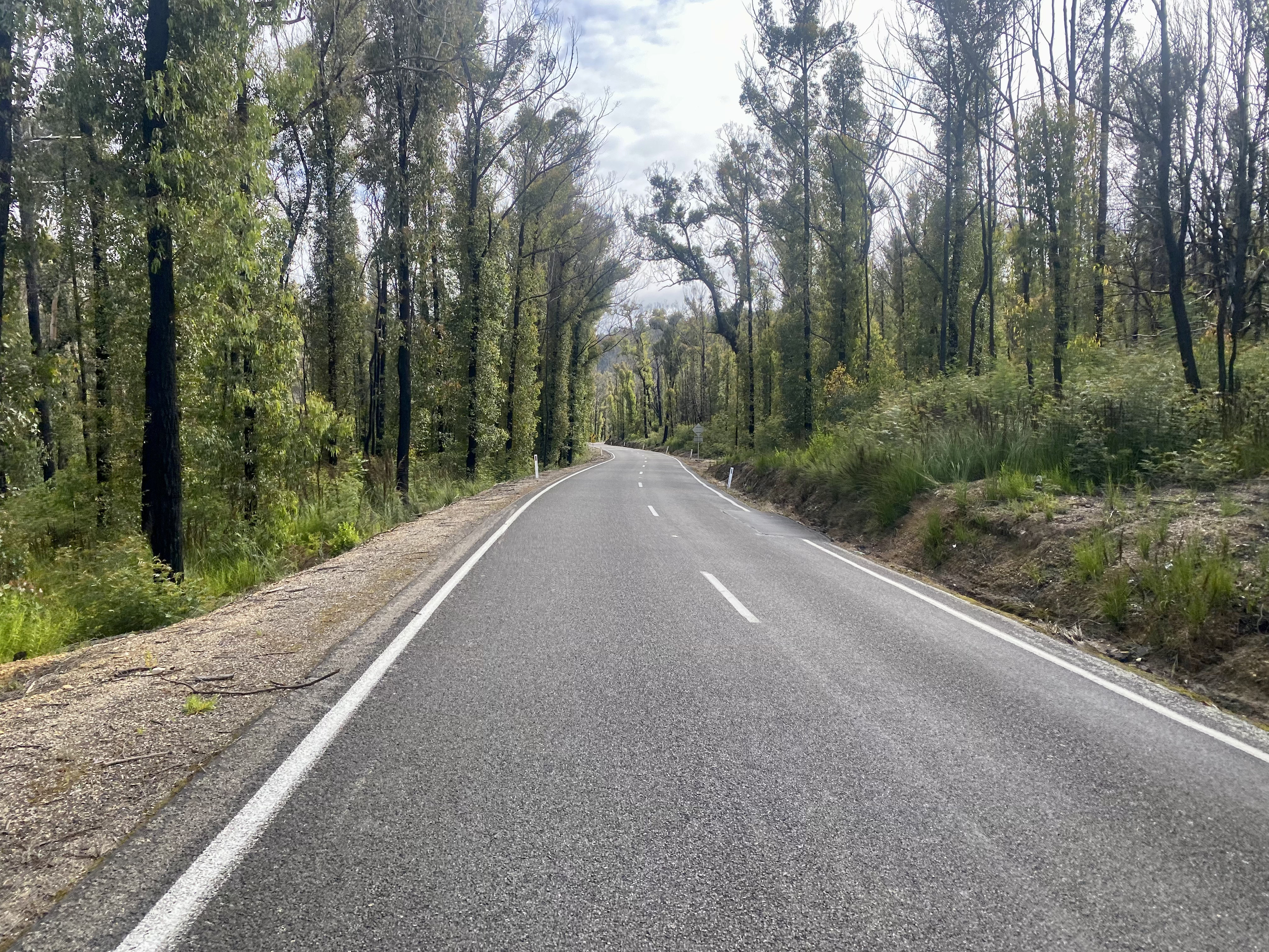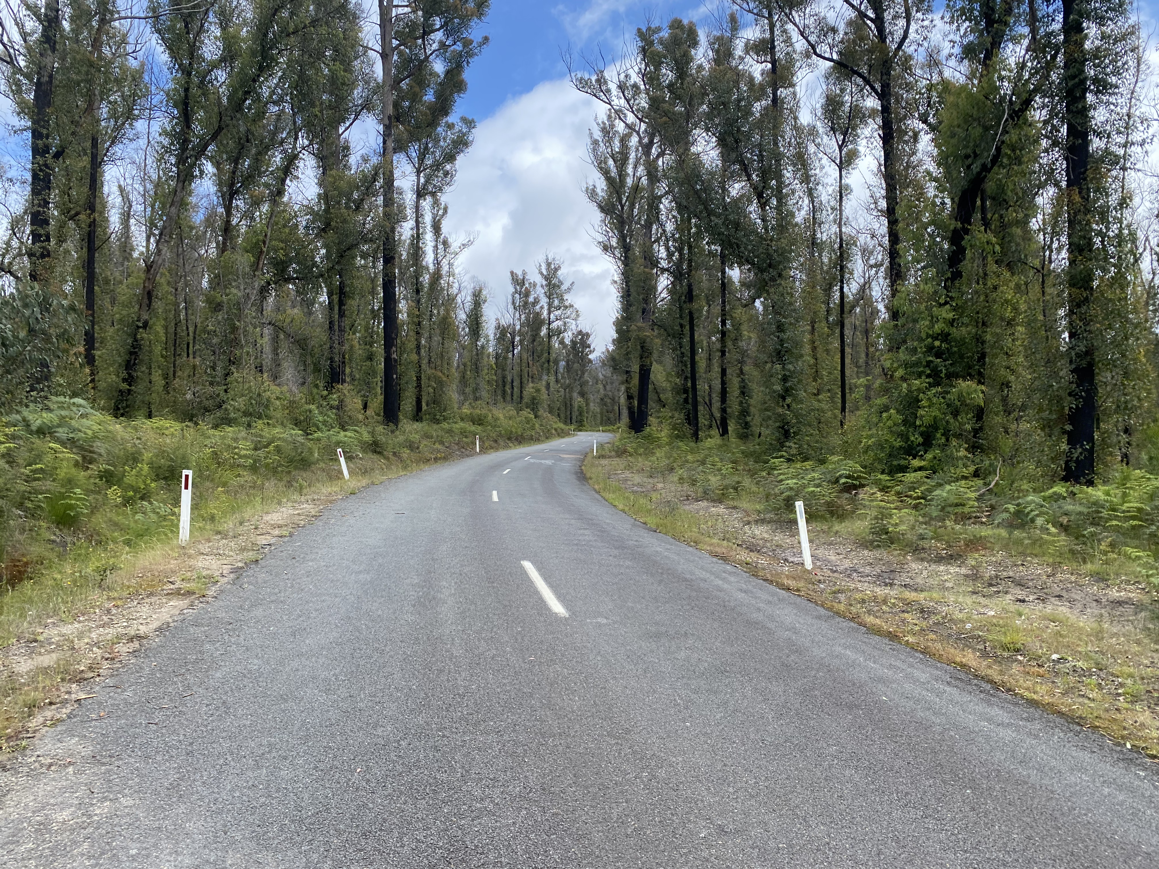 Initially gentle, Orbost-Bendoc Road (and the subsequent connection to Bonang Road) progresses to a not-too-steep but rapid descent that needs to be carefully managed in the wet. I would love to do this in the dry as on this trip it was quite cold and also slippery. Heading into the ride I had an expectation that Bonang Road would be a long gravel ride but this proved not to be the case: sealed and with limited traffic after the descent, the road provides forest scenery with river glimpses as you work your way to Orbost.