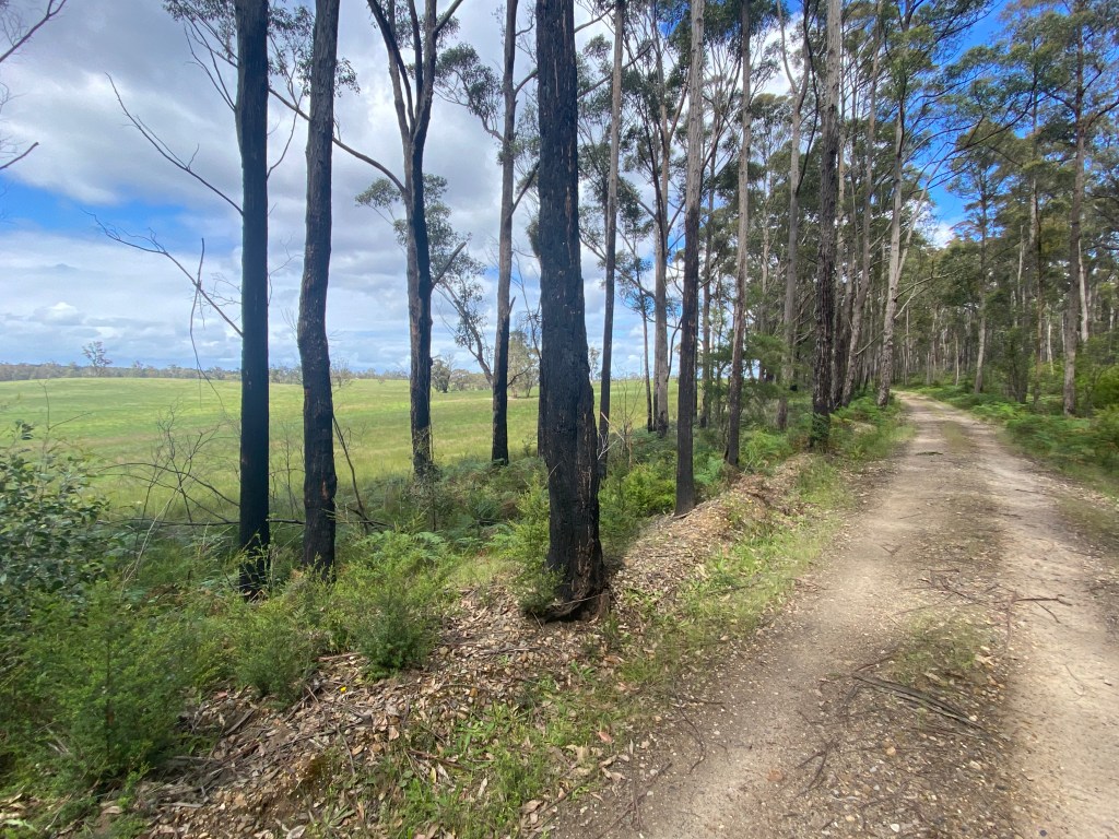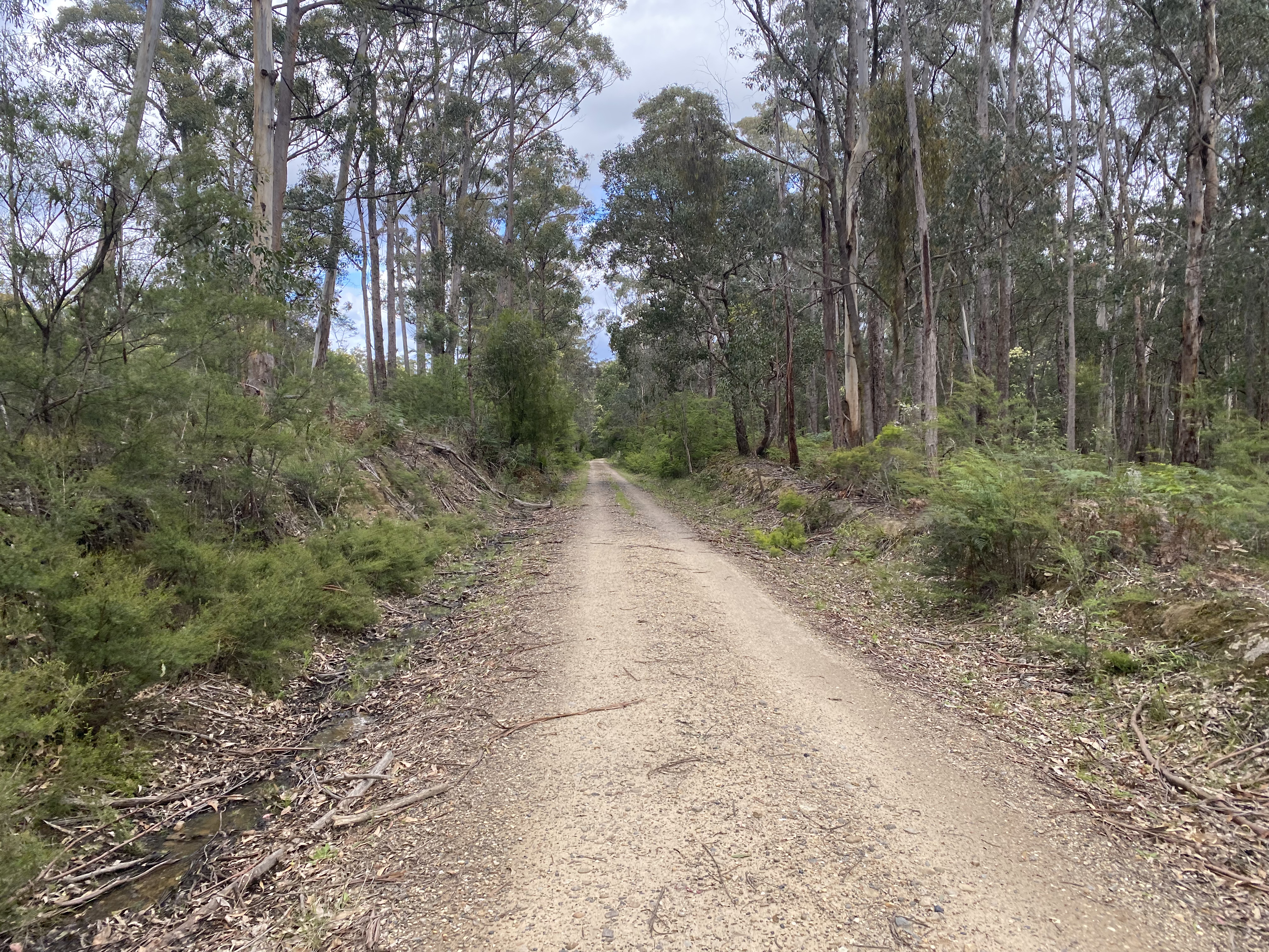 Heading up from the river valley the surface improves a lot – at worst resembling a good quality fire trail. Depending on recent weather you can expect the occasional fallen tree and sometimes washout ruts. Overall though the trail’s surface is pretty good and even sometimes has overlay that is a step above – a small bit near Orbost and very high quality on approach to Bairnsdale. The worst part of the trail that I experienced was to the west of Bruthen – narrower than the photos below, rougher and muddy in parts. Having said that, it is there that some interesting farmland views are on offer. The Orbost to Tostaree stretch is, by contrast, probably the least exciting part of the trail for scenery: here are long stretches of forest views with farm vistas occasionally on offer.