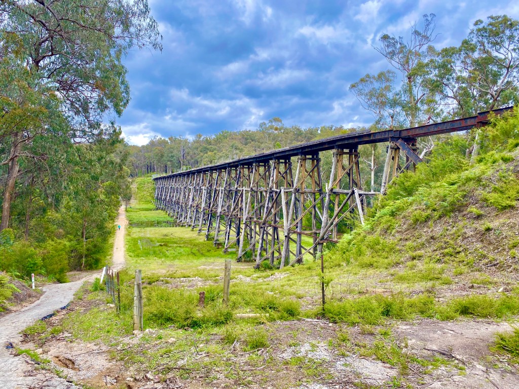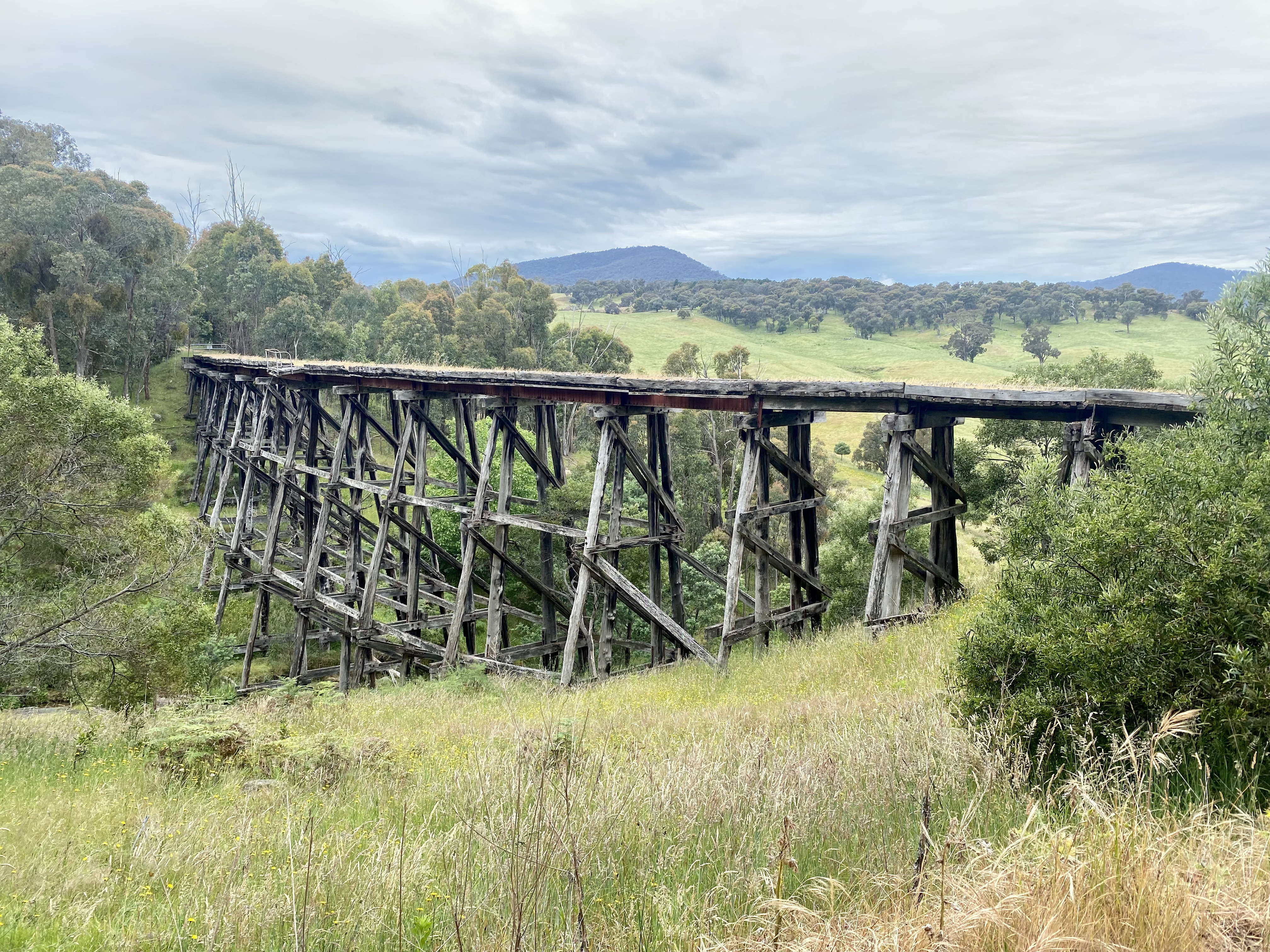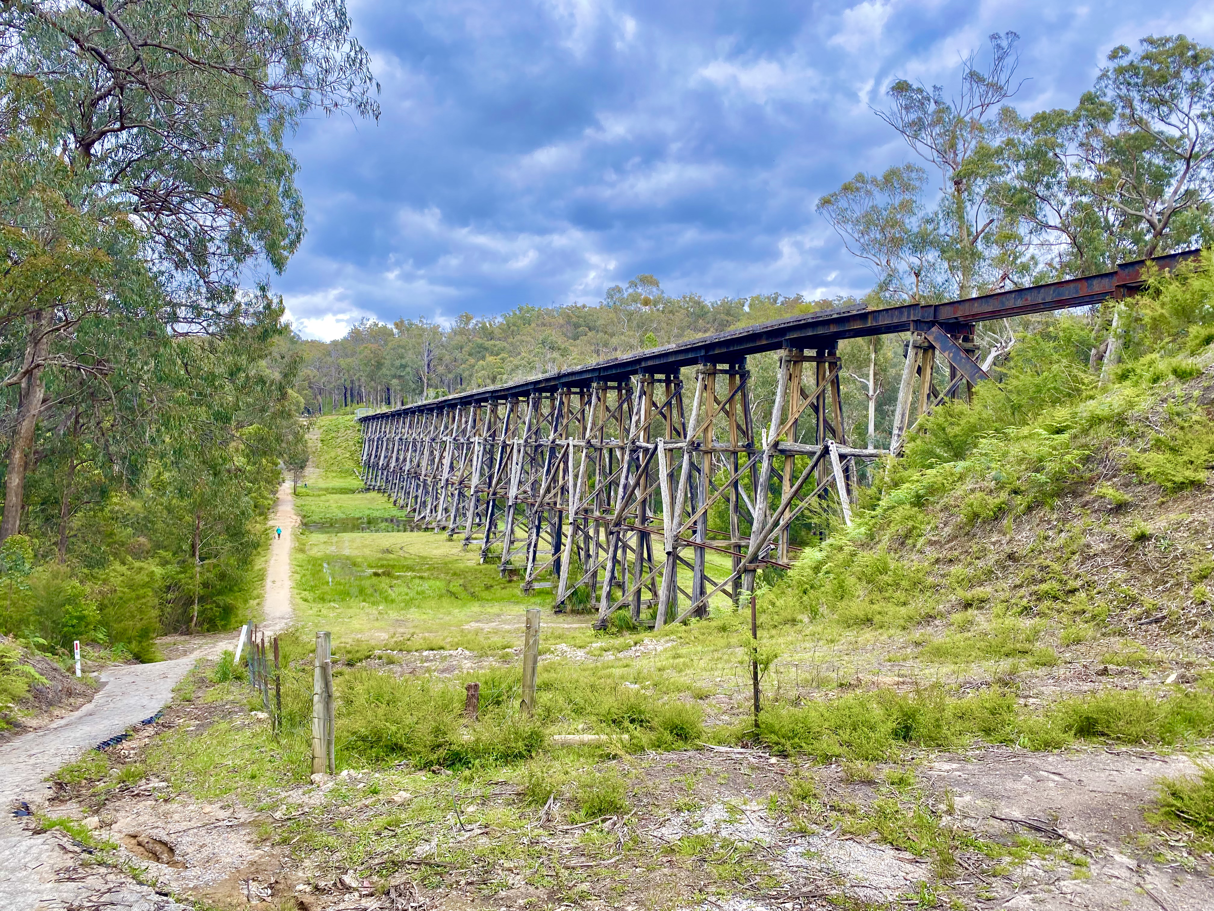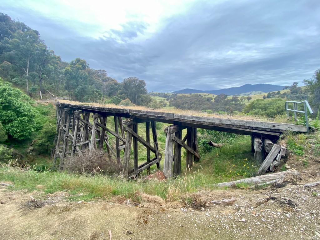 One of the great aspects of some Victorian rail trails is the trestle bridges – there is something about the wooden engineering that makes them quite endearing. Part of their charm is that they often coincide with a valley, leading to views. What is sometimes less fun is the way in which a rail trail copes with the diversion. Occasionally high quality trail or even replacement bridges are put in place. More commonly (and in most cases on this trail) there are lower quality detour tracks. Not a major issue, but in poorer weather may require a short hike-a-bike.
