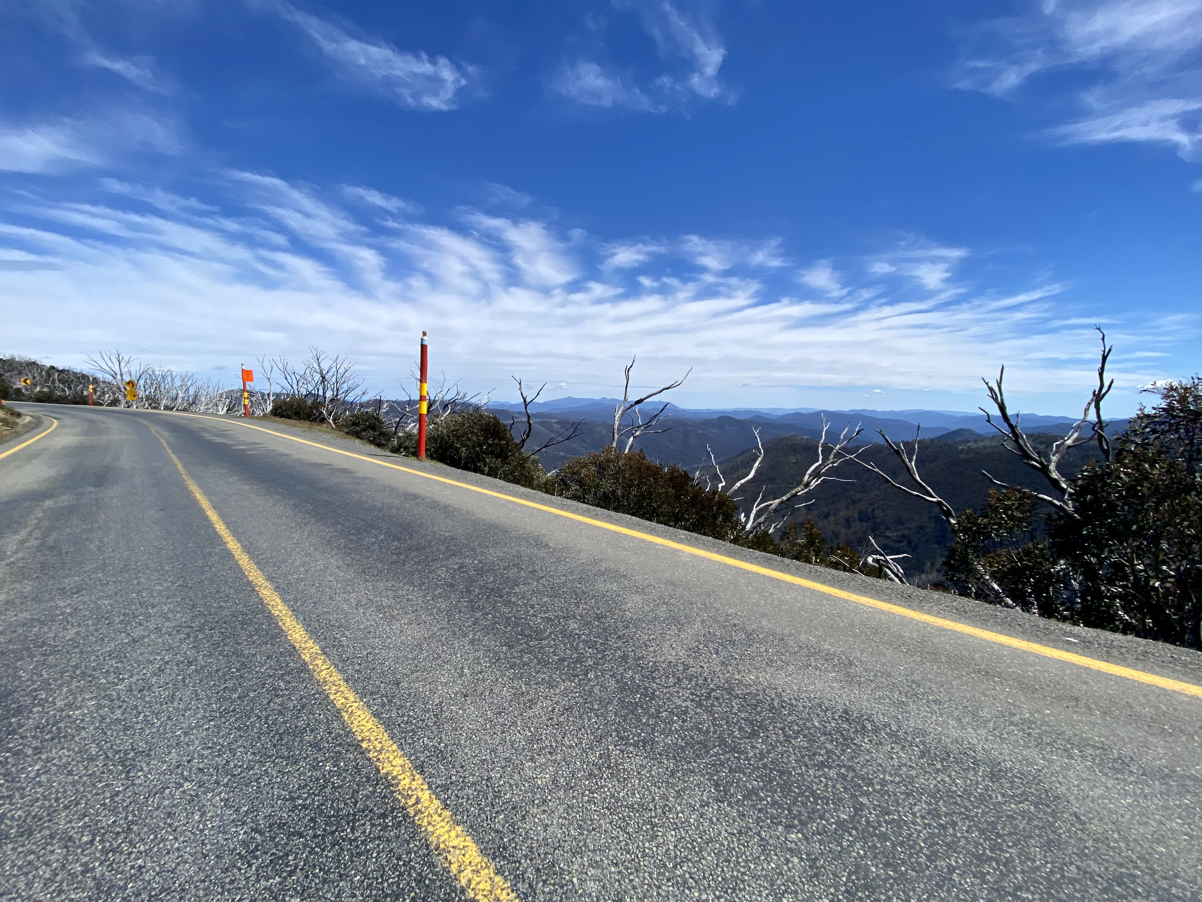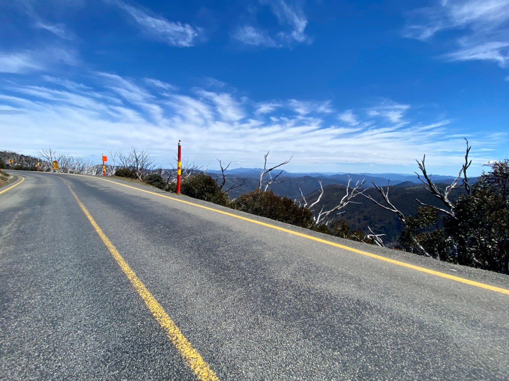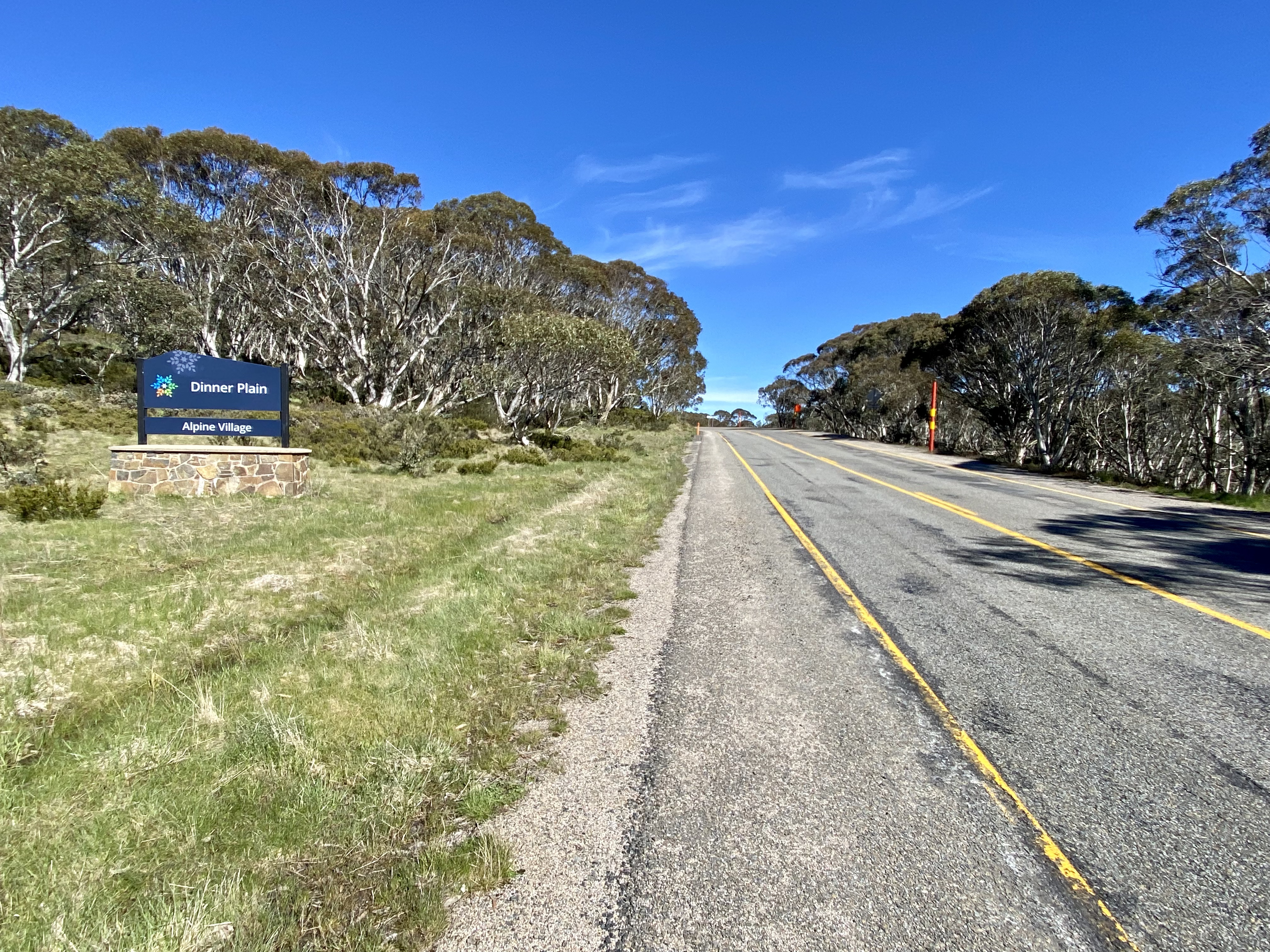 Dinner Plain is a recommended place to stop – out of ski season there seemed to be limited options at Hotham itself (ie one, a couple of kilometres from the summit), whereas at Dinner Plain there are good bathrooms, water refill taps and a cafe. The views as you depart and continue to Hotham are also excellent.