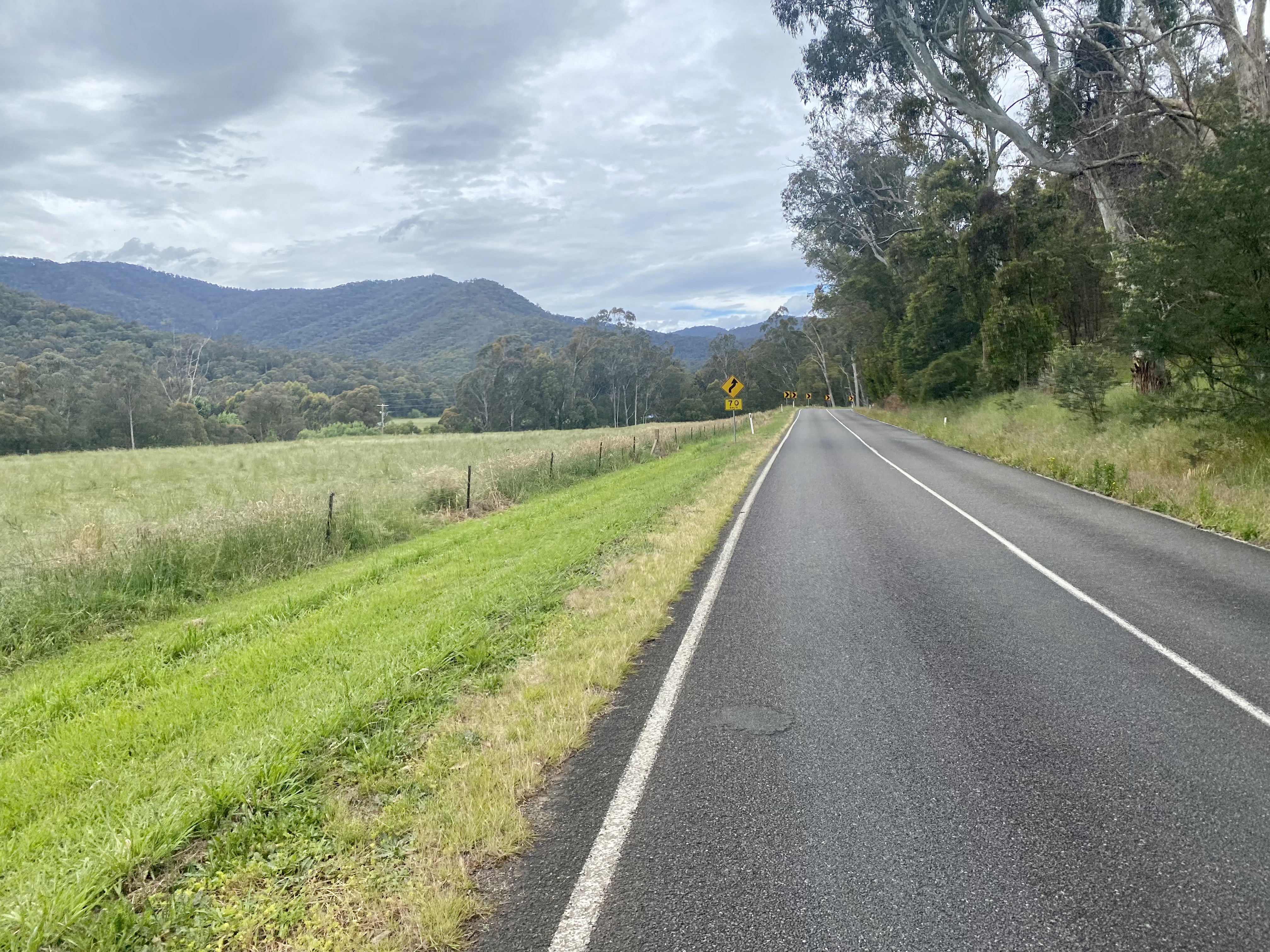 Predominantly following the Tambo River (which runs through Bruthen), the Great Alpine Road offers forest, river, farmland and mountain views. Whilst not exactly flat, the route’s overall following of the river makes for a gradual overall climb to the village of Swifts Creek. The photos show that there is no real verge to speak of throughout the trip, but I never felt unsafe or exposed as a cyclist.