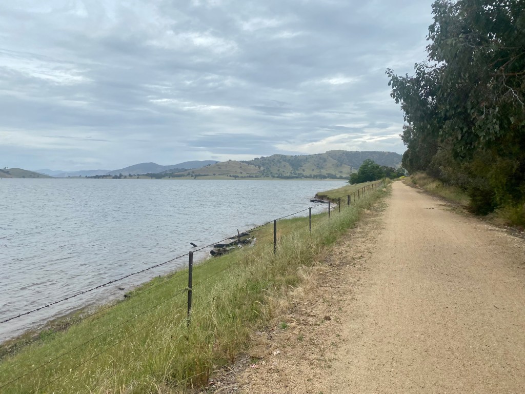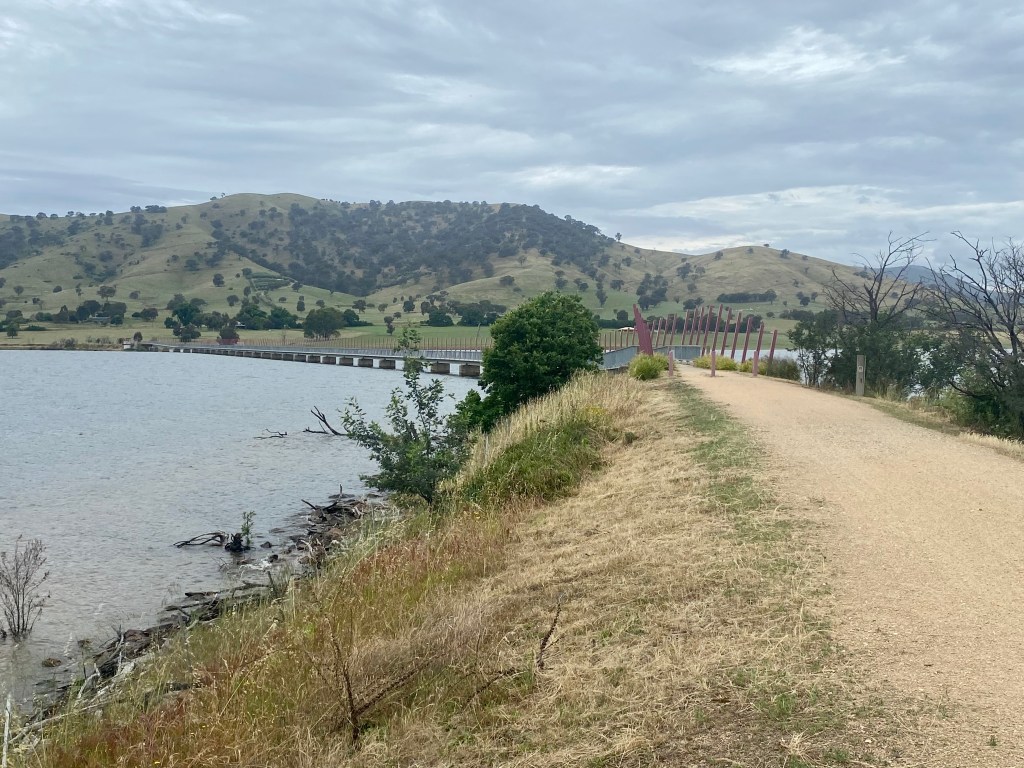 For the first stage it is possible to ride down the Kiewa Valley Highway to the rail trail, but there is an alternative backroad on the eastern river bank that makes for much more pleasant cycling – virtually no traffic yet great views. Following the river as it runs down to Lake Hume, the route is also quite fast. Tangambalanga offers a public toilet break and coffee at the general store after a short gravel road, from which a pop over the hill delivers you to the lakeside Rail Trail.