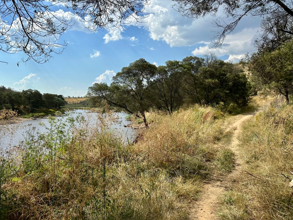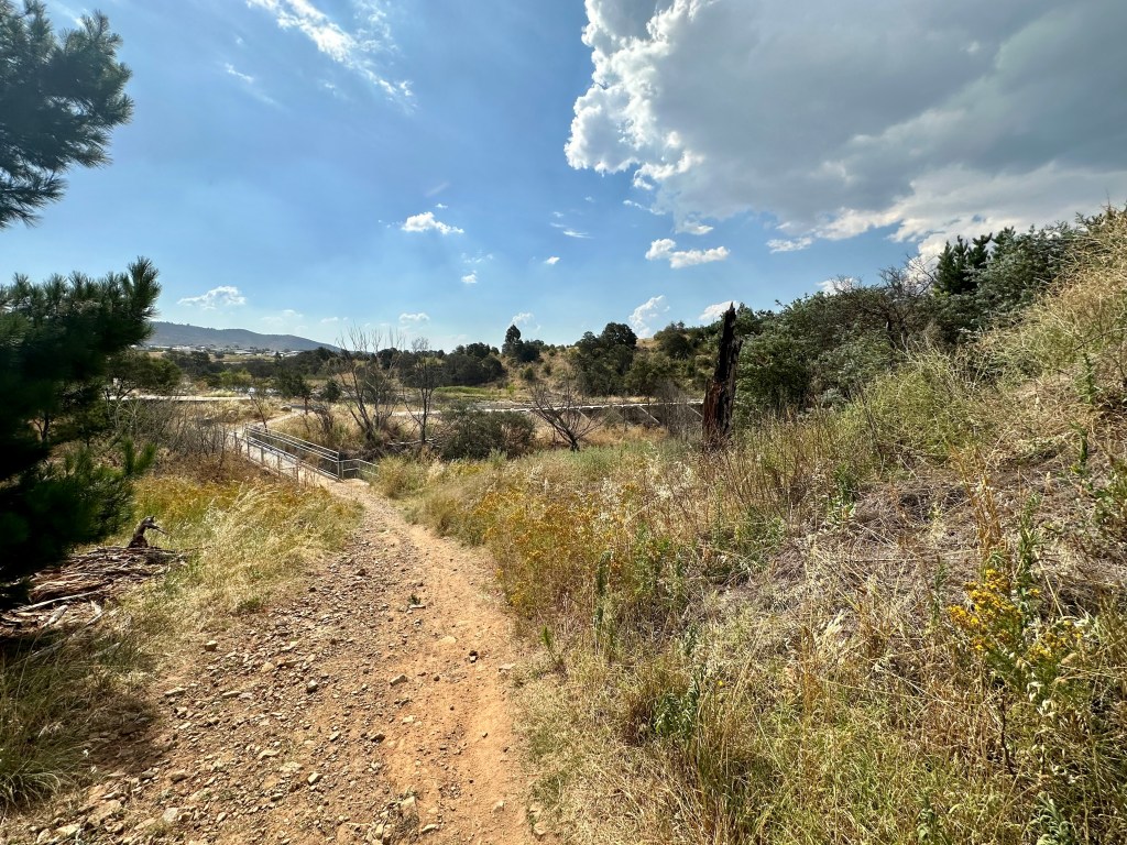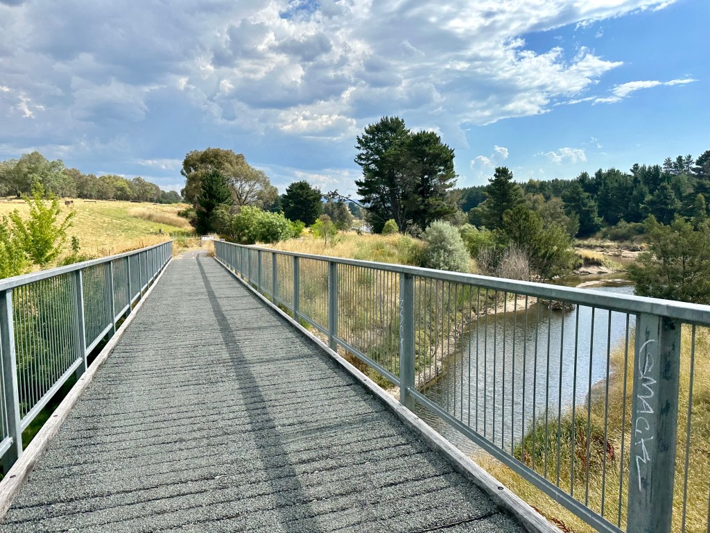 Getting to the bridge requires continuing on the cycle path beyond where it heads left (actually this means staying on the original route!), and then exiting to descend a slightly technical trail that is easy to miss if you don’t know what you are looking for. After a short bridge crossing of Weston Creek, it is easy to head over the Molonglo and onto the main river-side trail.