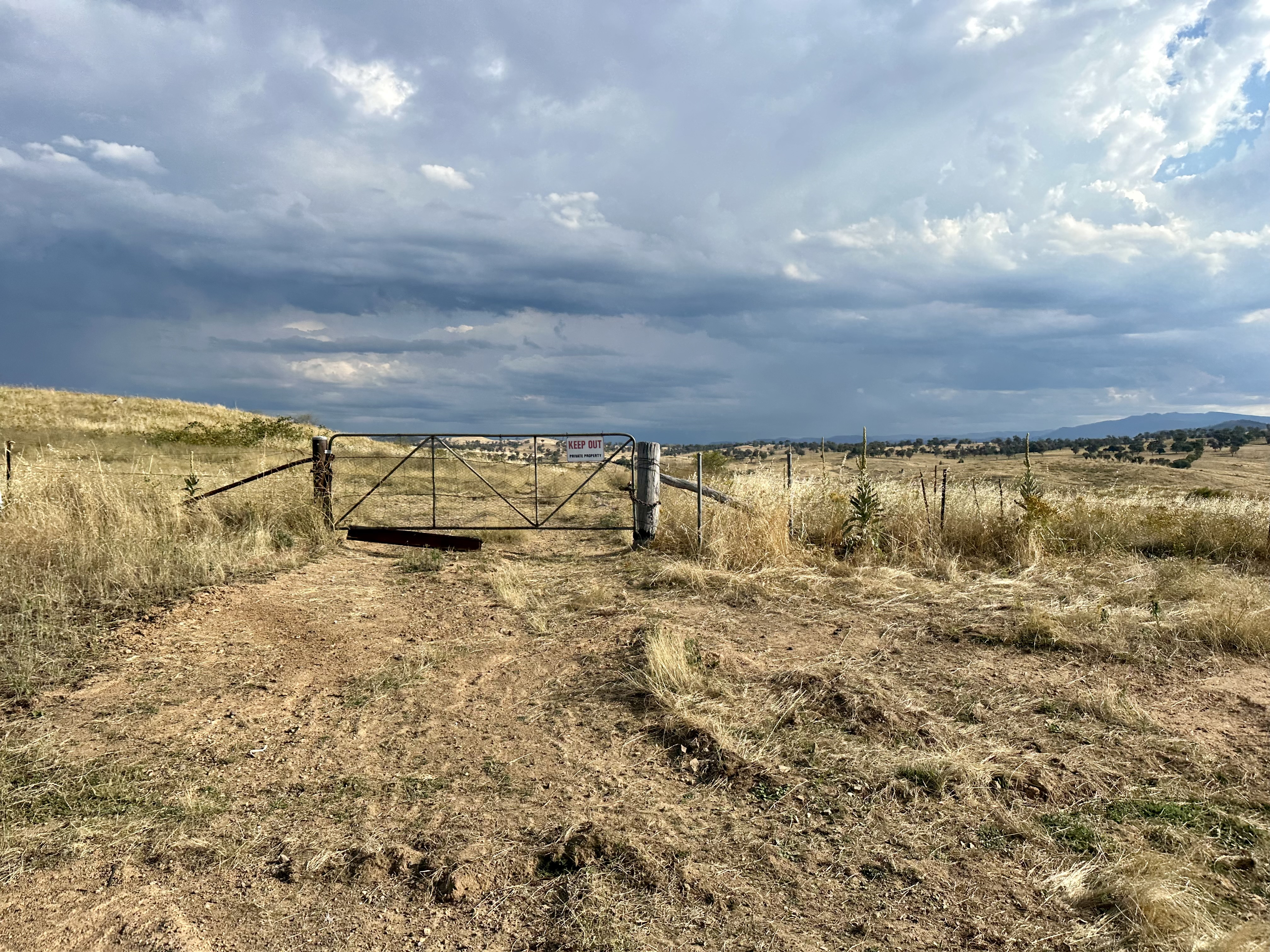 From here the cycling experience on Pipe Flat Road has changed in recent years. The previously mostly closed gates are now mostly open and numbered (the last locked gate is “2”, and the last one at Aprasia Link “7”). Whilst I expect that they could be closed if a paddock is being used for grazing, hopefully at least they won’t be locked. The scenery here is great, until the Pipe Flat Road is interrupted by what I call the “Gate of Mordor” – doom and destruction promised to all who pass. Not quite, but clearly some folk don’t take “no trespassing” seriously.