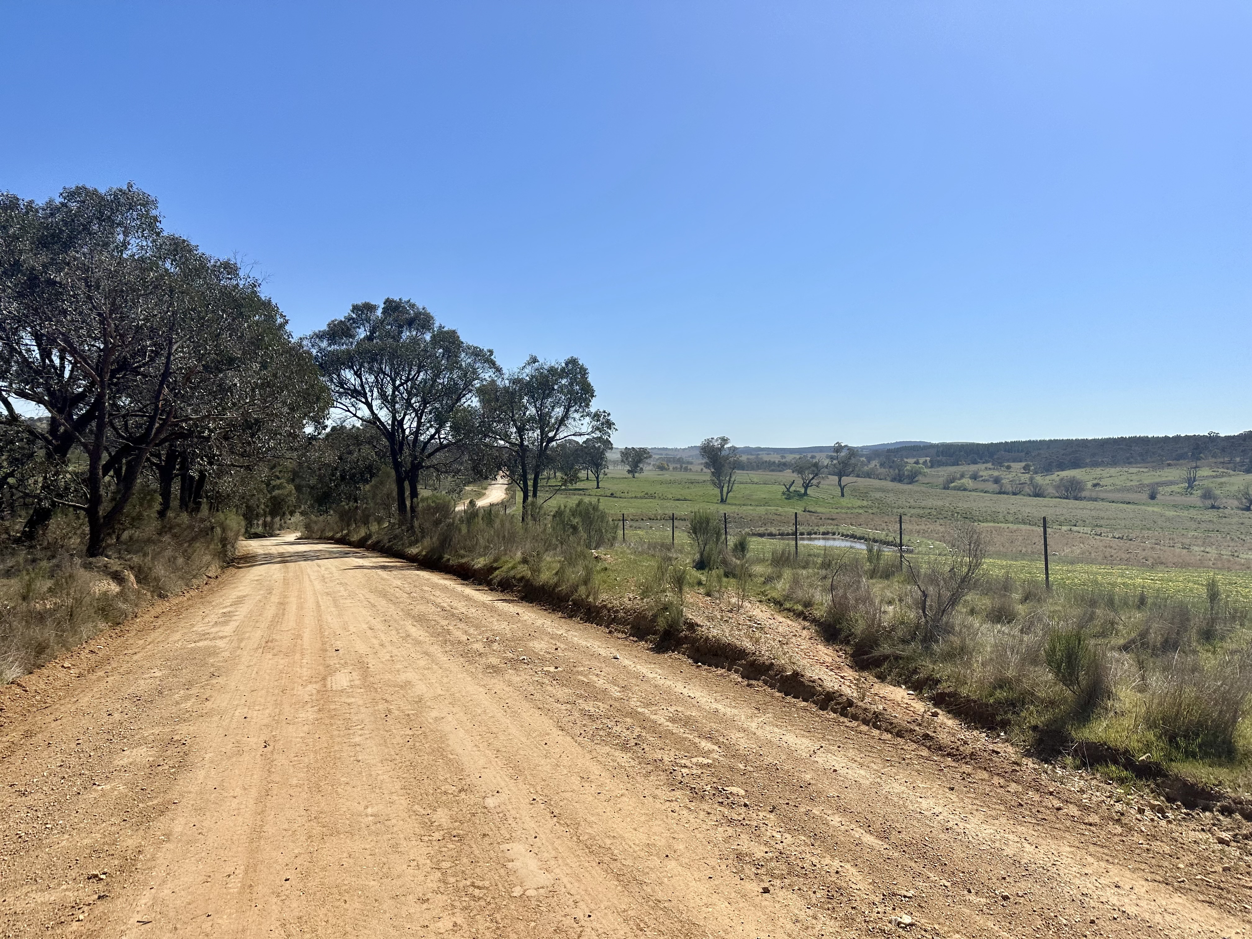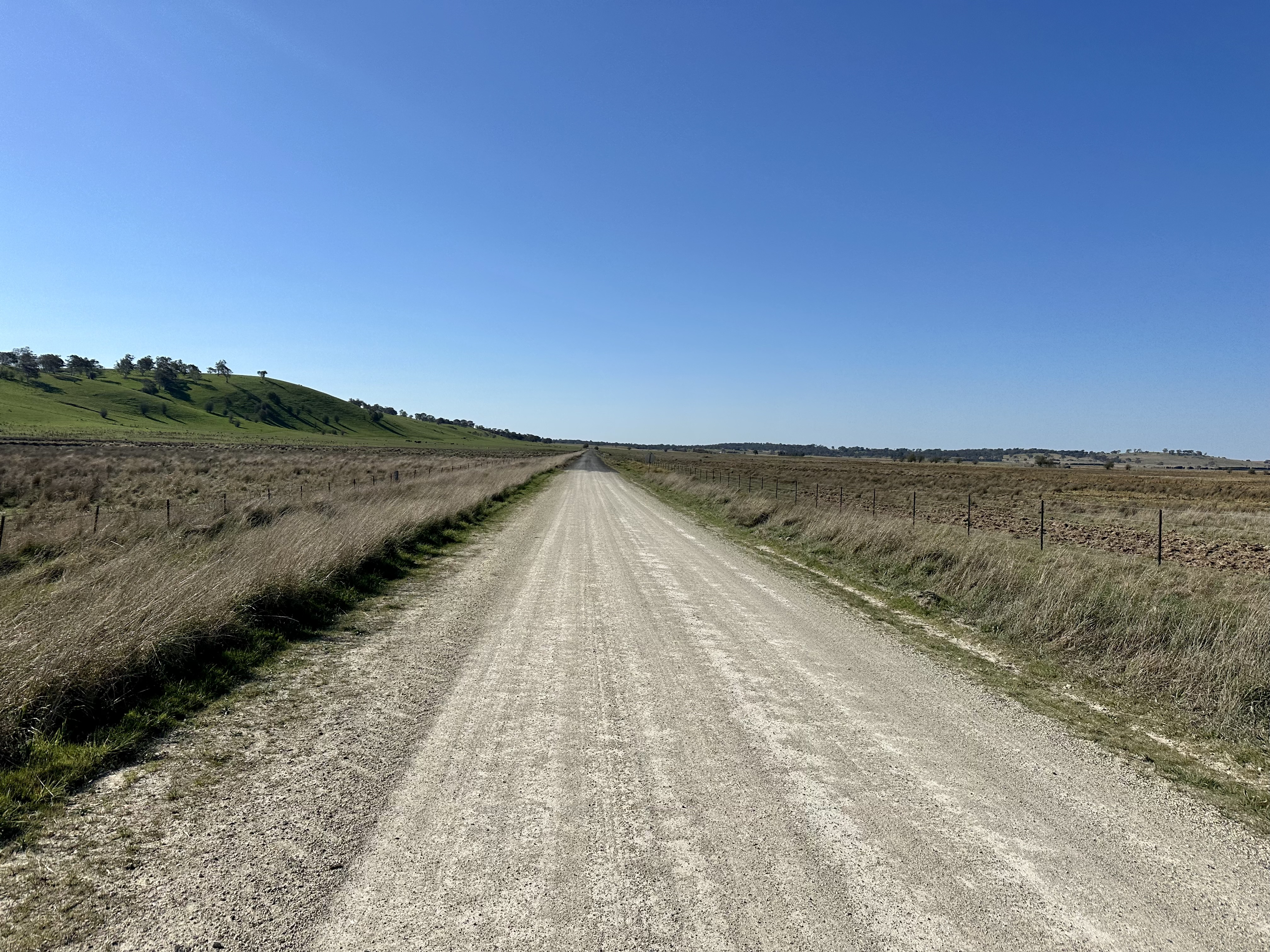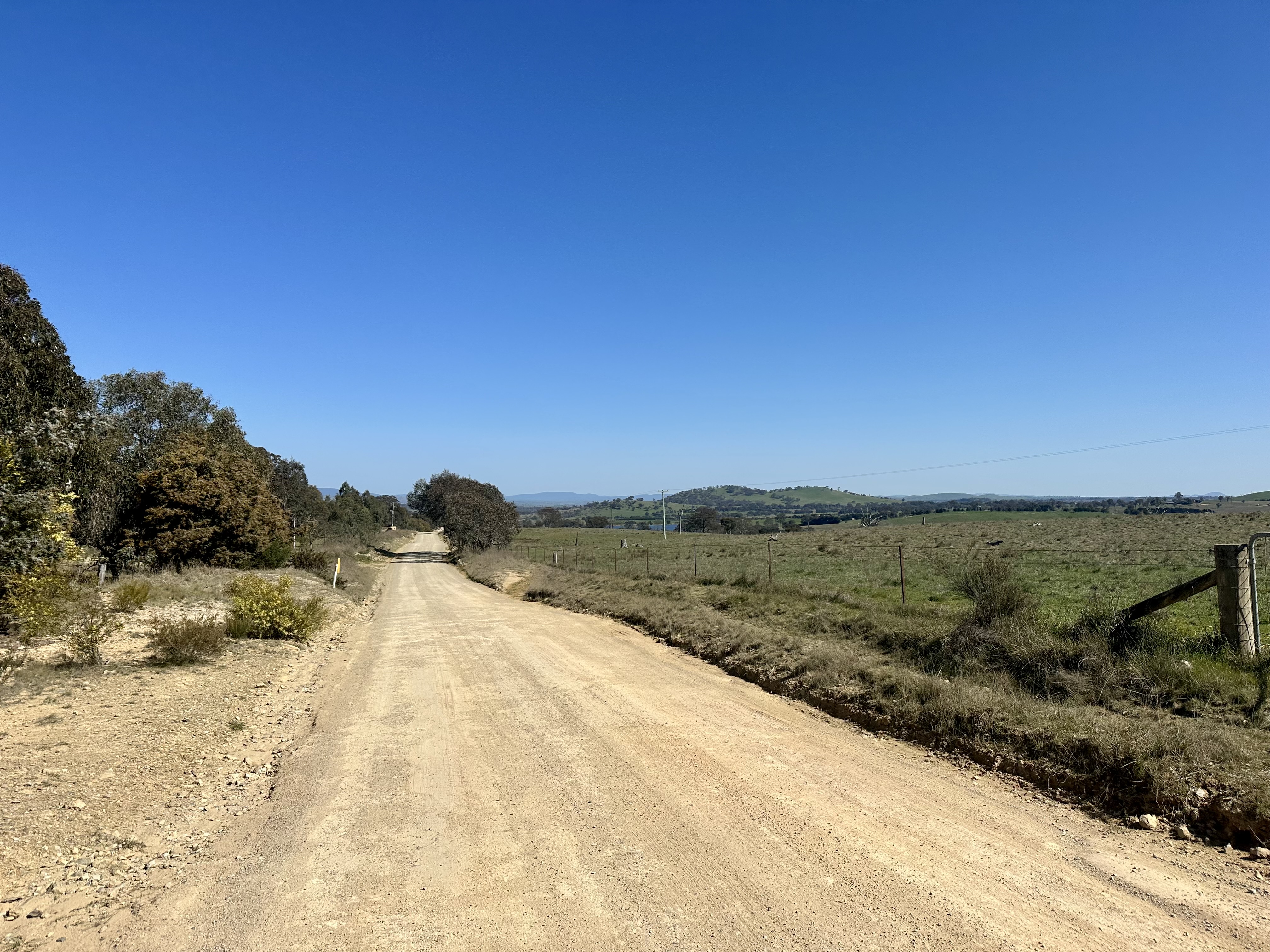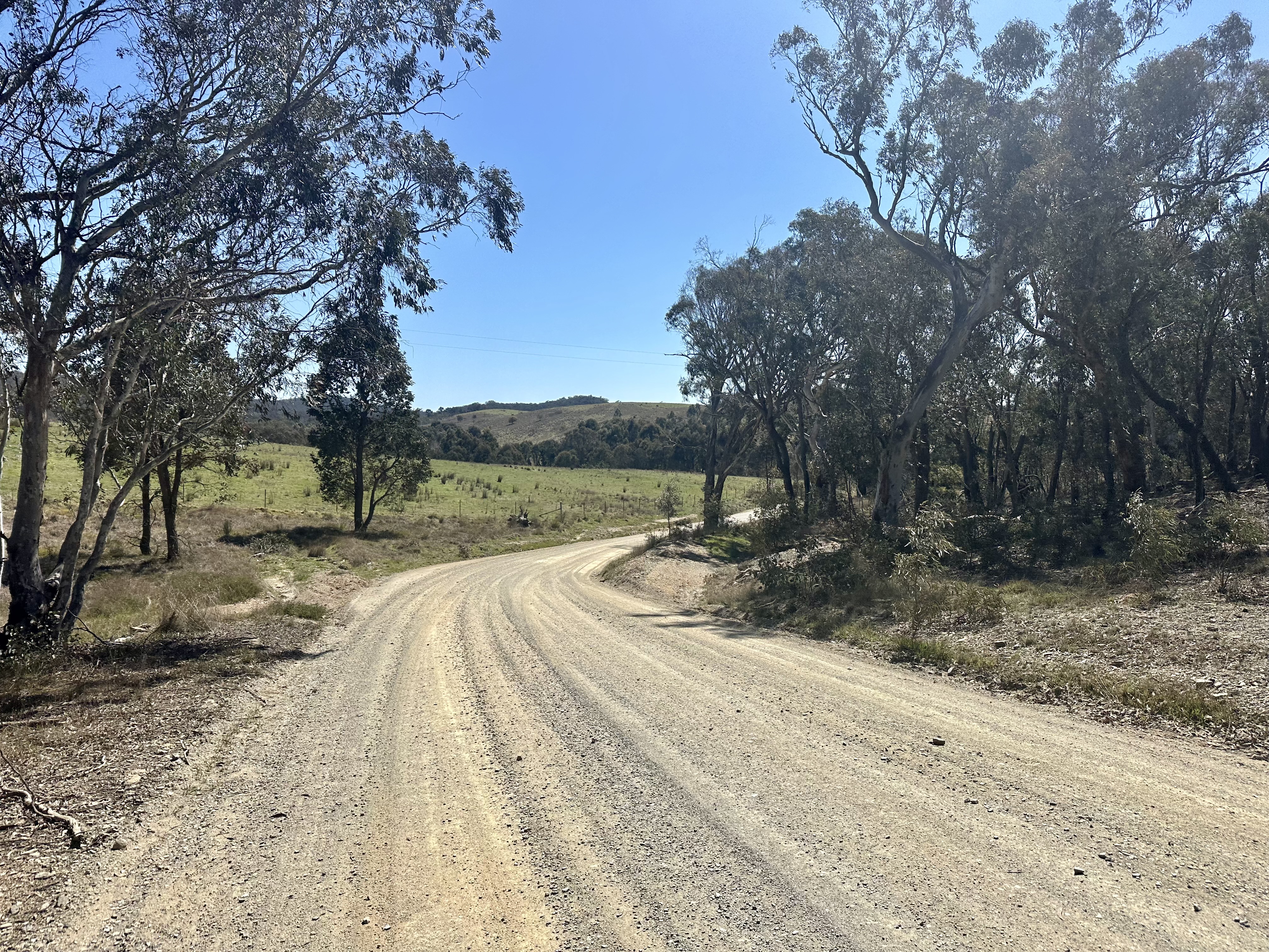 There are some great gravel options in the area bounded by Murrumbateman Road, Barton Highway, Hume Highway and Federal Highway. I’ve explored a few: such as to Yass and onwards, Gundaroo, and Gunning. My favourite way to get out of town and to this area is via Spring Range and Nanima Roads, connecting on to Dicks Creek Road. At least they are normally, but the magpies in spring were brutal.
