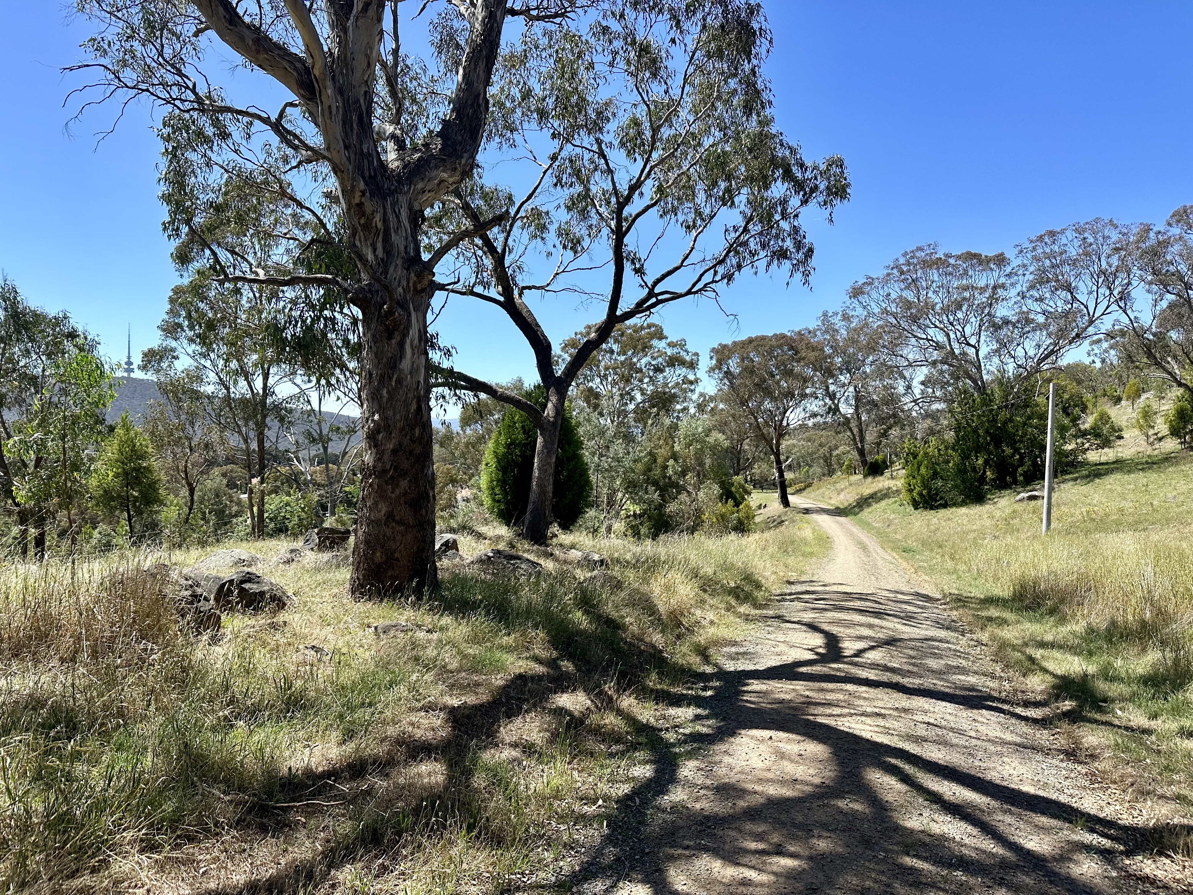 After a couple more gates it is possible to pass through to The Pinnacle Nature Reserve via some paddocks. There was no livestock here, but I suspect this might sometimes be the case. After another gate the route connects to what is more usual as a gravel road through Canberra’s Nature Reserve – a relatively smooth maintenance trail. Although there are some steep pinches, is very cycle-able and offers some great views back towards the city.
