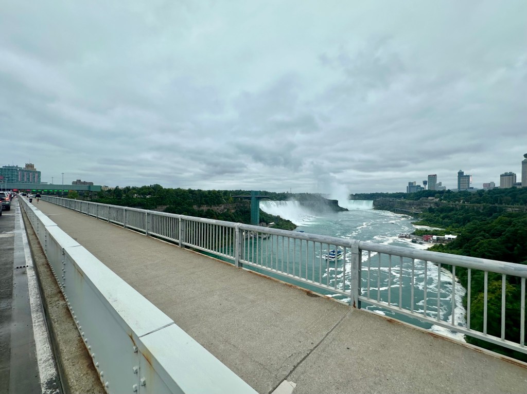 After checking out the falls in Canada, it is pretty simple to travel back to the USA via the Rainbow Bridge. There is a path, but this is pedestrians only. So while you have to travel on-road, gently squeezing between the stopped traffic and the railing to the immigration booths, it is totally fine.