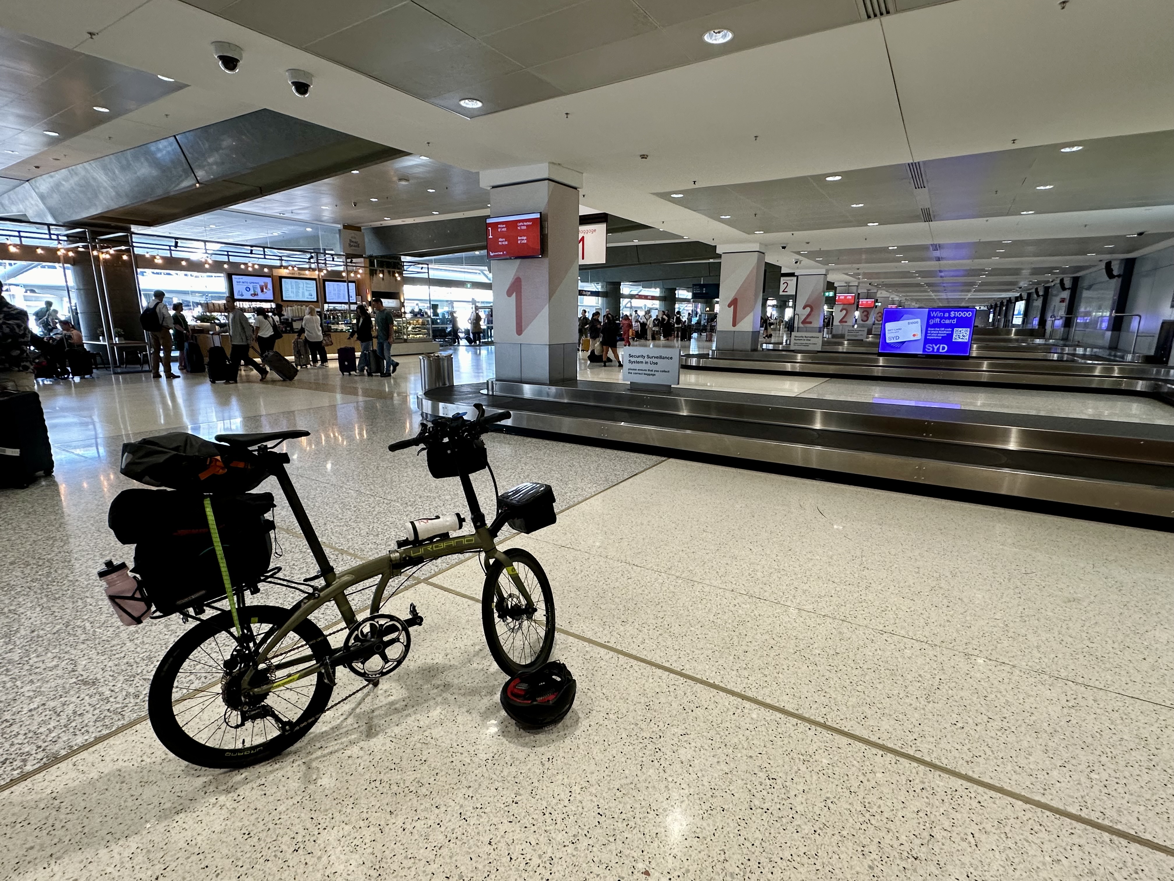 Having previously experimented with flying with the folding bike, the next obvious step was to cycle to and from the airport. This proved to be even less complicated than I thought it could be – in about 10 minutes the bike was bagged for check-in, or reassembled ready to head out of the terminal. The only real trick is finding an appropriate location for packing/unpacking – kudos to Canberra airport for an undercover outside area where this is possible, and in Sydney there is a large area at the eastern end of the T3 luggage carousels.