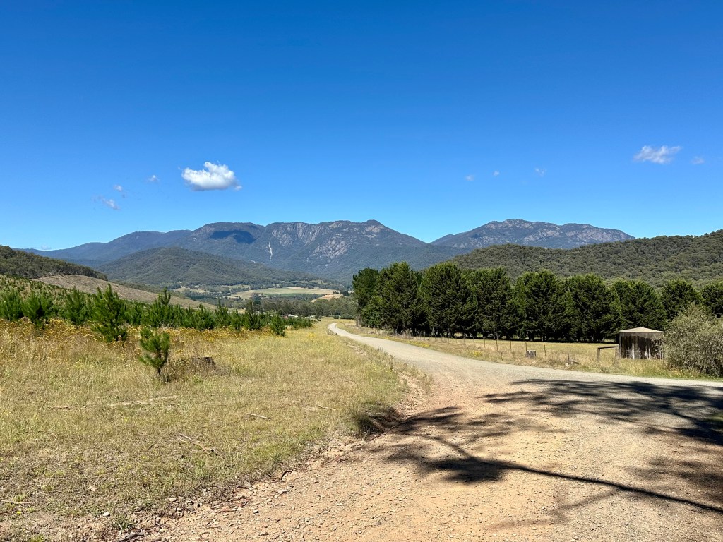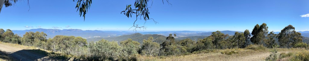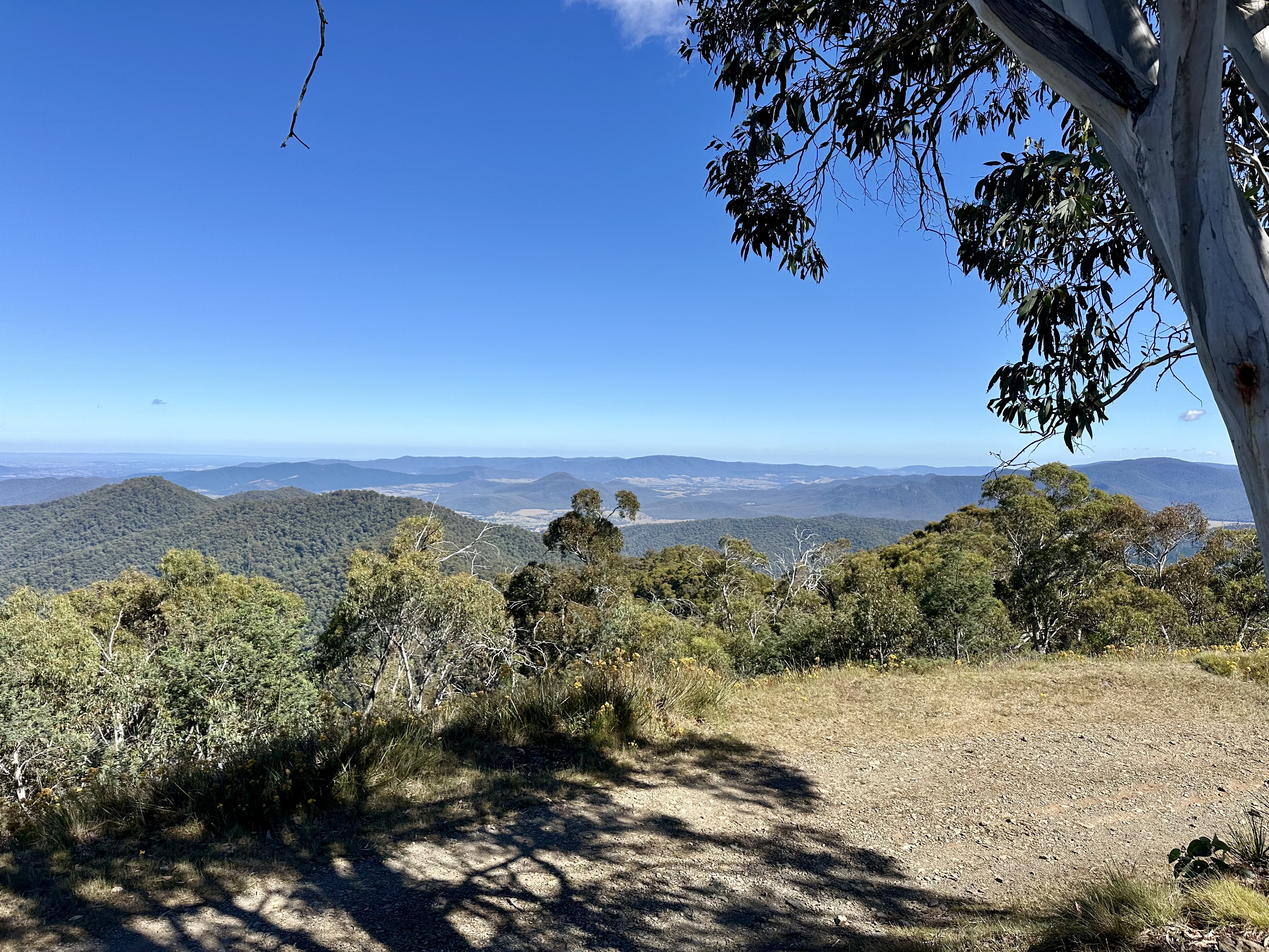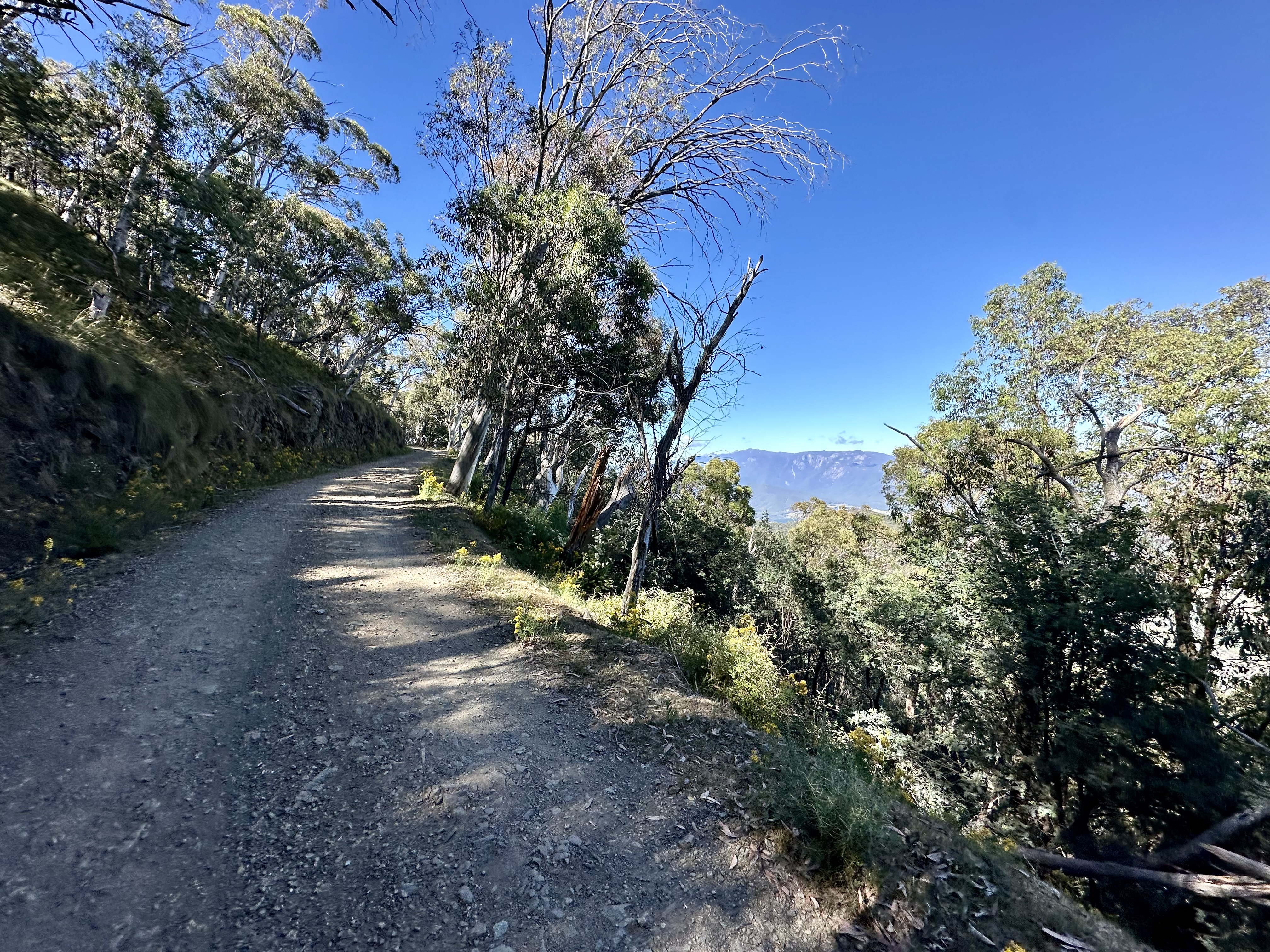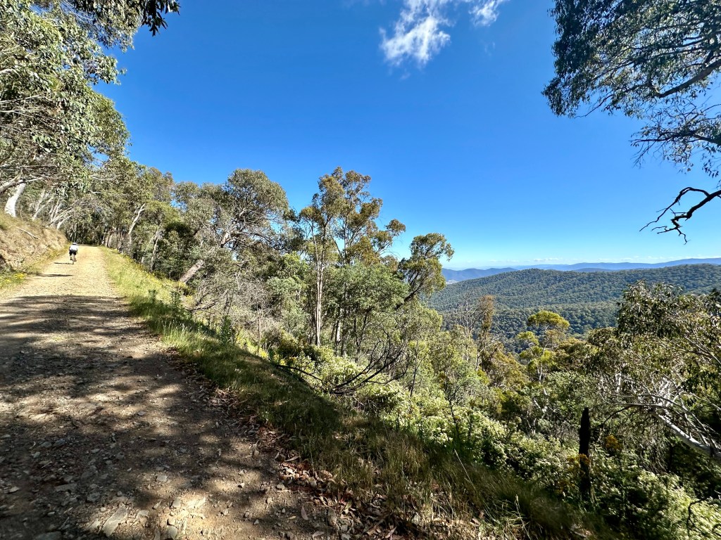 It is the descent where it is time to abandon gravel bike purity and embrace a mountain bike: you can take this descent at pace, and roll over and through the rougher bits. With a gravel bike you can take it super slow, and the more pace you add the more risk of pushing your wheel out of alignment (one cyclist on this trip), puncturing (another cyclist on this trip) or worse. There is absolutely no issue with taking your time and picking your line, but when there is 900m of gravel descent inviting fast paced fun, better to pick that mountain bike from the tool box! Having said all of that, the view at the end towards Mount Buffalo is just epic.