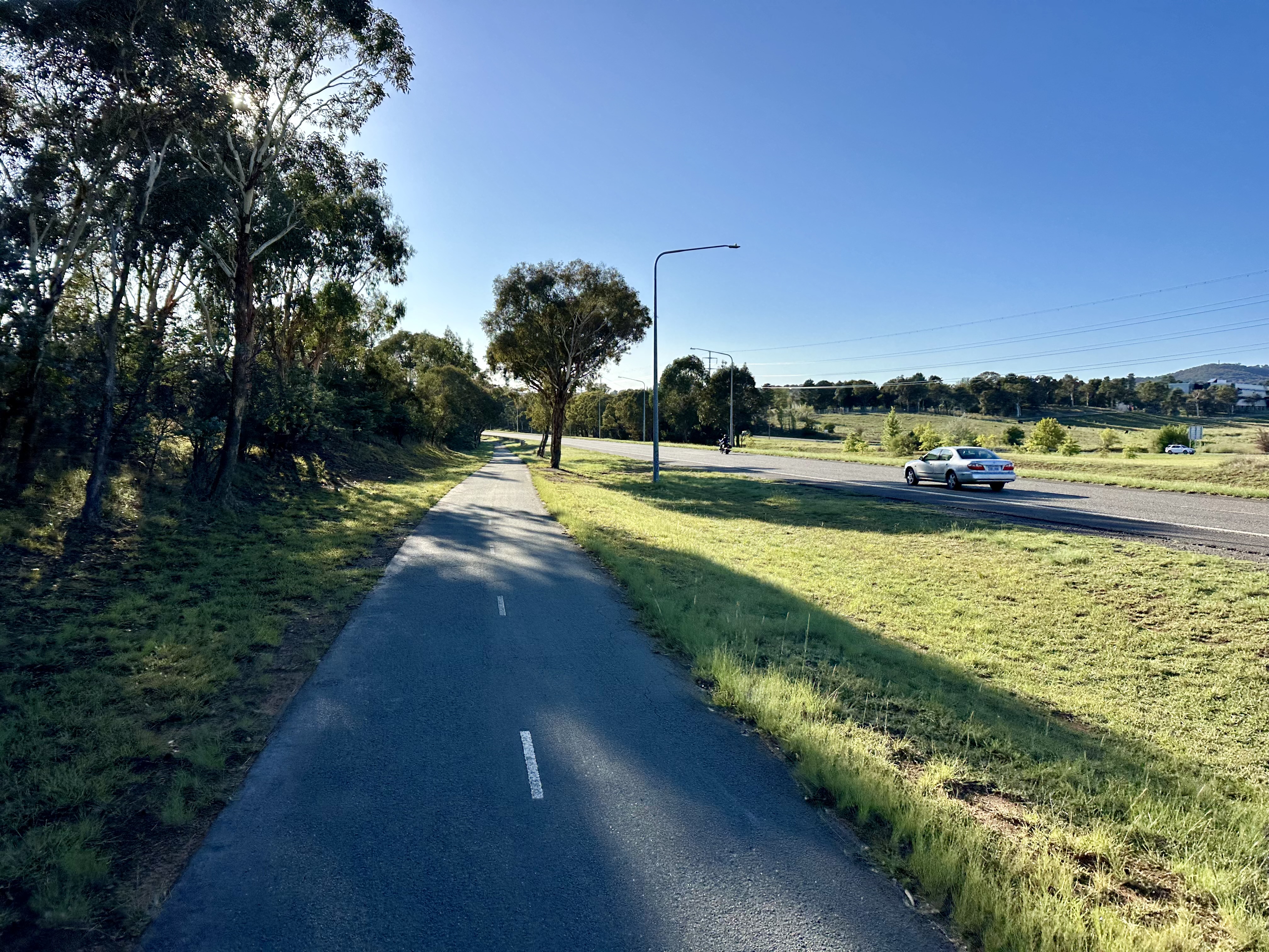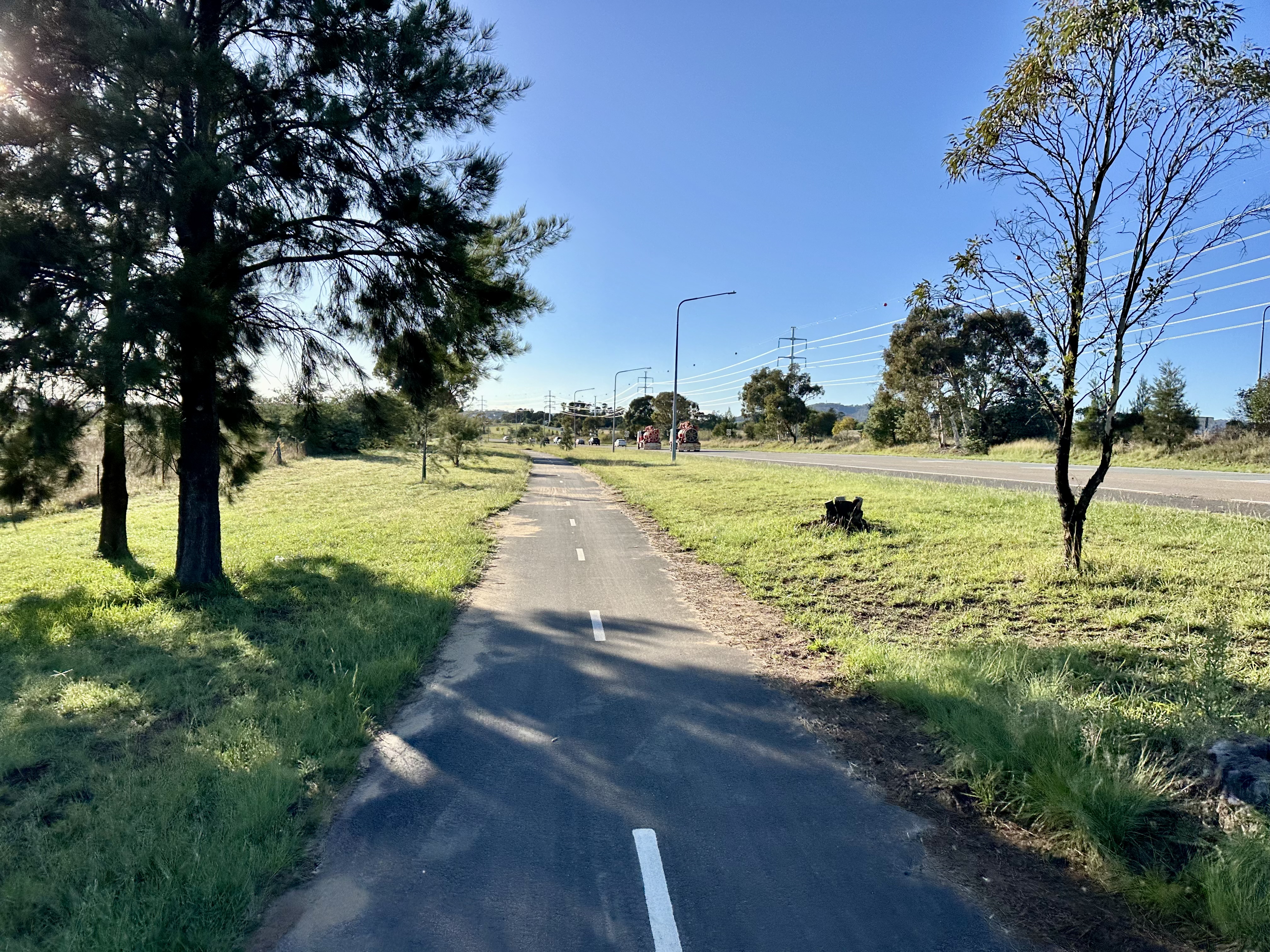 Being able to head out of Canberra without a main road is the first trick. While one way to exit Canberra is via Queanbeyan, cycling through town on the main streets is not that much fun. Thankfully there is an excellent shared path that takes you right around the city, following first the railway and then the Queanbeyan River. Getting there is easy via the Canberra Avenue shared path, with the Queanbeyan path starting immediately to the left after crossing the railway and entering NSW.