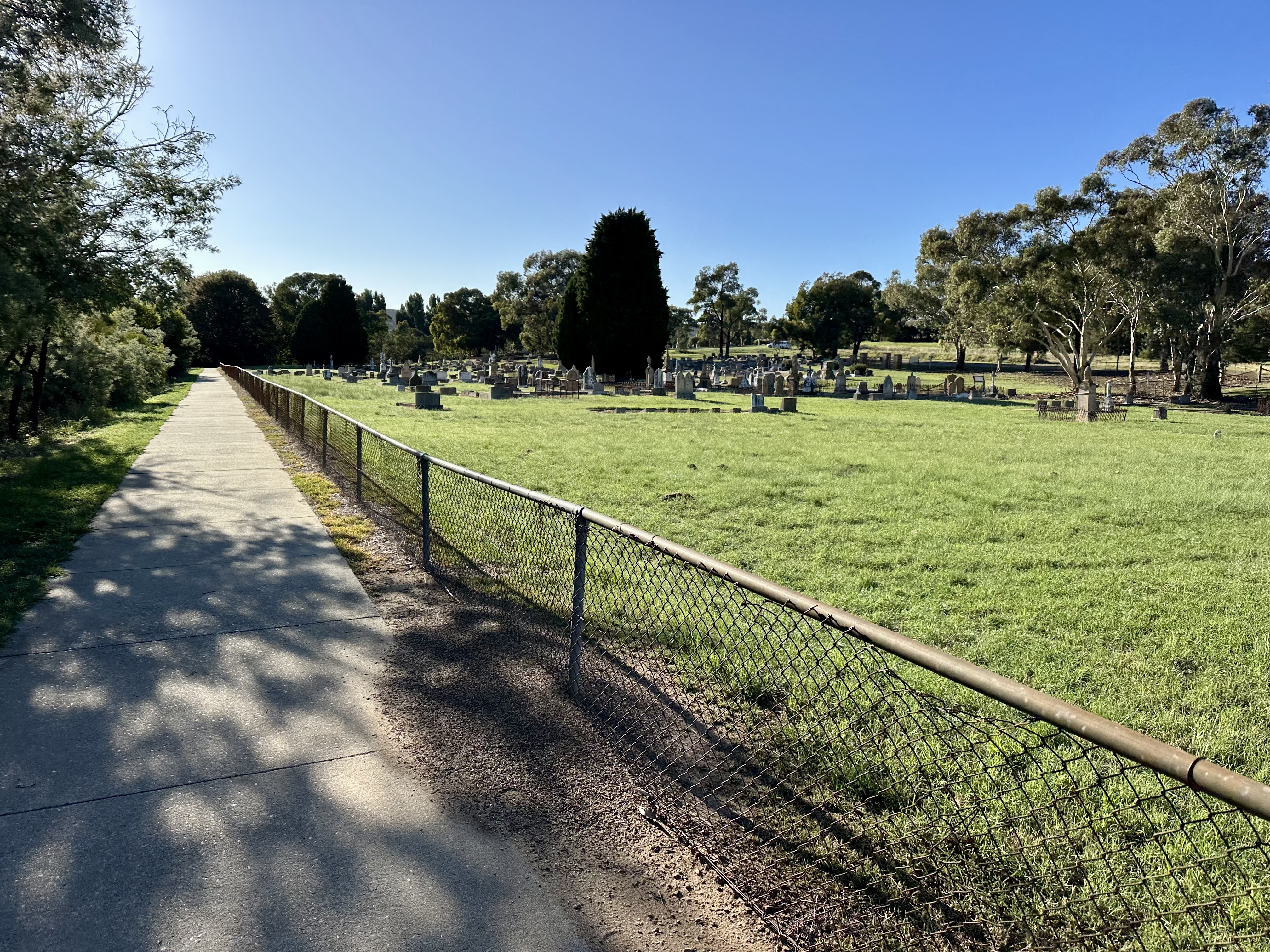On this path (which is shown as a continuation of the C2 cycleway on Canberra’s walking and cycling map) after passing the Queanbeyan Railway Station is one of the more interesting sights: the Riverside Cemetery. No longer accepting burials, many of the graves are quite old, and apparently the site has suffered from flooding over the years leading to some graves disappearing entirely. From here the path continues across the river, behind McDonalds, and then it is possible to get onto the climb out of Queanbeyan on the Kings Highway.