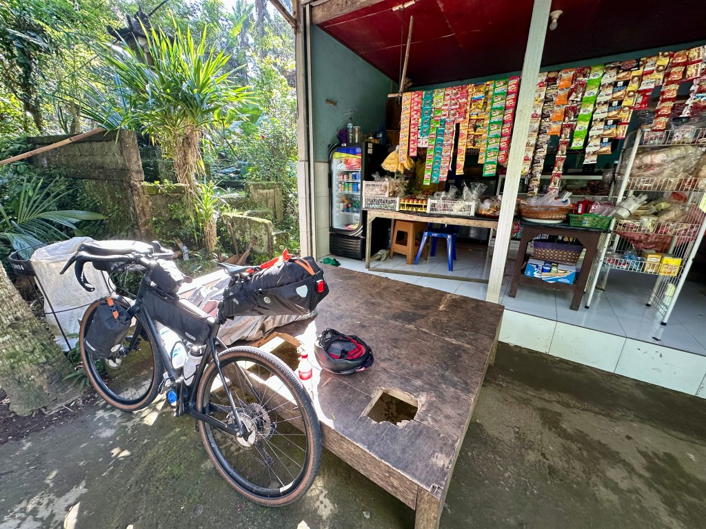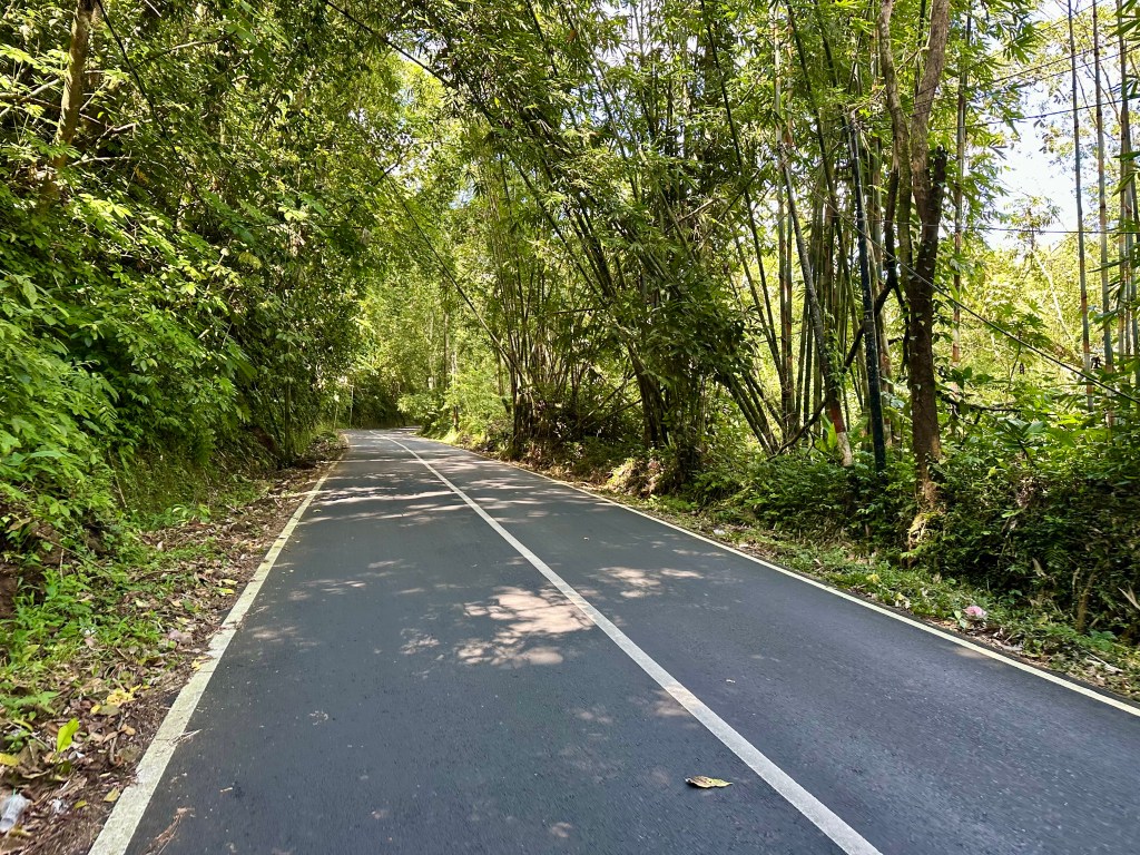 The backroads were fantastic. What you do quickly learn, however, is that there are a lot of roads up and down the mountains (e.g. north/south from Ubud), but where there are links between them there are short descents to creek or river valleys followed by steep climbs out. Some of these are super steep – you will be in need of low-range gearing (I took my Specialized Diverge on this trip, see more detail on gearing here). But the roads are not all the same – some travel alongside fields, others through forest, and sometimes a combination of the two.