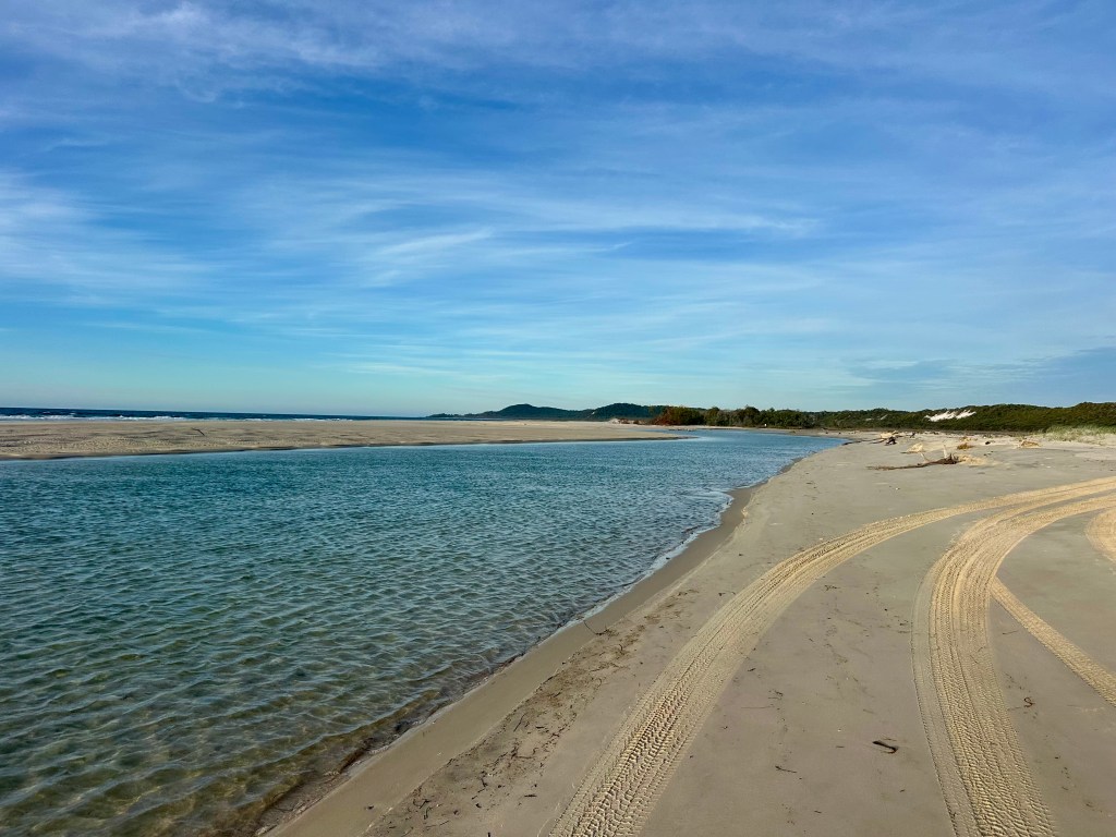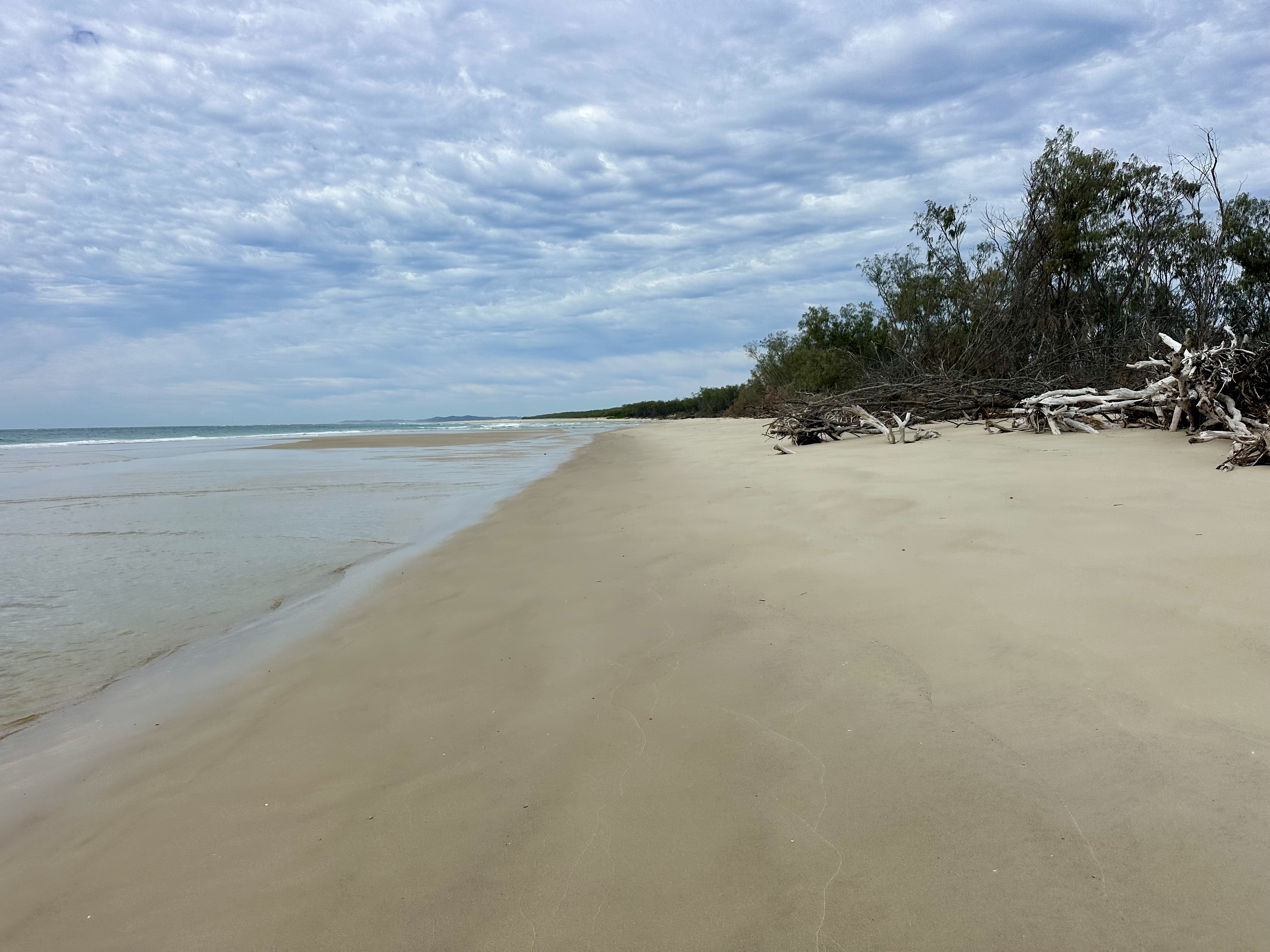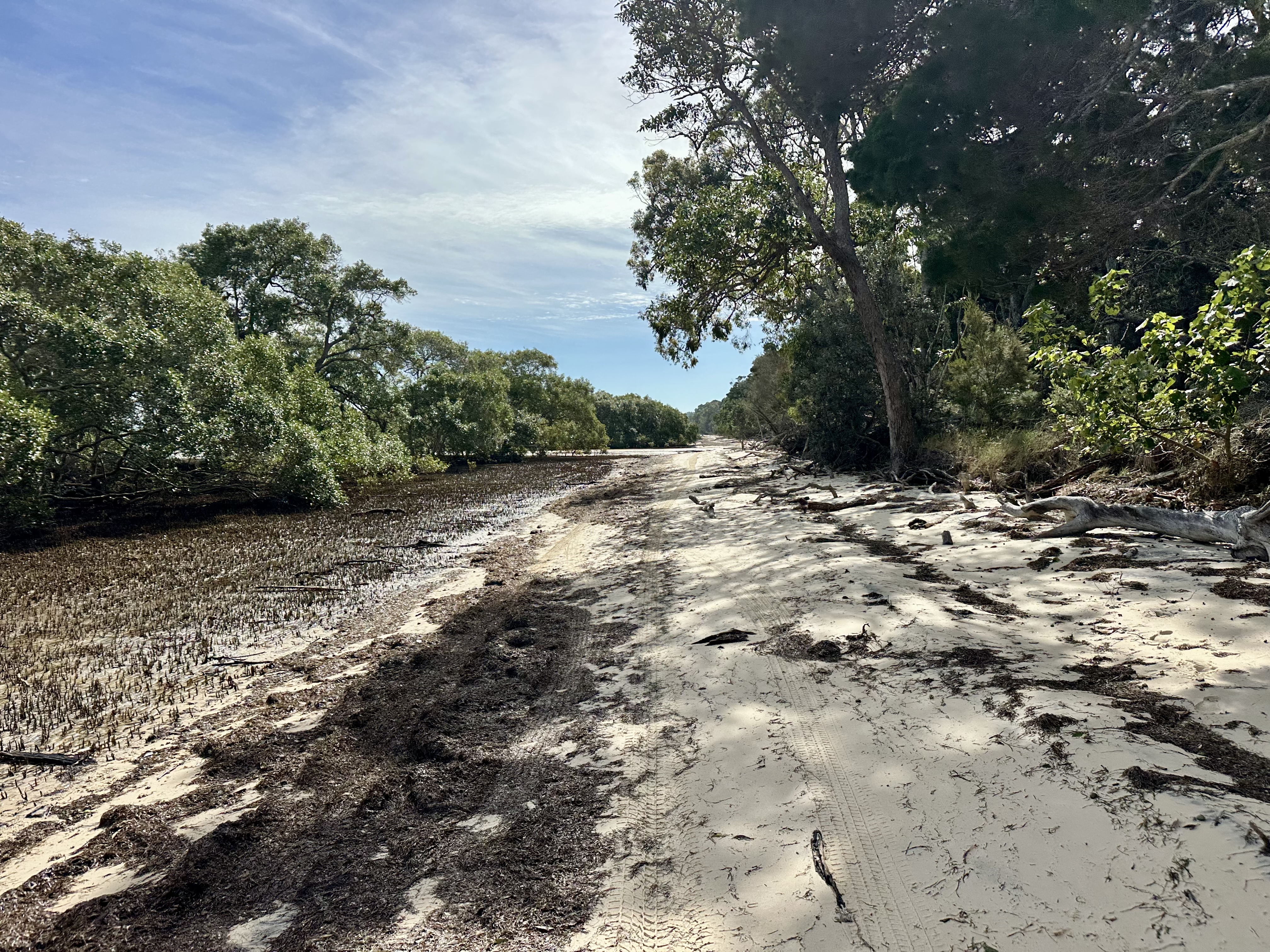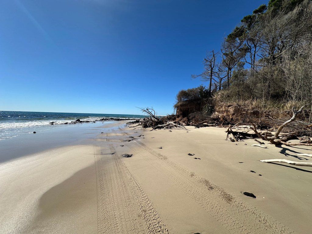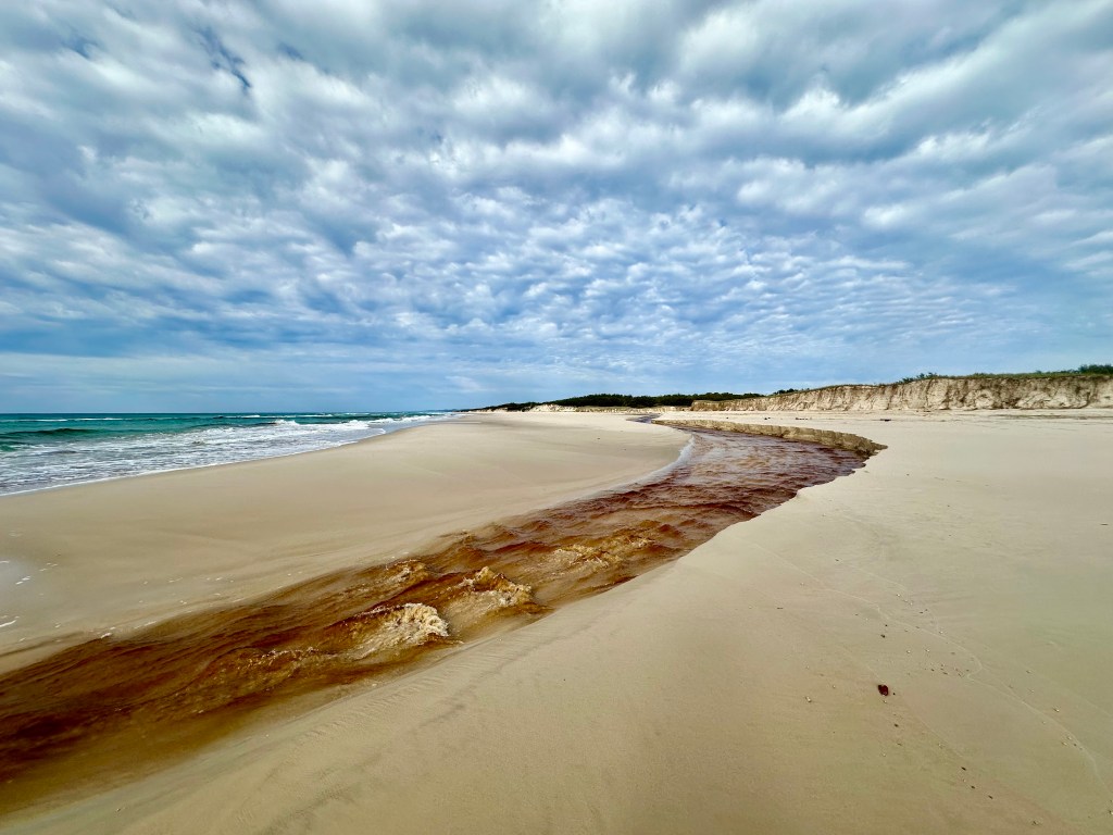 It is the north beaches after Tailor Bight where I found that the tides are most an issue. At low tide it was possible to cycle around tree debris on the beach and also to cross Main Creek without stopping – getting all the way to North Point. On the following day mid-tide not only was it impossible to cycle around the tree debris (I hauled the bike over), but Main Creek was filling rapidly – requiring a thigh-deep wade. I expect it is often the case that the only option would be to take the inland Bulwer – North Point “Road” (see below for my cycle on this).