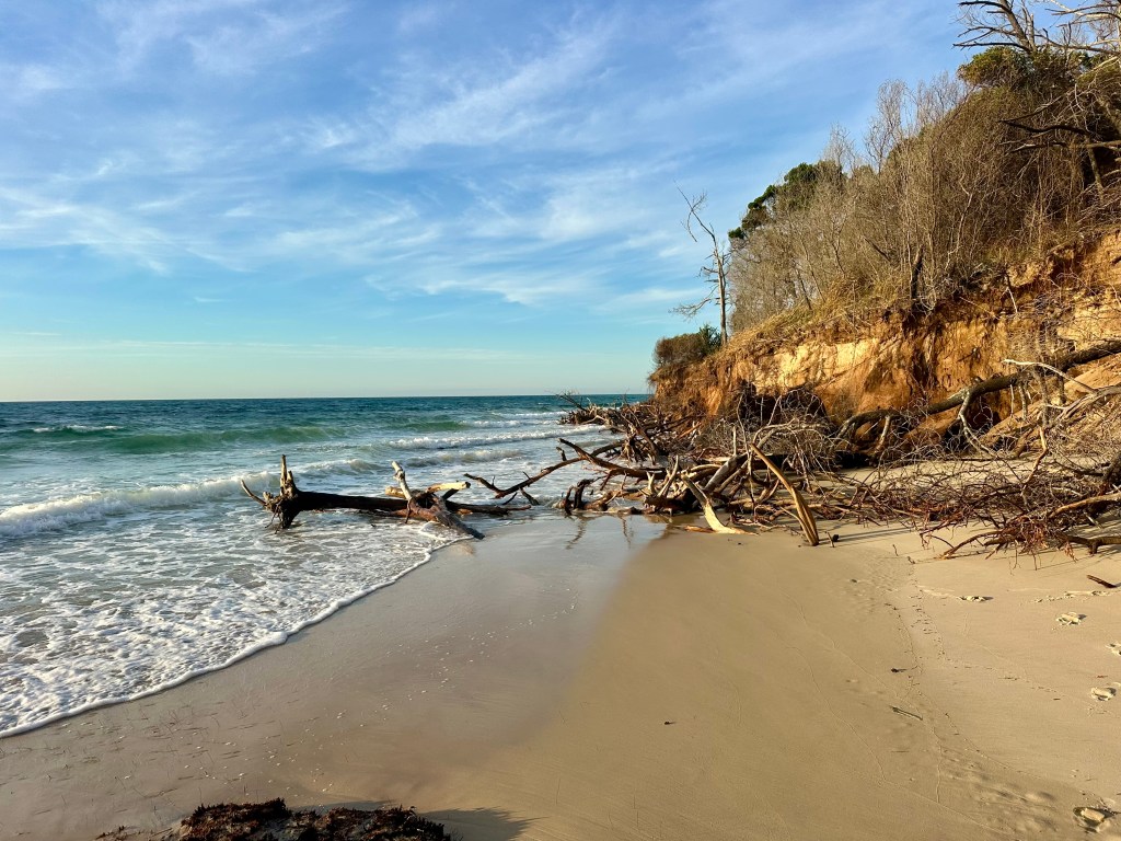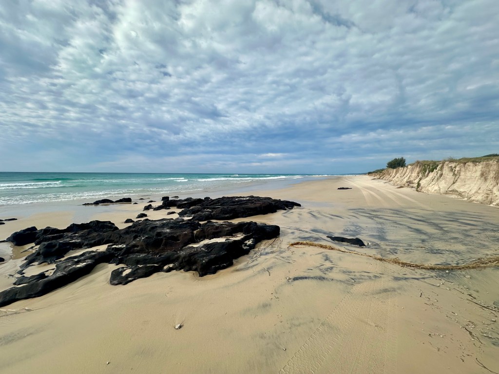 Approaching the southern end of the island (as North Stradbroke island comes into view) the surf drops off. This area is also one that might be challenging to cycle at high tide – there are a number of different ways to pop off the beach onto Reeders Point Road to get to Kooringal.