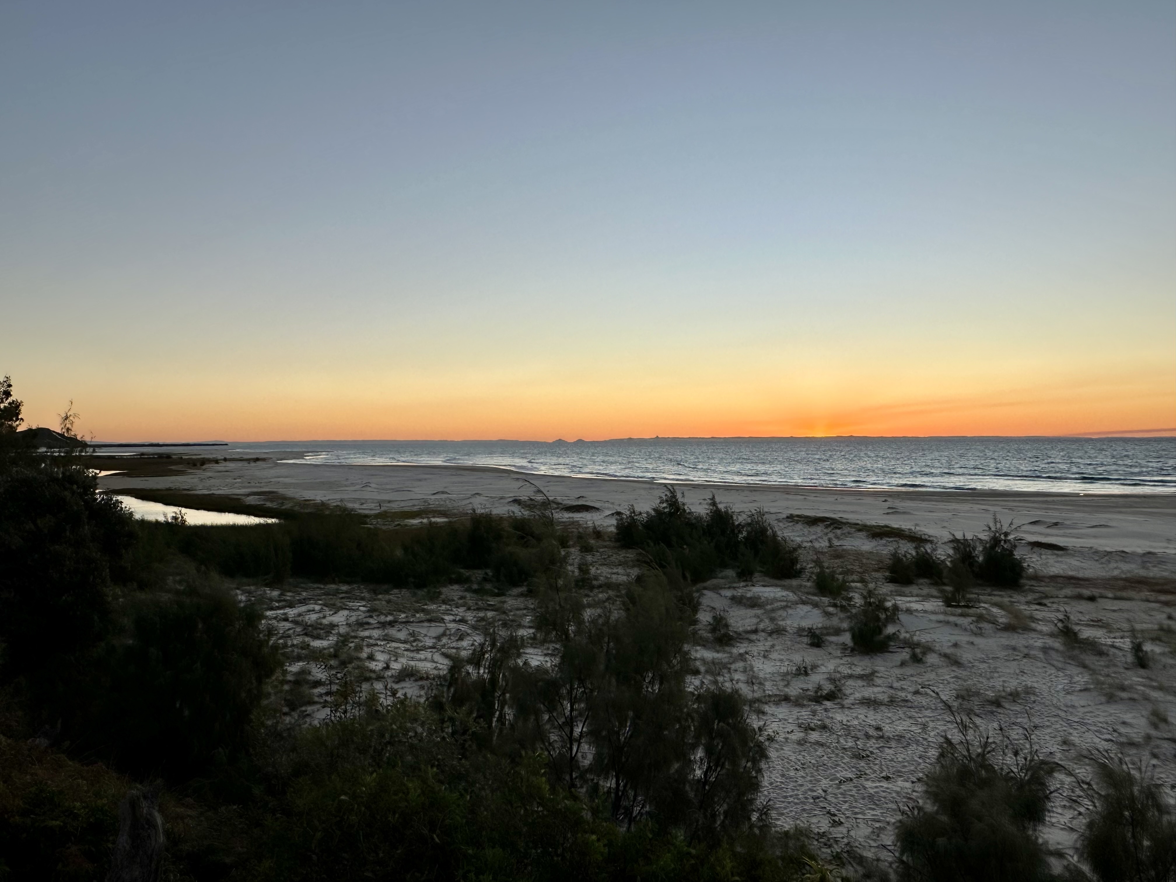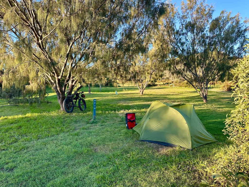 Having arrived I headed north to get to my camp site. In planning my time on Moreton Island (see Mulgumpin Island Map) I chose campgrounds with basic amenities (more on this below) and with the cycling in mind. Having said that, I was also seeking quieter grassy locations with great swimming. Given these criteria I recommend North Point as an excellent location. For the two nights I was there only three of the twenty sites were occupied despite it being July school holidays (sites are spread across a huge space), the toilet block in good condition, water easy to access (it does require treatment – I use a Grayl Geopress), a basic freshwater cold shower available and the swimming at Honeymoon Bay was fantastic (provided you know what to look for on a surf beach). Topping this off there is a great sunset view and the night time company of the bush stone-curlews.
