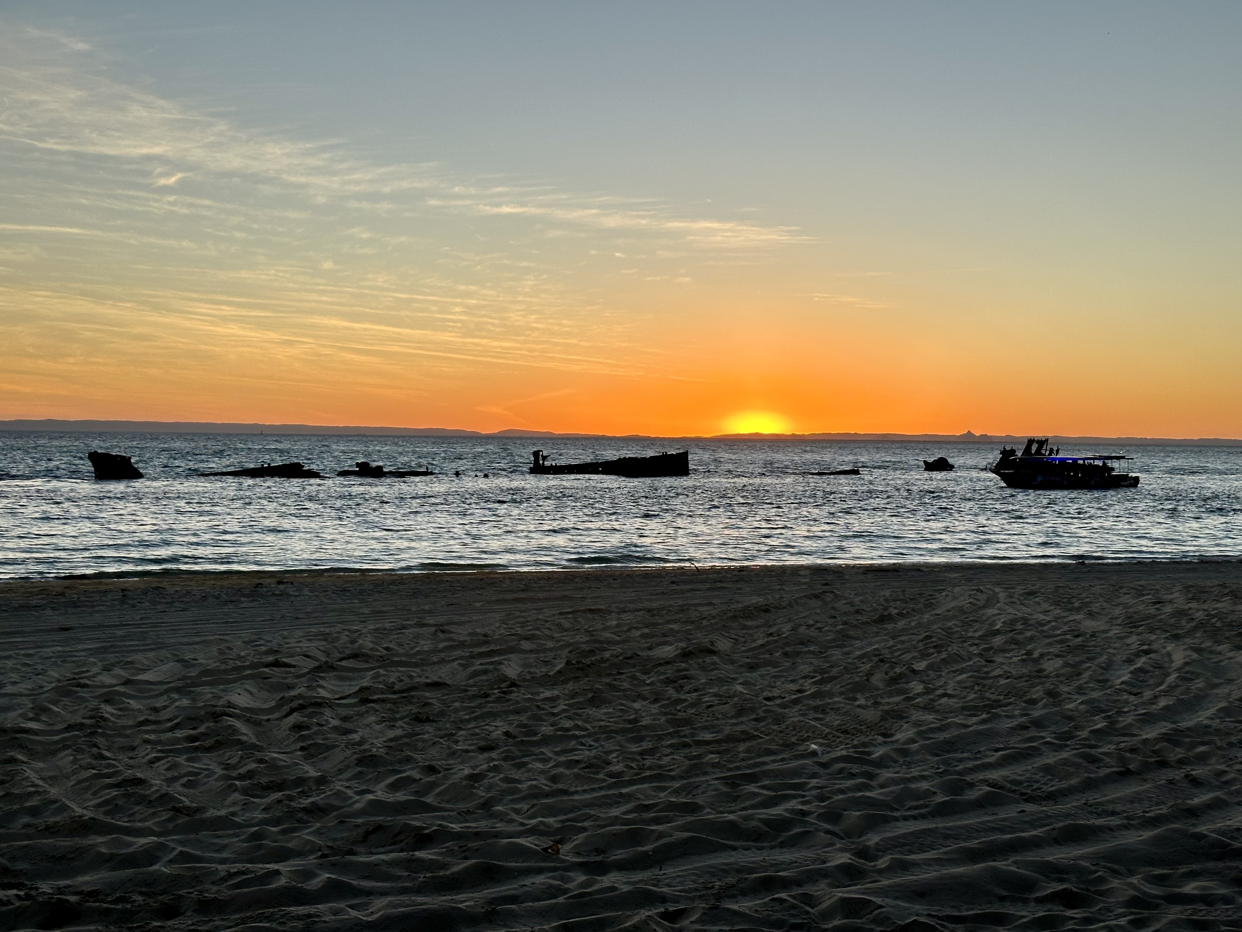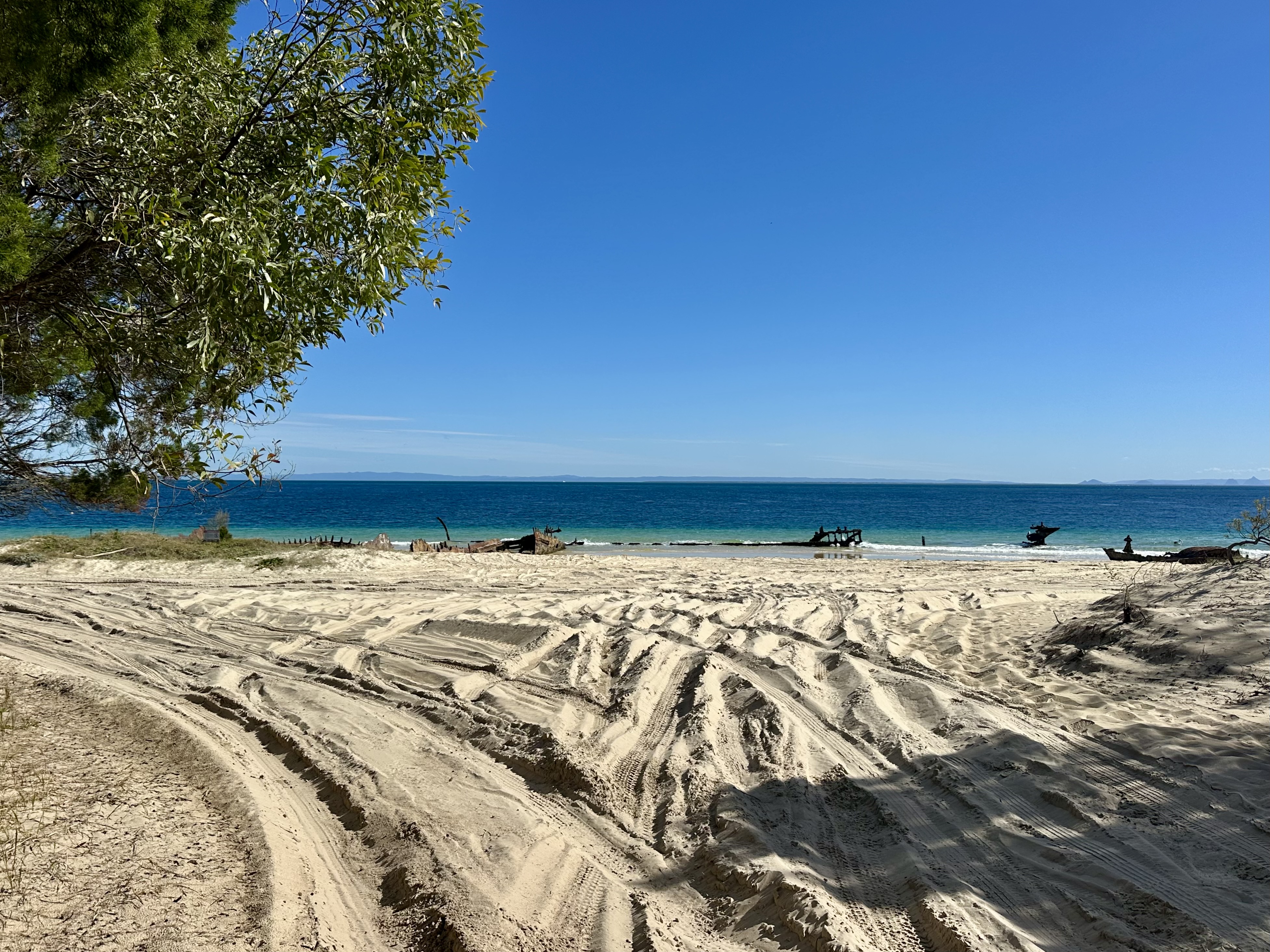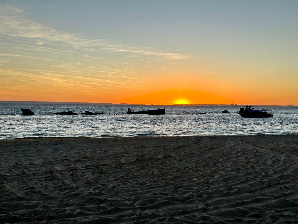 After a stop off in Kooringal, the cycle to Tangalooma and the Wrecks is the most difficult part of the island loop: this is mainly due to areas of loose sand to traverse around “Little Sandhills”, passing mangroves on the south west of the island. Eventually the beach opens up again near the “Big Sandhills” – about 7km north of Kooringal. Another potential challenge is at Tangalooma, namely the wharf. Thankfully at lower tide levels it is possible to cycle under it.
