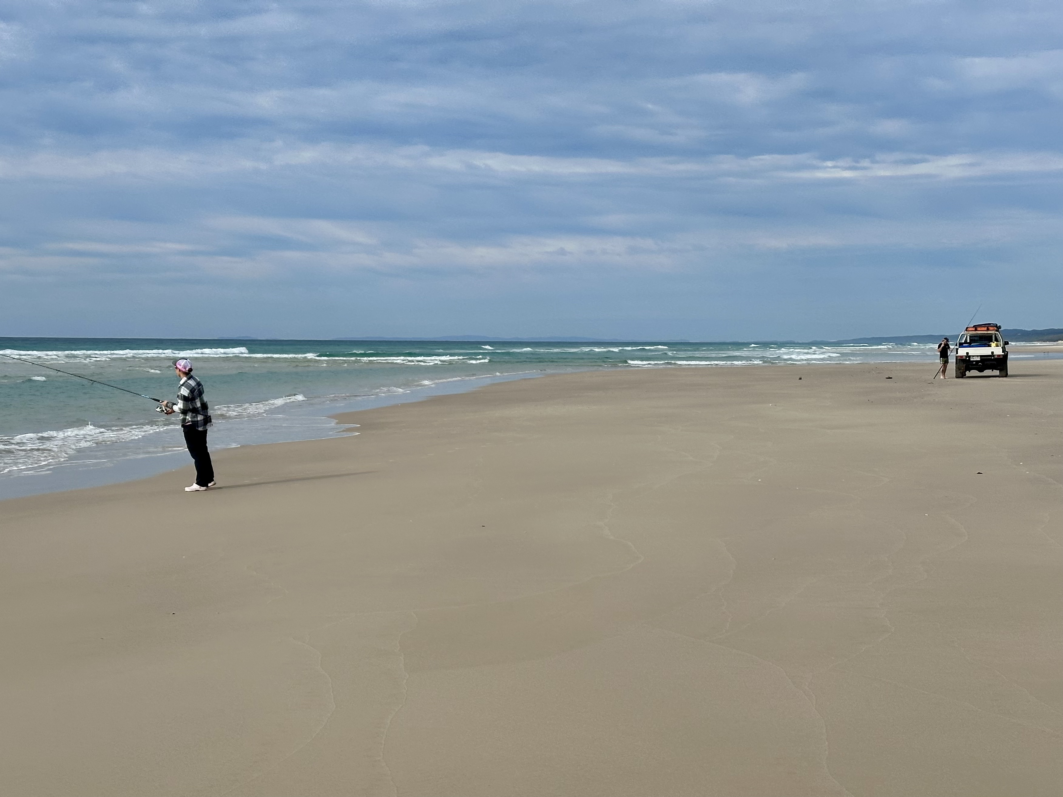 The East Coast beaches are the easiest to cycle on: I think that this is due to the sand being firmer as a result of the surf action, although I was also helped by a tailwind. It is a long trip down the coast, but it is not without sights to see: rock formations, folk fishing, fish jumping in the surf.