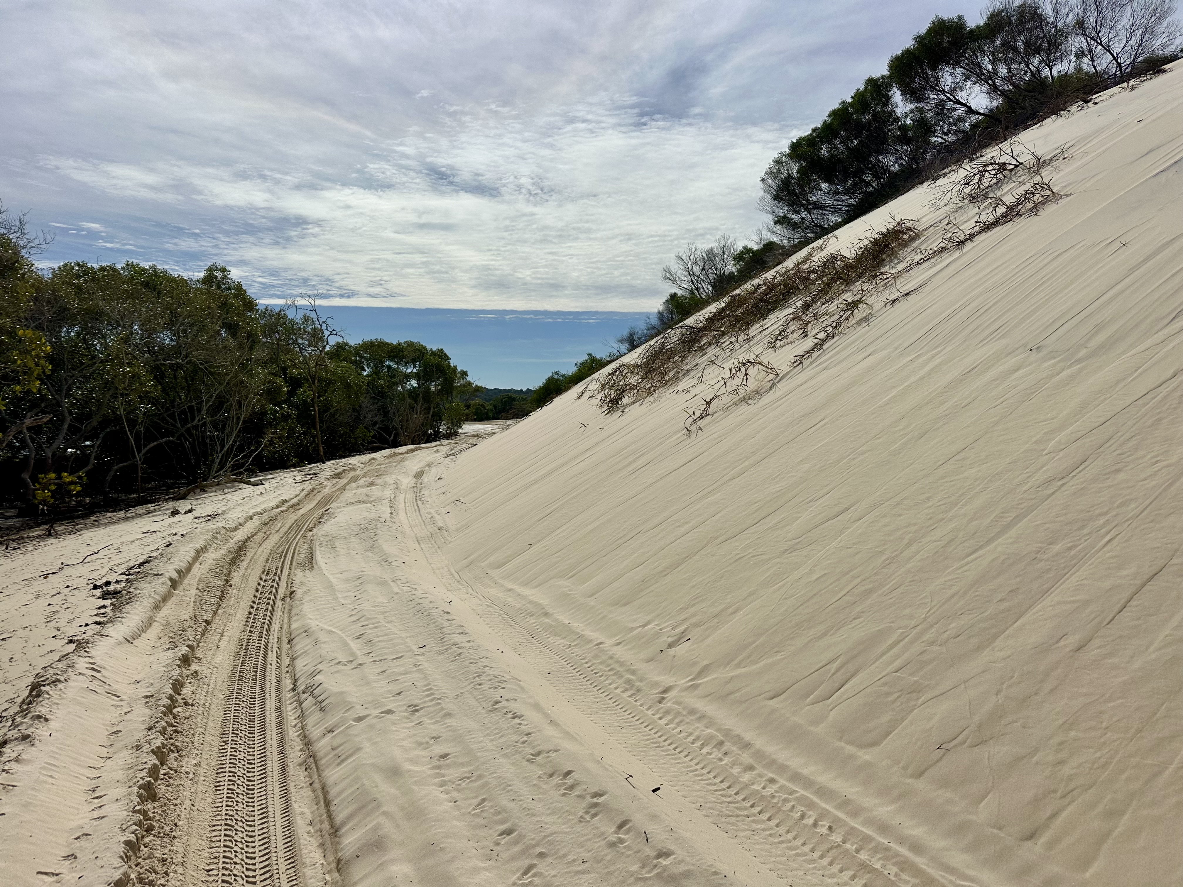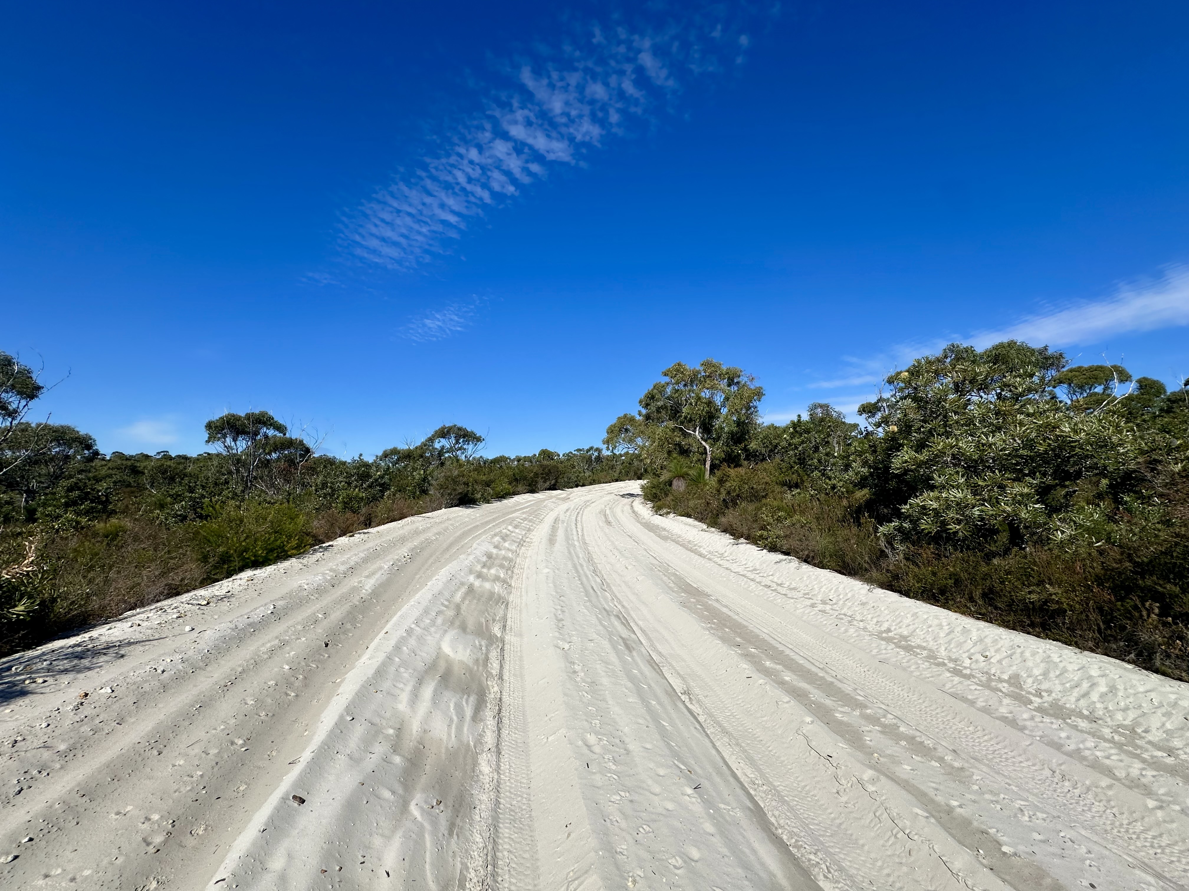 The trail has a mix of firmer and softer sand sections, including some parts that are deeply rutted. There were also occasionally short sections of hike-a-bike: where the soft and rutted sand coincided with an ascent. It was also sometimes a challenge to restart cycling, for example when making way for a four wheel drive (not super common, and they also at times were challenged by the deep sand).