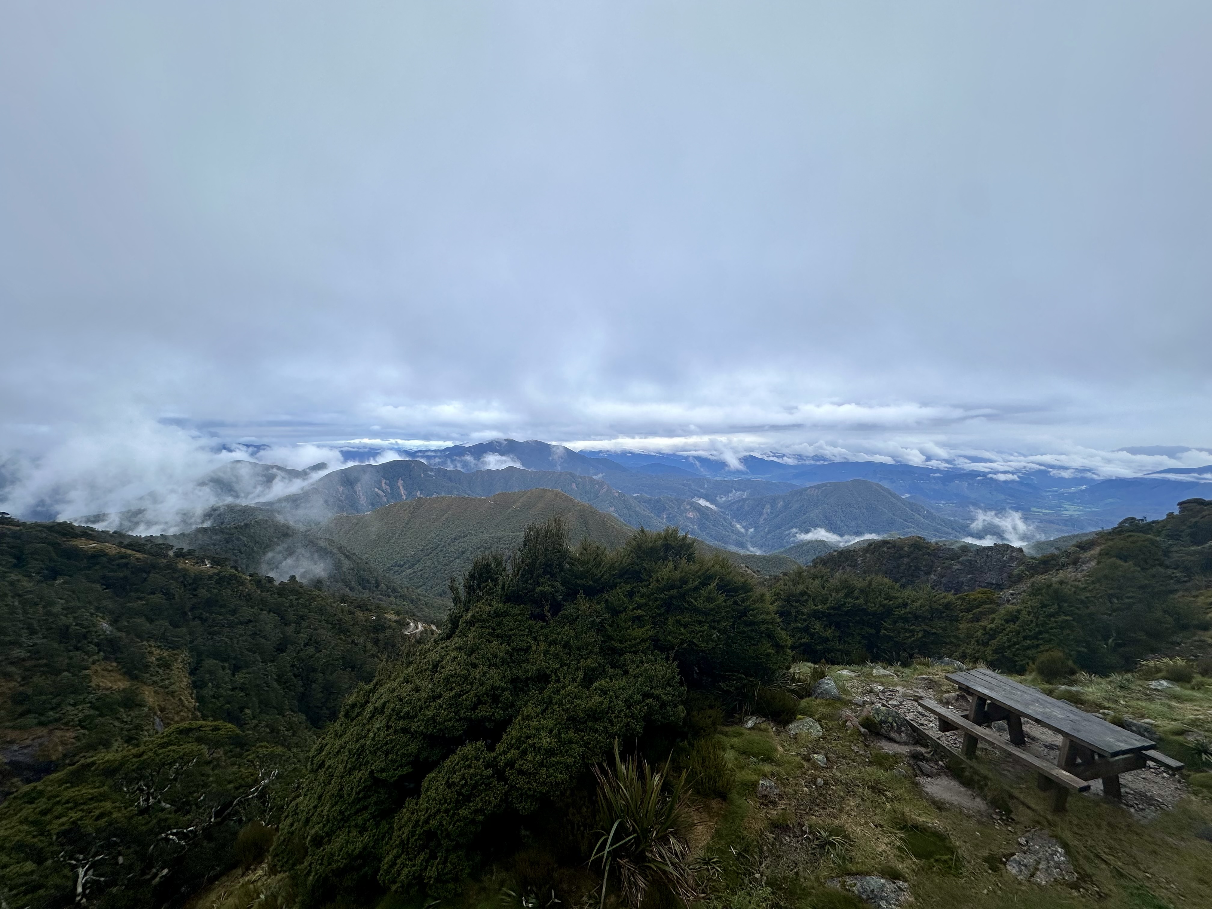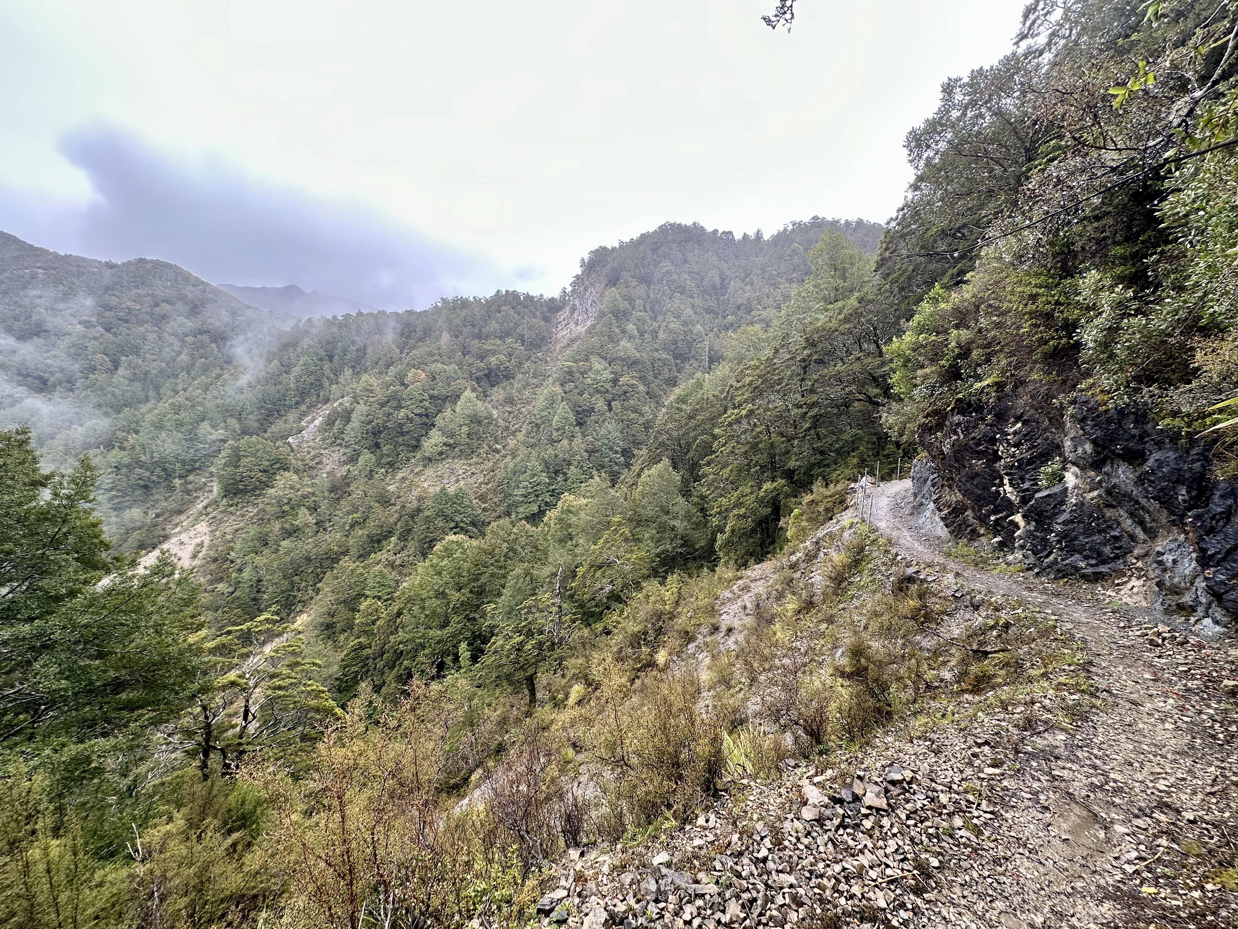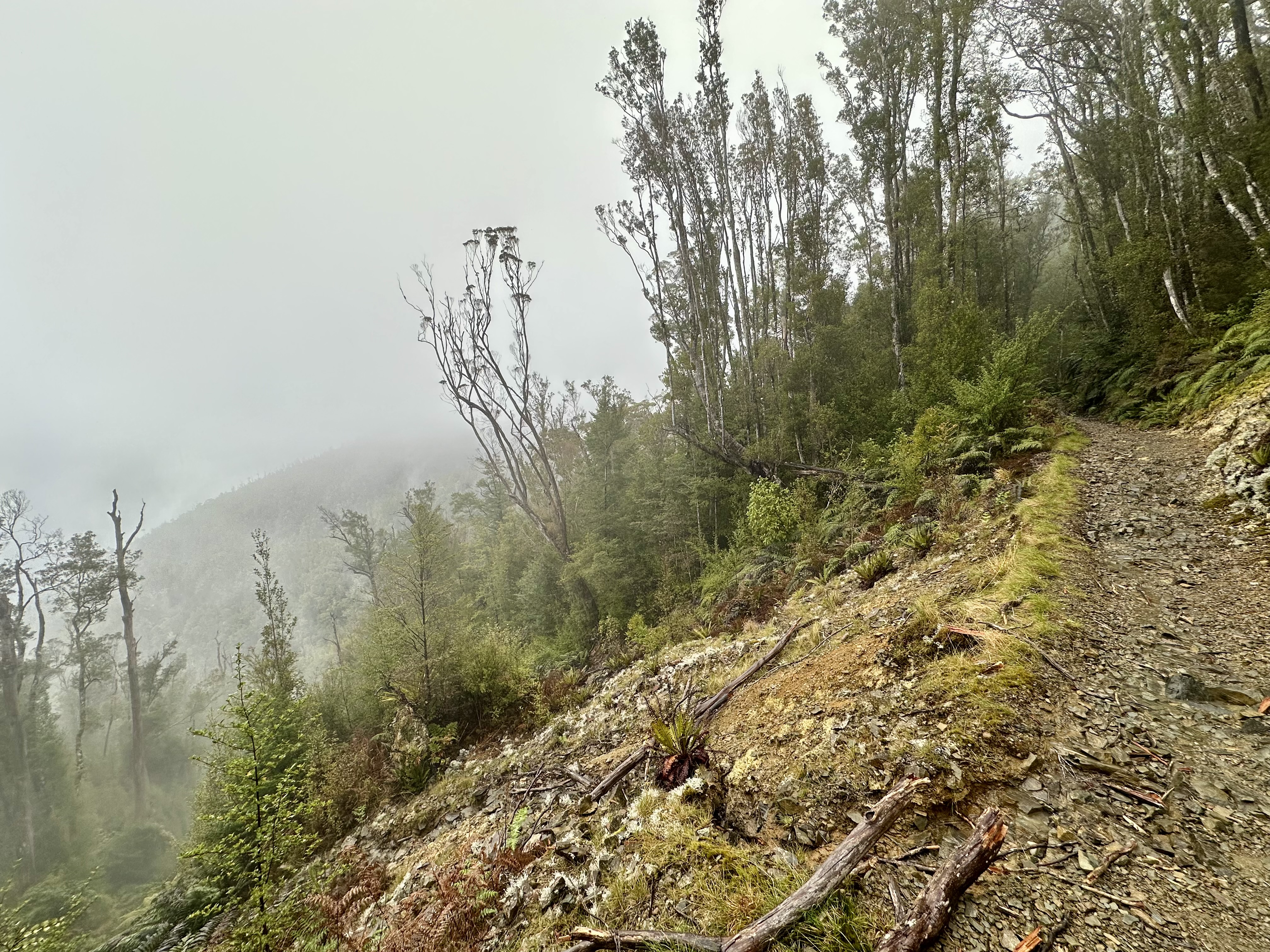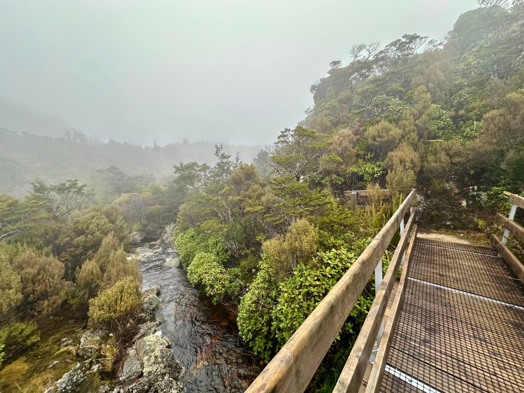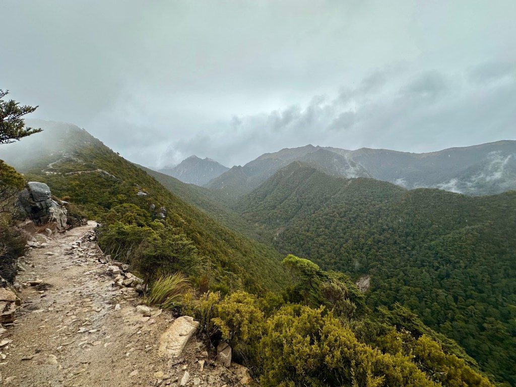 Soon after starting on the track it became quite wet. All day. The views were still pretty good, and there was some shelter offered by the overhanging canopy on the climb to Perry Saddle. After that, however, it is pretty exposed.