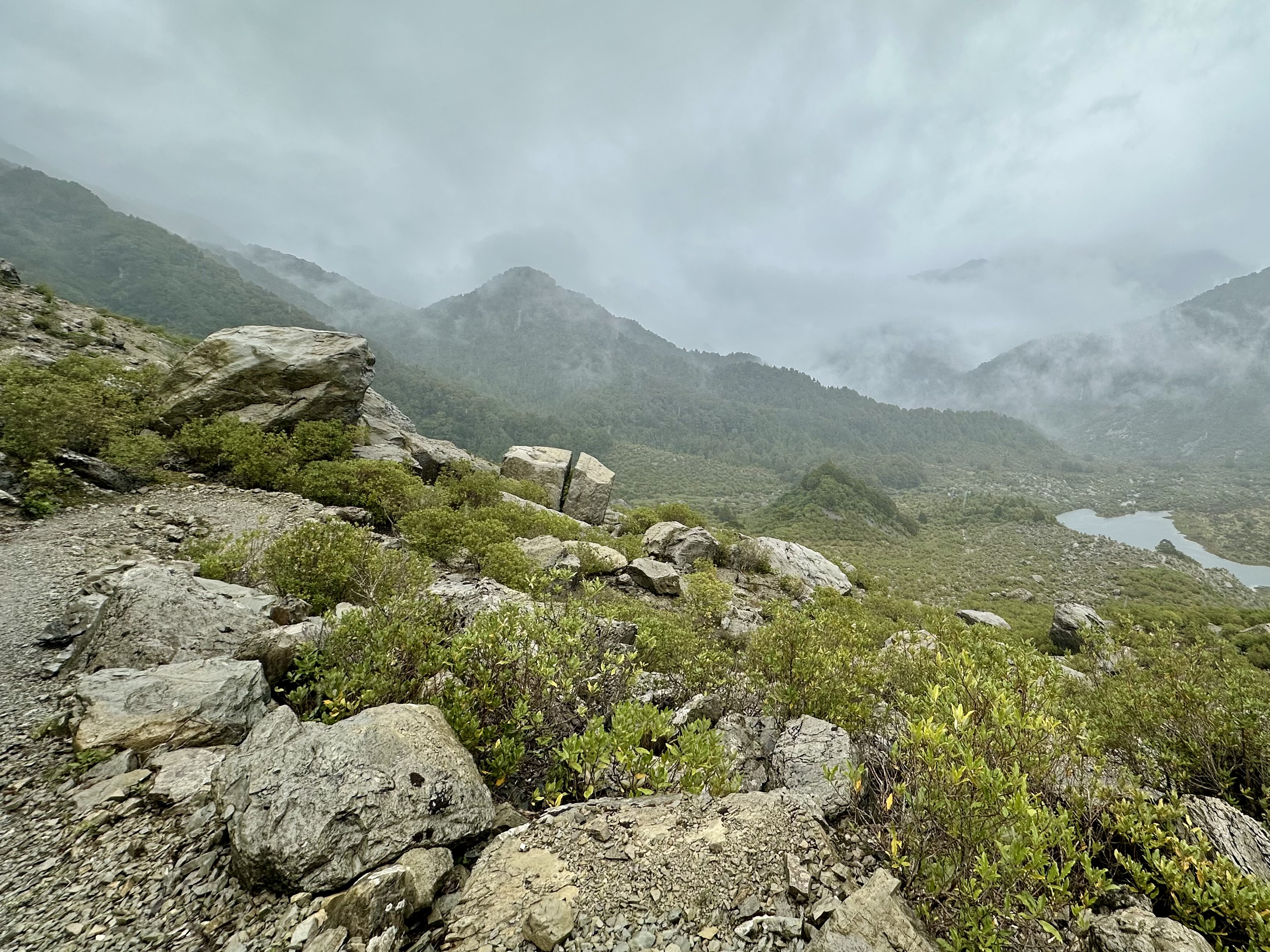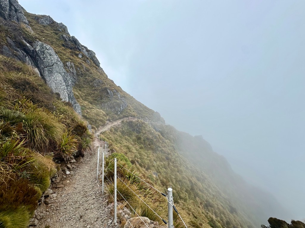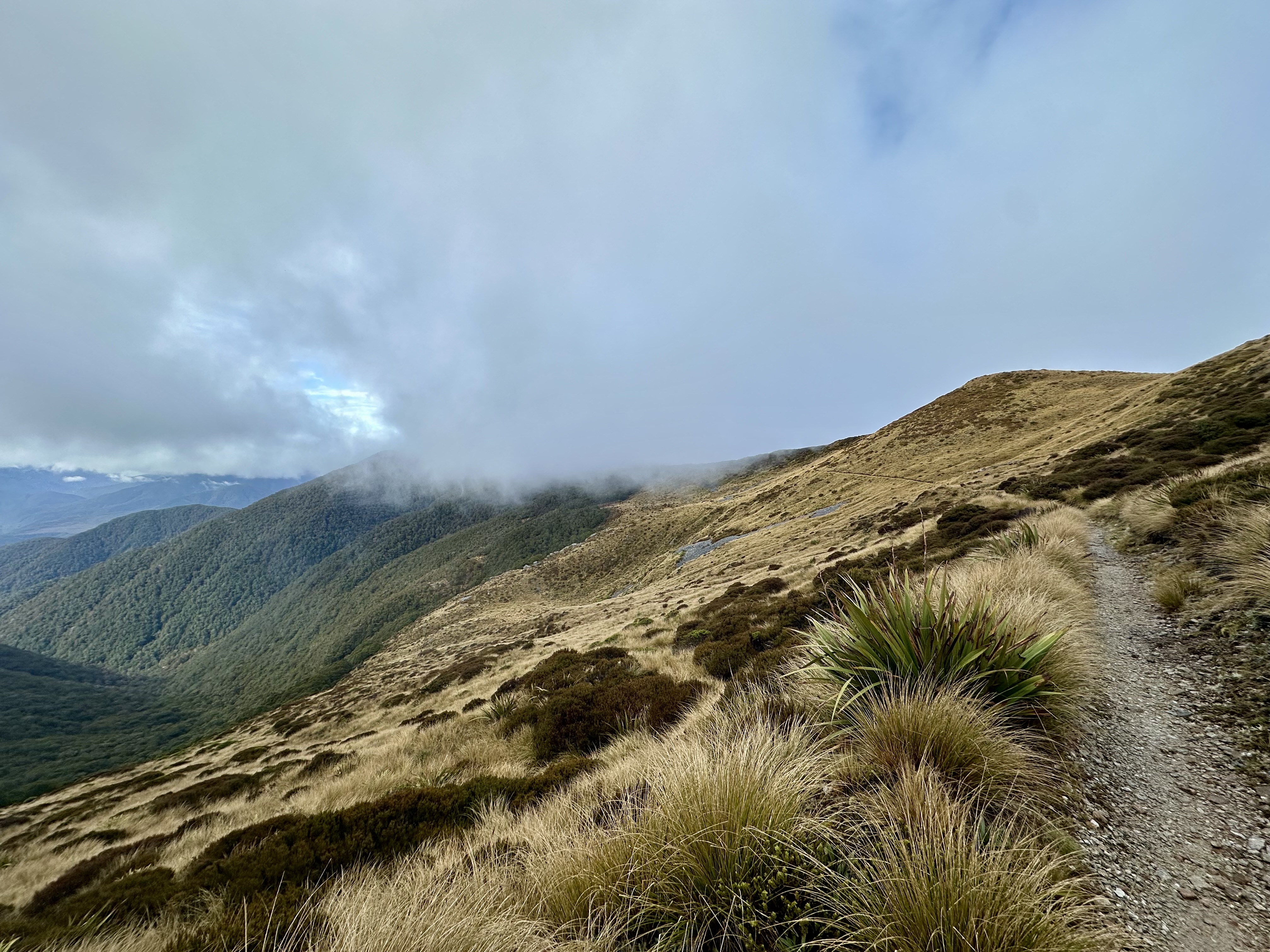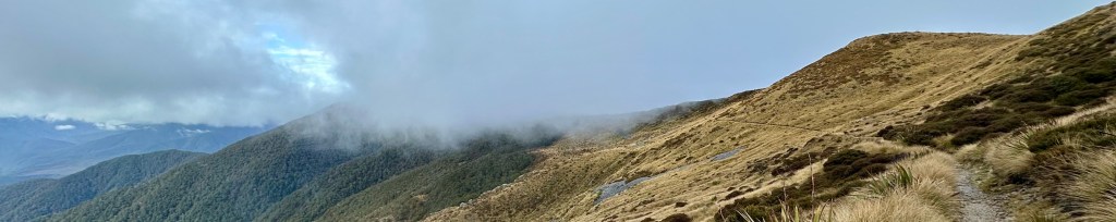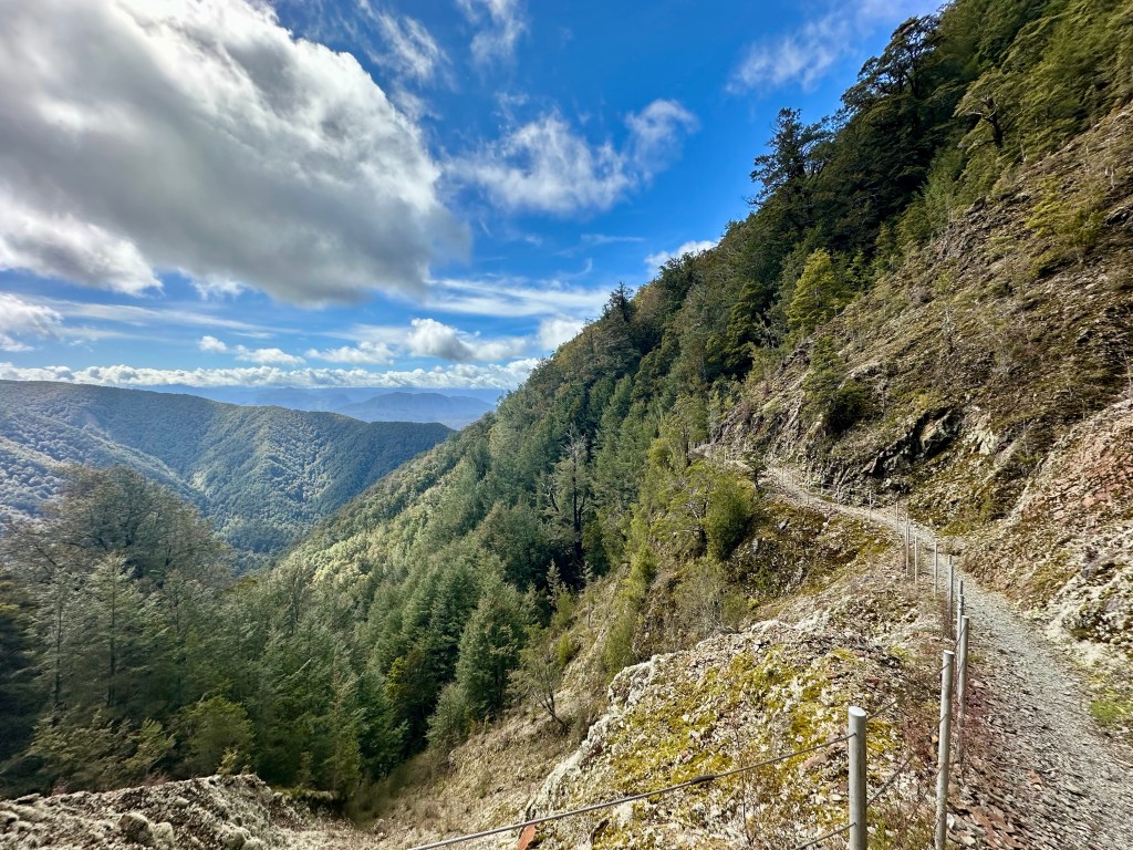 Soon after starting on the track it became quite wet. All day. The views were still pretty good, and there was some shelter offered by the overhanging canopy on the climb to Perry Saddle. After that, however, it is pretty exposed.