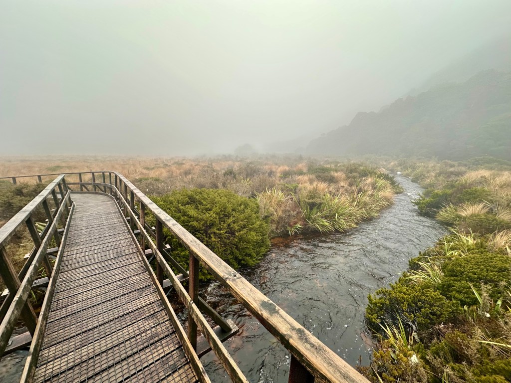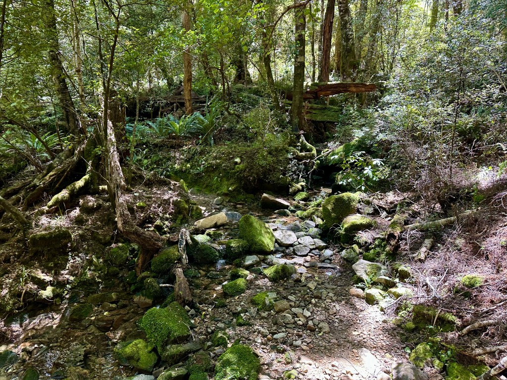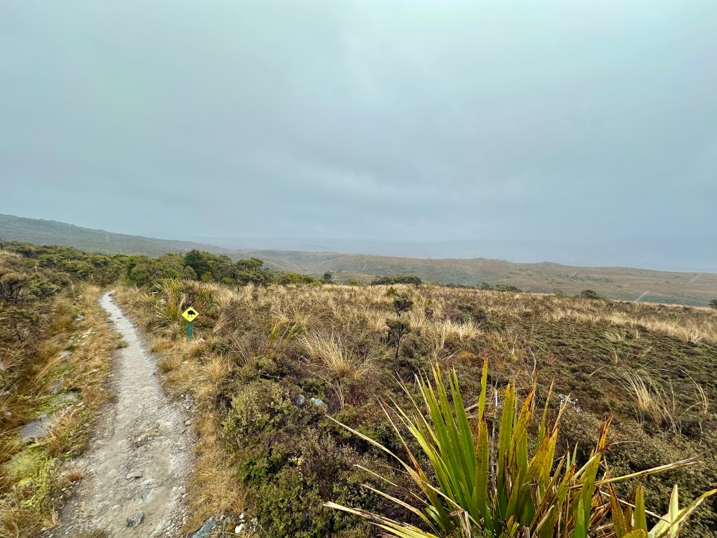 The next day the rain had cleared up. It was quite foggy in the morning but this made the crossing of Mackay Downs very atmospheric. After this is a long descent on a well maintained trail, and on reaching the bottom you can have a break at the Lewis Shelter before tackling the flatter riverside and seaside stretch to the end.