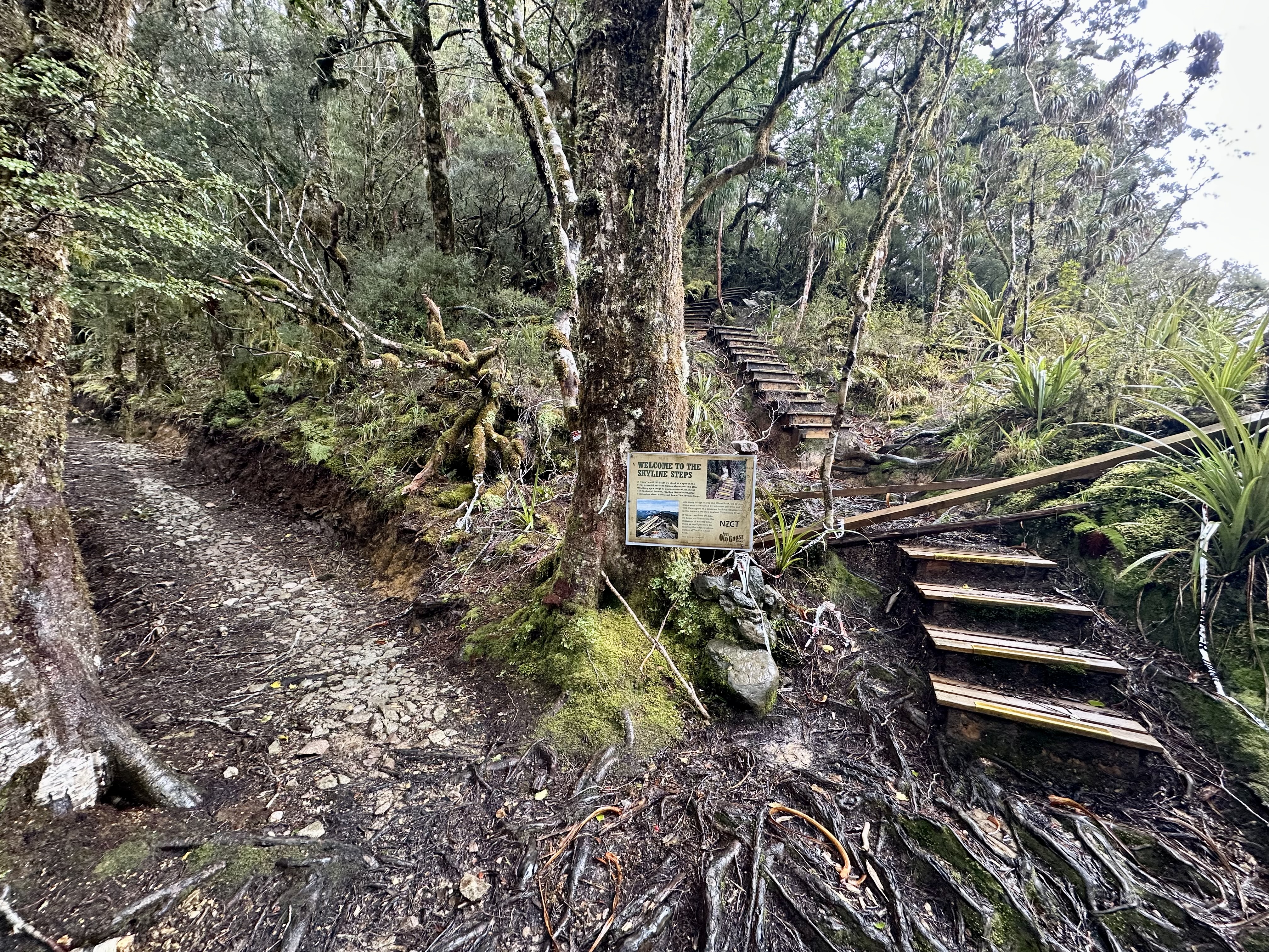 After a break at Stern Valley Hut, tackling the climb to Skyline is much more technical, and for most will have sections of hike-a-bike. This climb is one where if you were cycling the other direction you could definitely be able to stay on the bike more, although no matter which direction you take there will be some walking on and around Skyline itself. (Note: if you want to check out which part of the trail this is, the Old Ghost Road map has it marked in red for grade 4-5 trail). Thankfully you no longer need to carry your bike up Skyline steps.