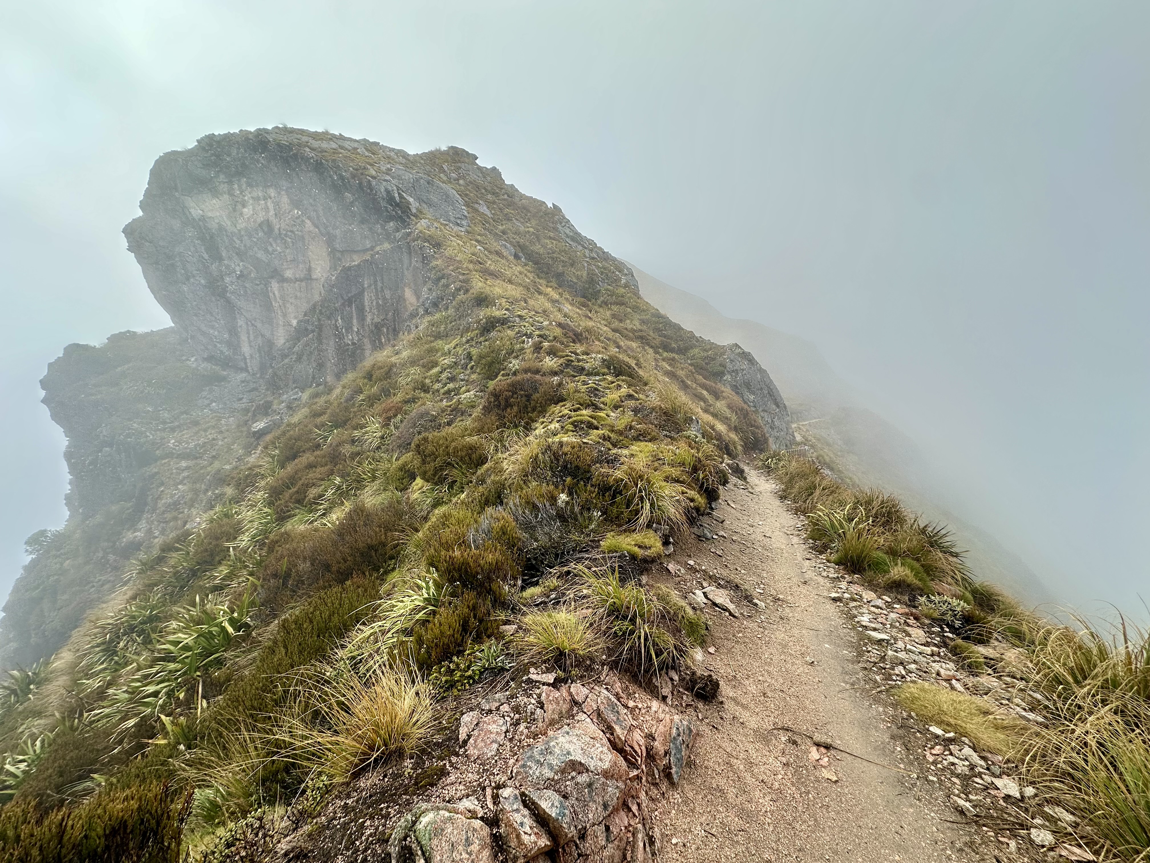 The following morning there is more of Skyline to tackle, and on a foggy morning it was quite atmospheric. It is not a part of the route I would love to do when windy, but on a still morning it was spectacular. From here the descent to Lyell is fantastic fun, including across the vertiginous Big Slips.